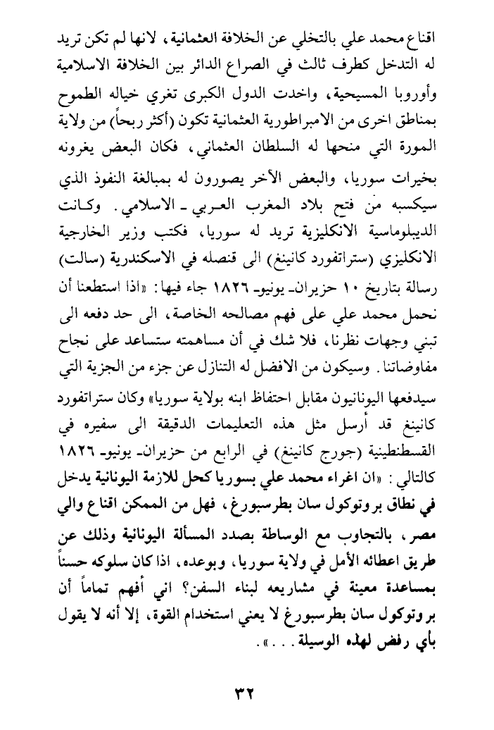 إقناع محمد علي بالتخلي عن الخلافة العثمانية، لأنها لم تكن تريد له التدخل كطرف ثالث في الصراع الدائر بين الخلافة الإسلامية وأوروبا المسيحية، وأخدت الدول الكبرى تغري خياله الطموح بمناطق أخرى من الإمبراطورية العثمانية تكون (أكثر ربحا) من ولاية المورة التي منحها له السلطان العثماني، فكان البعض يغرونه بخيرات سوريا، والبعض الآخر يصورون له بمبالغة النفوذ الذي سيكسبه من فتح بلاد المغرب العربي - الإسلامي. وكانت الديبلوماسية الإنكليزية تريد له سوريا، فكتب وزير الخارجية الإنكليزي (ستراتفورد كانينغ) إلى قنصله في الإسكندرية (سالت) رسالة بتاريخ 10 حزيران - يونيو 1826 جاء فيها: (إذا استطعنا أن نحمل محمد علي على فهم مصالحه الخاصة، إلى حد دفعه إلى تبني وجهات نظرنا، فلا شك في أن مساهمته ستساعد على نجاح مفاوضاتنا. وسيكون من الأفضل له التنازل عن جزء من الجزية التي سيدفعها اليونانيون مقابل احتفاط ابنه بولاية سوريا) وكان ستراتفورد كانيبغ قد أرسل مثل هذه التعليمات الدقيقة إلى سفيره في القسطنطينية (جورج كانينغ) في الرابع من حزيران - يونيو - 1826 كالتالي: (إن إغراء محمد علي بسوريا كحل للأزمة اليونانية يدخل في نطاق بروتوكول سان بطرسبورغ، فهل من الممكن إقناع والي مصر، بالتجاوب مع الوساطة بصدد المسألة اليونانية وذلك عن طريق إعطائه الأمل في ولاية سوريا، وبوعده، إذا كان سلوكه حسنا بمساعدة معينة في مشاريعه لبناء السفن؟ إني أفهم تماما أن بروتوكول سان بطرسبورغ لا يعني اسخدام القوة، إلا أنه لا يقول بأي رفض لهذه الوسيلة ...).