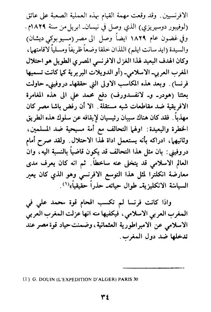 الإفرنسيين. وقد وقعت مهمة القيام بهذه العملية الصعبة على عاتق (لوفيبور دوسيريزي) الذي وصل في نيسان - أبريل من سنة 1829م. وفي غضون عام 1829 أيضا وصل إلى مصر (مسيو بوكي ديشان) والسيدة (إيد سانت إيلم) اللذان خلقا وضعا ظريفا ومسليا لإقامتهما، وكان الهدف البعيد لهذا الغزل الإفرنسي المصري الطويل هو احتلال المغرب العربي - الإسلامي - (أو الدويلات البربرية كما كانت تسميها فرنسا). وبعد هذه المكاسب الأولى التي حققها - دروفيني - حاولت بعثتا (هودر - و - لانفسدورف) دفع محمد علي إلى هذه المغامرة الإفريقية ضد مقاطعات شبه مستقلة. إلا أن رفض باشا مصر كان مهذبا. فقد كان هناك سببان رئيسيان لإيقافه عن سلوك هذه الطريق الخطرة والبعيدة: أولهما التحالف مع أمة مسيحية ضد المسلمين، وثانيها، إدراكه بأنه يستعمل أداة لهذا الاحتلال. ولقد صرح أمام دروفيني: بأن مثل هذا التحالف قد يكون قاضيا بالنسبة إليه، وأن العالم الإسلامي قد يتخلى عنه ساخطا. ثم أنه كان يعرف مدى معارضة إنكلترا لمثل هذا التوسع الإفرنسي وهو الذي كان يعير السياسة الإنكليزية - طوال حياته - حذرا حقيقيا) (¬1).