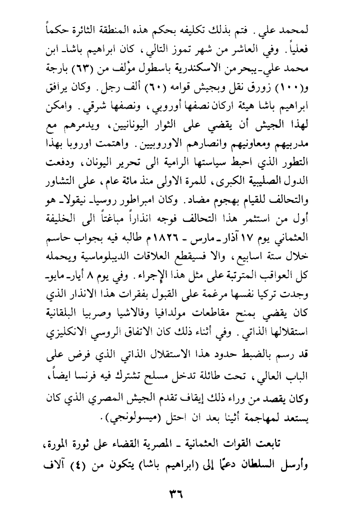 لمحمد علي. فتم بذلك تكليفه بحكم هذه المنطقة الثائرة حكما فعليا. وفي العاشر من شهر تموز التالي، كان إبراهيم باشا - ابن محمد علي - يبحر من الإسكندرية بأسطول مؤلف من (63) بارجة و (100) زورق نقل وبجيش قوامه (60) ألف رجل. وكان يرافق إبراهيم باشا هيئة أركان نصفها أوروبي، ونصفها شرقي. وأمكن لهذا الجيش أن يقضي على الثوار اليونانيين، ويدمرهم مع مدربيهم ومعاونيهم وأنصارهم الأوروبيين - واهتمت أوروبا بهذا التطور الذي أحبط سياستها الرامية إلى تحرير اليونان، ودفعت الدول الصليبية الكبرى، للمرة الأولى منذ مائة عام، على التشاور والتحالف للقيام بهجوم مضاد. وكان إمبراطور روسيا - نيقولا - هو أول من استثمر هذا التحالف فوجه إنذارا مباغتا إلى الخليفة العثماني يوم 17 آذار - مارس - 1826م طالبه فيه بجواب حاسم خلال ستة أسابيع، وإلا فسيقطع العلاقات الديبلوماسية ويحمله كل العواقب المترتبة على مثل هذا الإجراء. وفي يوم 8 أيار - مايو - وجدت تركيا نفسها مرغمة على القبول بفقرات هذا الإنذار الذي كان يقضي بمنح مقاطعات مولدافيا وفالاشيا وصربيا البلقانية استقلالها الذاتي. وفي أثناء ذلك كان الاتفاق الروسي الإنكليزي قد رسم بالضبط حدود هذا الاستقلال الذاتي الذي فرض على الباب العالي، تحت طائلة تدخل مسلح تشترك فيه فرنسا أيضا، وكان يقصد من وراء ذلك إيقاف تقدم الجيش المصري الذي كان يستعد لمهاجمة أثينا بعد أن احتل (ميسولونجي).