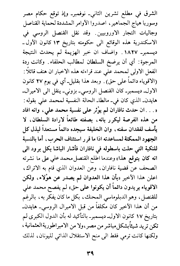الشرق في مطلع تشرين الثاني - نوفمبر - وإذ توقع حكام مصر وسوريا هياج الجماهير، أصدروا الأوامر المشددة لحماية القناصل وجاليات التجار الأوروبيين. وقد نقل القنصل الروسي في الإسكندرية هذه الوقائع إلى حكومته بتاريخ 13 كانون الأول - ديسمبر - 1827. وأضاف أن خبر الهزيمة لم يحدث النتيجة المرجوة: أي أن يرضخ السلطان لمطالب الحلفاء. وكانت ردة الفعل الأولى لمحمد علي عند قراءته هذه الأخبار أن هتف قائلا: (الأقوياء دائما على حق). وبعد هذا بقليل - أي في يوم 27 كانون الأول ديسمبر - كان القنصل الروسي - بزوني - ينقل إلى الأميرال - هايدن - الذي كان في - مالطا - الحالة النفسية لمحمد علي بقوله: (... إن حدث نافاران لم يوثر على نفسية محمد علي، وأنه أفاد من هذه الفرصة ليكرر بأنه، بصفته طائعا لإرادة السلطان، لا يأسف لفقدان سفنه، وأن الخليفة سيجده دائما مستعدا لبذل كل الجهود الممكنة لمساعدته إذا ما قرر استئناف الحرب، أما بالنسبة للنكبة التي حلت بأسطوله في نافاران فأشار الباشا بكل برود إلى أنه كان يتوقع هذا) وعندما اطلع القنصل محمد علي على ما نشرته الصحف عن قضية نافاران، وعن العدوان الذي قام به الأتراك، أعلن هذا الأخير (بأن هذا العدوان لم يصدر عن هؤلاء، ولكن الأقوياء يريدون دائما أن يكونوا على حق) لم يفصح محمد علي للقنصل، وهو الدبلوماسي المحنك، بكل ما كان يفكر به، بالرغم من أن هذا الأخير كان مكلفا من قبل الأميرال الروسي - هايدن - بتاريخ 17 كانون الأول - ديسمبر - بالتأكيد له بأن الدول الكبرى لم تكن تريد شيئا بشكل مباشر من مصر، ولا من الإمبراطورية العثمانية، ولكنها كانت ترمي فقط إلى منح الاستقلال الذاتي لليونان، لذلك