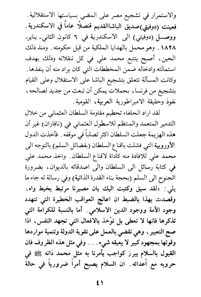 والاستمرار في تشجيع مصر على المضي بسياستها الاستقلالية. فعينت (دوفيتي) صديق الباشا القديم قنصلا عاما في الإسكندرية. ووصل (دوفيتي) إلى الإسكندرية في 6 كانون الثاني - يناير - 1828. وهو محمل بالهدايا الملكية من قبل حكومته , ومنذ ذلك الحين، أصبح يتتبع محمد علي في كل تنقلاته وذلك بهدف استمالته وإدخاله ضمن المخططات التي كان يراد منه أن ينفذها. وكانت المسألة تتعلق بتشجيع الباشا على الاستقلال وعلى القيام بتشجيع من فرنسا، بحملات يمكن أن تبعث من جديد لصالحه، نفوذ وحقيقة الإمبراطورية العربية، القومية.