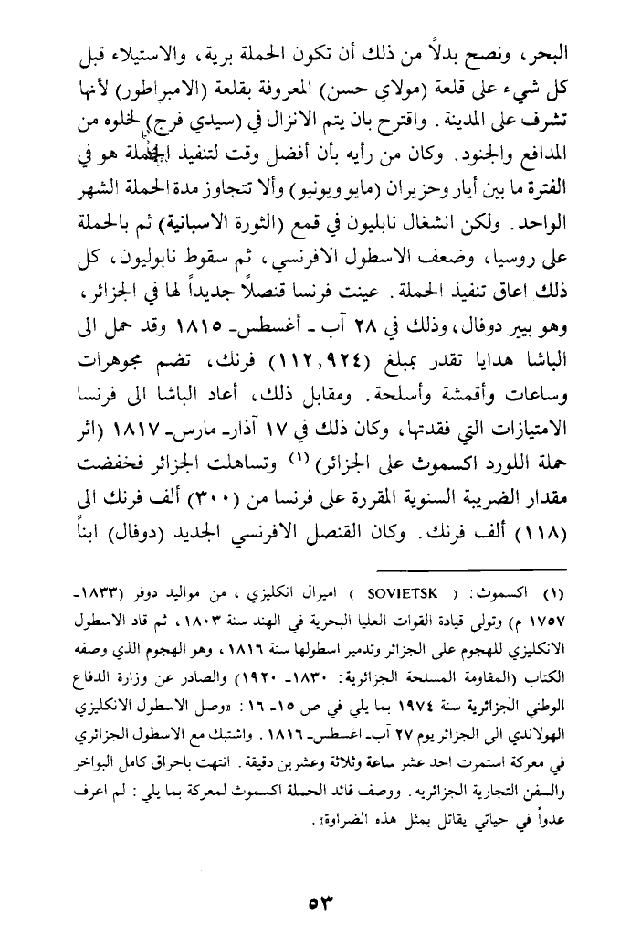 البحر، ونصح بدلا من ذلك أن تكون الحملة برية، والاستيلاء قبل كل شيء على قلعة (مولاي حسن) المعروفة بقلعة (الإمبراطور) لأنها تشرف على المدينة. واقترح بأن يتم الإنزال في (سيدي فرج) لخلوه من المدافع والجنود. وكان من رأيه بأن أفضل وقت لتنفيذ الحملة هو في الفترة ما بين أيار وحزيران (مايو ويونيو) وألا تتجاوز مدة الحملة الشهر الواحد. ولكن انشغال نابليون في قمع (الثورة الإسبانية) ثم بالحملة على روسيا، وضعف الأسطول الإفرنسي، ثم سقوط نابوليون، كل ذلك أعاق تنفيذ الحملة. عينت فرنسا قنصلا جديدا لها في الجزائر، وهو بيير دوفال، وذلك في 28 آب - أغسطس - 1815 وقد حمل إلى الباشا هدايا تقدر بمبلغ (112,924) فرنك، تضم مجوهرات وساعات وأقمشة وأسلحة. ومقابل ذلك، أعاد الباشا إلى فرنسا الامتيازات التي فقدتها، وكان ذلك في 17 آذار - مارس - 1817 (إثر حملة اللورد اكسموث على الجزائر) (¬1) وتساهلت الجزائر فخفضت مقدار الضريبة السنوية المقررة على فرنسا من (300) ألف فرنك إلى (118) ألف فرنك. وكان القنصل الإفرنسي الجديد (دوفال) ابنا
