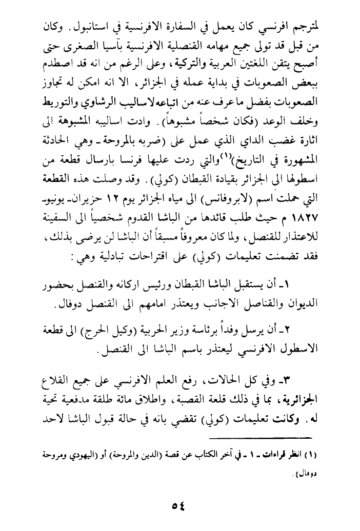 لمترجم إفرنسي كان يعمل في السفارة الإفرنسية في إستانبول. وكان من قبل قد تولى جميع مهامه القنصلية الإفرسية بآسيا الصغرى حتى أصبح يتقن اللغتين العربية والتركية، وعلى الرغم من أنه قد اصطدم ببعض الصعوبات في بداية عمله في الجزائر، إلا أنه أمكن له تجاوز الصعوبات بفضل ما عرف عنه من اتباعه لأساليب الرشاوي والتوريط وخلف الوعد (فكان شخصا مشبوها). وأدت أساليبه المشبوهة إلى إثارة غضب الداي الذي عمل على (ضربه بالمروحة - وهي الحادثة المشهورة في التاريخ) (¬1) والتي ردت عليها فرنسا بإرسال قطعة من أسطولها إلى الجزائر بقيادة القبطان (كولي). وقد وصلت هذه القطعة التي حملت اسم (لابروفانس) إلى مياه الجزائر يوم 12 حزيران - يونيو 1827 م حيث طلب قائدها من الباشا القدوم شخصيا إلى السفينة للاعتذار للقنصل، ولما كان معروفا مسبقا أن الباشا لن يرضى بذلك، فقد تضمنت تعليمات (كولي) على اقتراحات تبادلية وهي: