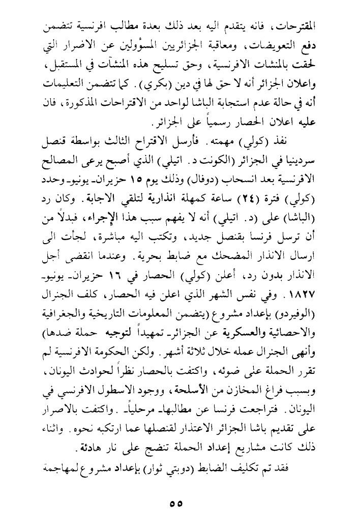 المقترحات، فإنه يتقدم إليه بعد ذلك بعدة مطالب إفرنسية تتضمن دفع التعويضات، ومعاقبة الجزائريين المسؤولين عن الأضرار التي لحقت بالمنشآت الإفرنسية، وحق تسليح هذه المنشآت في المستقبل، وإعلان الجزائر أنه لا حق لها في دين (بكري). كما تتضمن التعليمات أنه في حالة عدم استجابة الباشا لواحد من الاقتراحات المذكورة، فإن عليه إعلان الحصار رسميا على الجزائر.