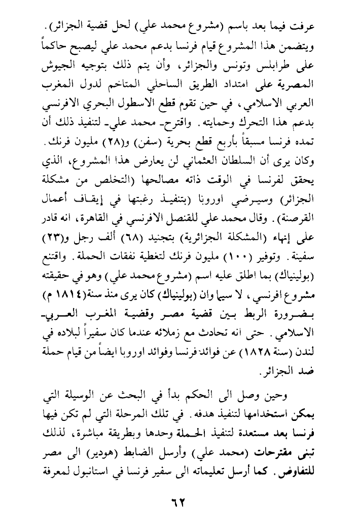 عرفت فيما بعد باسم (مشروع محمد علي) لحل قضية الجزائر). ويتضمن هذا المشروع قيام فرنسا بدعم محمد علي ليصبح حاكما على طرابلس وتونس والجزائر، وأن يتم ذلك بتوجيه الجيوش المصرية على امتداد الطريق الساحلي المتاخم لدول المغرب العربي الإسلامي، في حين تقوم قطع الأسطول البحري الإفرنسي بدعم هذا التحرك وحمايته. واقترح - محمد علي - لتنفيذ ذلك أن تمده فرنسا مسبقا بأربع قطع بحرية (سفن) و (28) مليون فرنك. وكان يرى أن السلطان العثماني لن يعارض هذا المشروع، الذي يحقق لفرنسا في الوقت ذاته مصالحها (التخلص من مشكلة الجزائر) وسيرضي أوروبا (بتنفيذ رغبتها في إيقاف أعمال القرصنة). وقال محمد علي للقنصل الإفرنسي في القاهرة، أنه قادر على إنهاء (المشكلة الجزائرية) بتجنيد (68) ألف رجل و (23) سفينة. وتوفير (100) مليون فرنك لتغطية نفقات الحملة. واقتنع (بولينياك) بما أطلق عليه اسم (مشروع محمد علي) وهو في حقيقته مشروع إفرنسي، لا سيما وأن (بولينياك) كان يرى منذ سنة (1814م) بضرورة الربط بين قضية مصر وقضية المغرب العربي - الإسلامي. حتى أنه تحادث مع زملائه عندما كان سفيرا لبلاده في لندن (سنة 1828) عن فوائد فرنسا وفوائد أوروبا أيضا من قيام حملة ضد الجزائر.