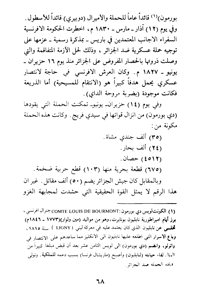 (¬1) الكونت لويس دي بورمون: COMTE LOUIS DE BOURMONT جنرال إفرنسي، برز أيام إمبراطورية نابليون بونابرت، وهو من مواليد (مين ولوار) (1773 - 1846م) تخلى عن نابليون الذي كان يعتمد عليه في معركة ليني (LIGNY) سنة 1815؛ وباع الأسرار التي اطلعه عليها نابليون إلى الإنكليز مما ساعدهم على الانتصار في واترلو، وانضم (دي بورمون) إلى لويس الثامن عشر بعد أن قبض مبلغا كبيرا من المال لقاء خيانته (لنابليون) وأصبح (ماريشال فرنسا) بسبب دعمه للملكية. وتولى قيادة الحملة ضد الجزائر.