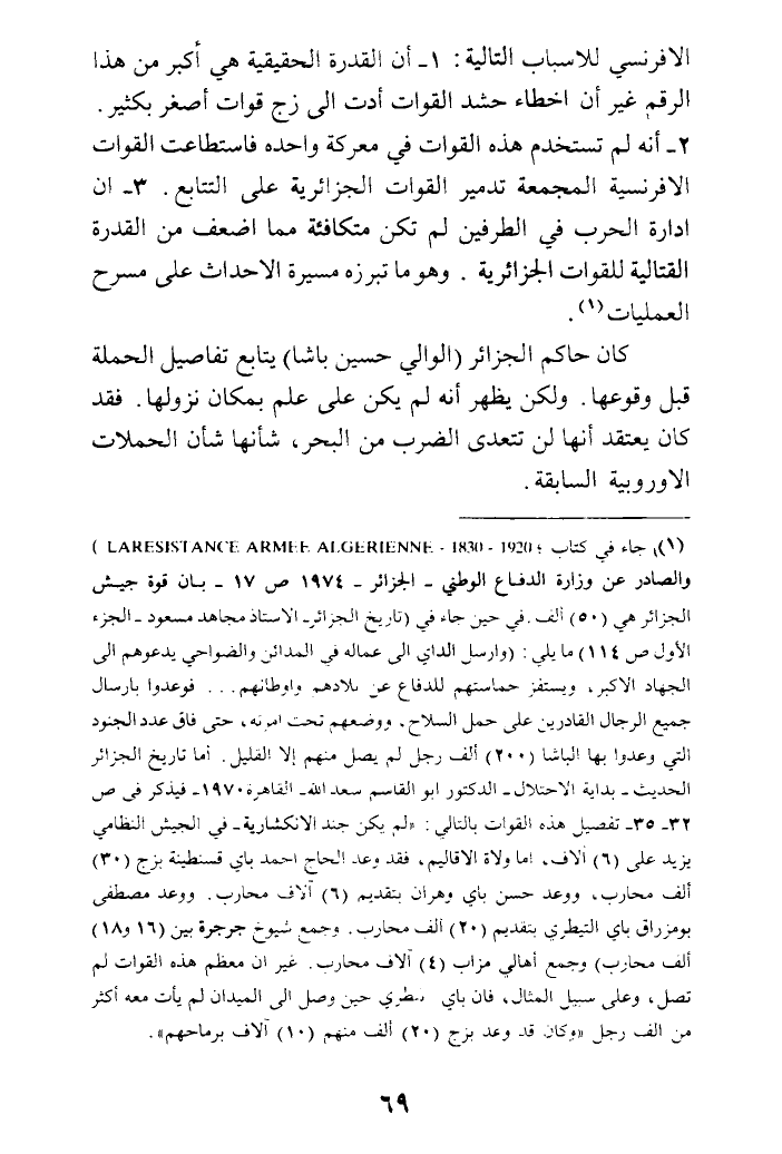 (¬1) جاء في كتاب: 1920 - 1830 - LA RESISTANCE ARMEE ALGERIENNE) والصادر عن وزارة الدفاع الوطني - الجزائر - 1974 ص 17 - بأن قوة جيش الجزائر هي (50) ألف. في حين جاء في (تاريخ الجزائر - الأستاد مجاهد مسعود - الجزء الأول ص 114) ما يلي: (وأرسل الداي إلى عماله في المدائن والضواحي يدعوهم إلى الجهاد الأكبر، ويستفز حماستهم للدفاع عن بلادهم وأوطانهم ... فوعدوا بإرسال جميع الرجال القادرين على حمل السلاح، ووضعهم تحت إمرته، حتى فاق عدد الجنود التي وعدوا بها الباشا (200) ألف رجل لم يصل منهم إلا القليل. أما تاريخ الجزائر الحديث - بدايه الاحتلال - الدكتور أبو القاسم سعد - الله - القاهرة 1970 - فيذكر في ص 32 - 35 - تفصيل هذه القوات بالتالي: (لم يكن جند الإنكشارية - في الجيش النظامي يزيد على (6) آلاف، أما ولاة الأقاليم، فقد وعد الحاج أحمد باي قسنطينة بزج (30) ألف محارب، ووعد حسن باي وهران بتقديم (6) آلآف محارب. ووعد مصطفى بومزراق باي التيطري بتقديم (20) ألف محارب. وجمع شيوخ جرجرة بين (16 و18) ألف محارب) وجمع أهالي مزاب (4) آلاف محارب. غير أن معظم هذه القوات لم تصل، وعلى سبيل المثال، فإن باي تيطري حين وصل إلى الميدان لم يأت معه أكثر من ألف رجل. (وكان قد وعد بزج (20) ألف منهم (10) آلاف برماحهم).