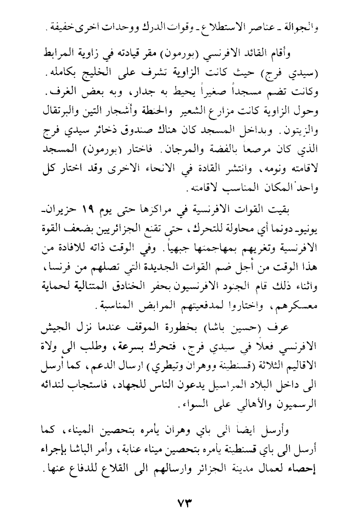 وأقام القائد الإفرنسي (بورمون) مقر قيادته في زاوية المرابط (سيدي فرج) حيث كانت الزاوية تشرف على الخليج بكامله. وكانت تضم مسجدا صغيرا يحيط به جدار، وبه بعض الغرف. وحول الزاوية كانت مزارع الشعير والحنطة وأشجار التين والبرتقال والزيتون. وبداخل المسجد كان هناك صندوق ذخائر سيدي فرج الذي كان مرصعا بالفضة والمرجان. فاختار (بورمون) المسجد لإقامته ونومه، وانتشر القادة في الأنحاء الأخرى وقد اختار كل واحد المكان المناسب لإقامته.