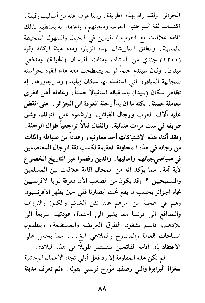 الجزائر. ولقد أراد بهذه الطريقة، وبما عرف عنه من أساليب رقيقة، اكتساب ثقة المواطنين العرب ومحبتهم، واعتقد أنه يستطيع بذلك إقامة علاقات مع العرب المقيمين في الجبال والسهول المحيطة بالمدينة. وانطلق الماريشال لهذه الزيارة ومعه هيئة أركانه وقوة (1200) جندي من المشاة، ومئات الفرسان (الخيالة) ومدفعي ميدان. وكان سيندم حتما لو لم يصطحب معه هذه القوة لحراسته لمجابهة المبادرة التي استقبله بها سكان (بليدا) وما يجاورها. إذ تظاهر سكان (بليدا) باستقباله استقبالا حسنا، وعامله أهل القرى معاملة حسنة، لكنه ما أن بدأ رحلة العودة إلى الجزائر، حتى انقض عليه آلاف العرب ورجال القبائل، وأرغموه على التوقف وشق طريقه في ست مرات متتالية، والقتال قتالا تراجعيا طوال الرحلة. وفقد أثناء هذه الاشتباكات أحد معاونيه، وعددا من ضباطه والمئات من رجاله في هذه المحاولة العقيمة لكسب ثقة الرجال المعتصمين في صياصي جبالهم وأعاليها. والذين رفضوا عبر التاريخ الخضوع لأية أمة. مما يؤكد أنه من المحال إقامة علاقات بين المسلمين والمسيحيين؟ وقد يكون من الصعب الآن معرفة نوايا الإفرنسيين تجاه الجزائر بحسب ما يقع تحت أبصارنا ففي حين يظهر الإفرنسيون وهم في عجلة من أمرهم عند نقل الغنائم والكنوز والثروات والمدافع إلى فرنسا مما يشير إلى احتمال عودتهم سريعا إلى بلادهم، فإنهم يشقون الطرق العريضة والمستقيمة، وينظمون الساحات العامة والمسارح والملاهي الخ ... مما يحمل على الاعتقاد بأن إقامة الفاتحين ستستمر طويلا في هذه البلاد).
