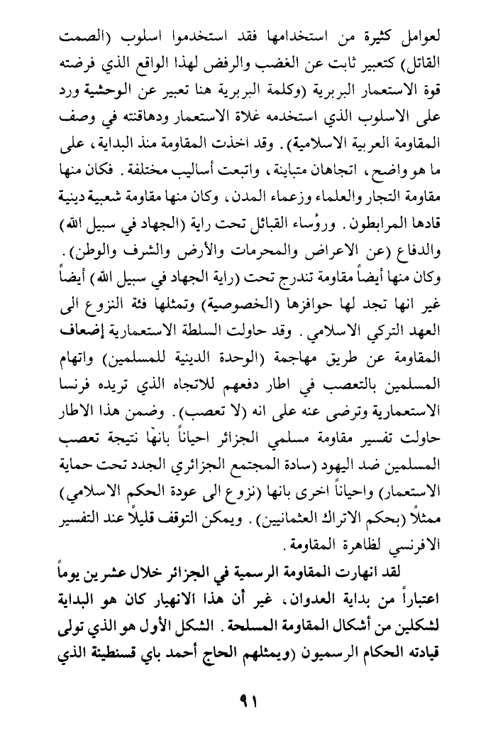 لعوامل كثيرة من استخدامها فقد استخدموا أسلوب (الصمت القاتل) كتعبير ثابت عن الغضب والرفض لهذا الواقع الذي فرضته قوة الاستعمار البربرية (وكلمة البربرية هنا تعبير عن الوحشية ورد على الأسلوب الذي استخدمه غلاة الاستعمار ودهاقنته في وصف المقاومة العربية الإسلامية). وقد أخذت المقاومة منذ البداية، على ما هو واضح، اتجاهان متباينة، واتبعت أساليب مختلفة. فكان منها مقاومة التجار والعلماء وزعماء المدن، وكان منها مقاومة شعبية دينية قادها المرابطون. ورؤساء القبائل تحت راية (الجهاد في سبيل الله) والدفاع (عن الأعراض والمحرمات والأرض والشرف والوطن). وكان منها أيضا مقاومة تندرج تحت (راية الجهاد في سبيل الله) أيضا غير أنها تجد لها حوافزها (الخصوصية) وتمثلها فئة النزوع إلى العهد التركي الإسلامي. وقد حاولت السلطة الاستعمارية إضعاف المقاومة عن طريق مهاجمة (الوحدة الدينية للمسلمين) واتهام المسلمين بالتعصب في إطار دفعهم للاتجاه الذي تريده فرنسا الاستعمارية وترضى عنه على أنه (لا تعصب). وضمن هذا الإطار حاولت تفسير مقاومة معلمي الجزائر أحيانا بأنها نتيجة تعصب المسلمين ضد اليهود (سادة المجتمع الجزائري الجدد تحت حماية الاستعمار) وأحيانا أخرى بأنها (نزوع إلى عودة الحكم الإسلامي) ممثلا (بحكم الأتراك العثمانيين). ويمكن التوقف قليلا عند التفسير الإفرنسي لظاهرة المقاومة.
