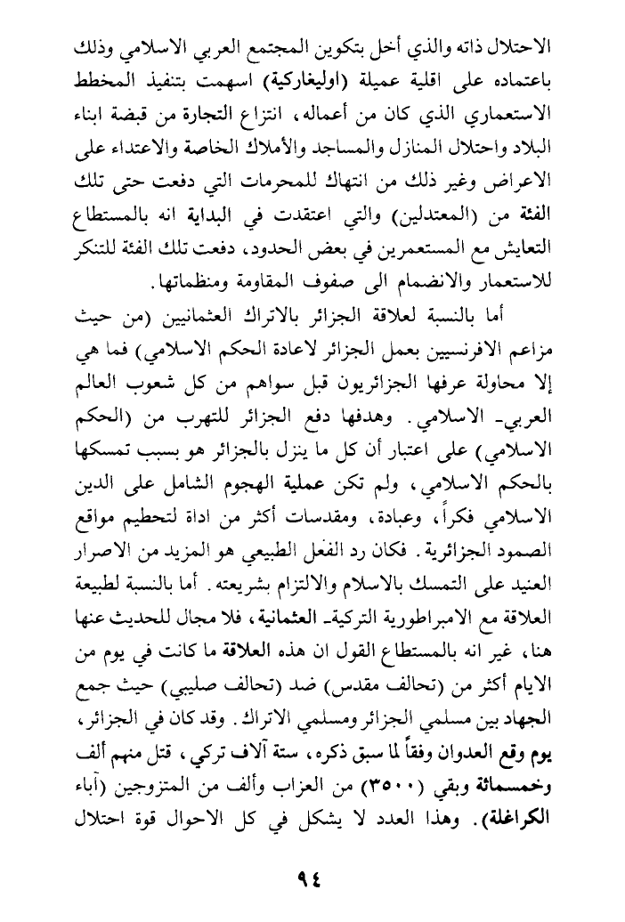 أما بالنسبة لعلاقة الجزائر بالأتراك العثمانيين (من حيث مزاعم الإفرنسيين بعمل الجزائر لإعادة الحكم الإسلامي) فما هي إلا محاولة عرفها الجزائريون قبل سواهم من كل شعوب العالم العربي - الإسلامي. وهدفها دفع الجزائر للتهرب من (الحكم الإسلامي) على اعتبار أن كل ما ينزل بالجزائر هو بسبب تمسكها بالحكم الإسلامي، ولم تكن عملية الهجوم الشامل على الدين الإسلامي فكرا، وعبادة، ومقدسات أكثر من أداة لتحطيم مواقع الصمود الجزائرية. فكان رد الفعل الطبيعي هو المزيد من الإصرار العنيد على التمسك بالإسلام والالتزام بشريعته. أما بالنسبة لطبيعة العلاقة مع الإمبراطورية التركية - العثمانية، فلا مجال للحديث عنها هنا، غير أنه بالمستطاع القول أن هذه العلاقة ما كانت في يوم من الأيام أكثر من (تحالف مقدس) ضد (تحالف صليبي) حيث جمع الجهاد بين مسلمي الجزائر ومسلمي الأتراك. وقد كان في الجزائر، يوم وقع العدوان وفقا لما سبق ذكره، ستة آلاف تركي، قتل منهم ألف وخمسمائة وبقي (3500) من العزاب وألف من المتزوجين (آباء الكراغلة). وهذا العدد لا يشكل في كل الأحوال قوة احتلال