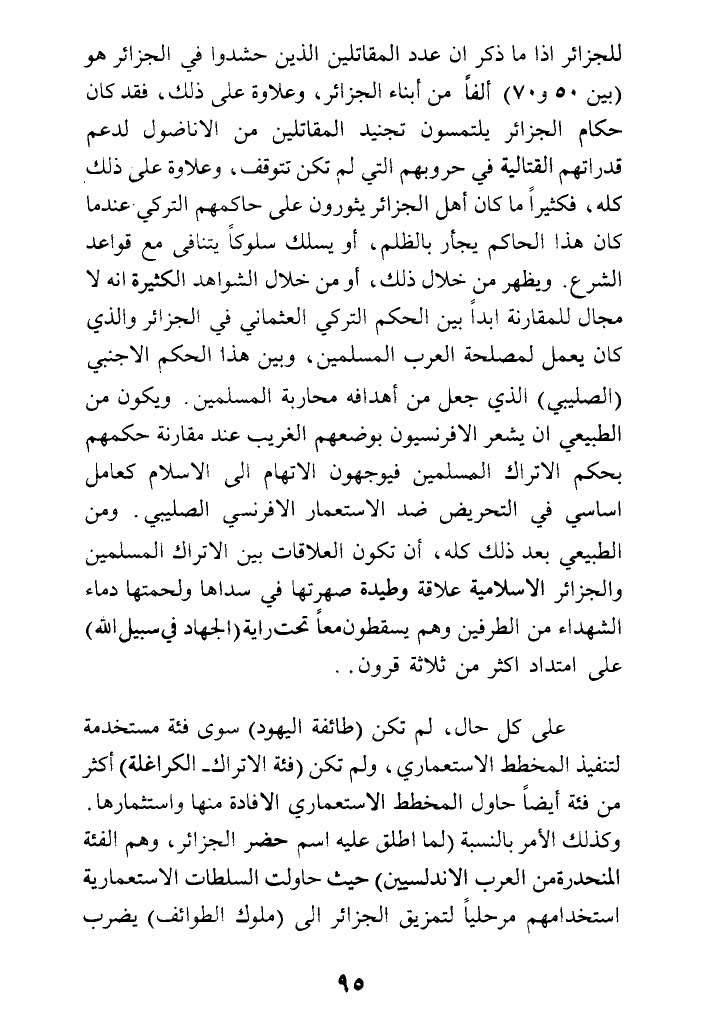 للجزائر إذا ما ذكر أن عدد المقاتلين الذين حشدوا في الجزائر هو (بين 50 و70) ألفا. من أبناء الجزائر، وعلاوة على ذلك، فقد كان حكام الجزائر يلتمسون تجنيد المقاتلين من الأناصول لدعم قدراتهم القتالية في حروبهم التي لم تكن تتوقف، وعلاوة على ذلك كله، فكثيرا ما كان أهل الجزائر يثورون على حاكمهم التركي عندما كان هذا الحاكم يجأر بالظلم، أو يسلك سلوكا يتنافى مع قواعد الشرع. ويظهر من خلال ذلك، أو من خلال الشواهد الكثيرة أنه لا مجال للمقارنة أبدا بين الحكم التركي العثماني في الجزائر والذي كان يعمل لمصلحة العرب المسلمين، وبين هذا الحكم الأجنبي (الصليبي) الذي جعل من أهدافه محاربة المسلمين. ويكون من الطبيعي أن يشعر الإفرنسيون بوضععهم الغريب عند مقارنة حكمهم بحكم الأتراك المسلمين فيوجهون الاتهام إلى الإسلام كعامل أساسي في التحريض ضد الاستعمار الإفرنسي الصليبي. ومن الطبيعي بعد ذلك كله، أن تكون العلاقات بين الأتراك المسلمين والجزائر الإسلامية علاقة وطيدة صهرتها في سداها ولحمتها دماء الشهداء من الطرفين وهم يسقطون معا تحت راية (الجهاد في سبيل الله) على امتداد أكثر من ثلاثة قرون ..