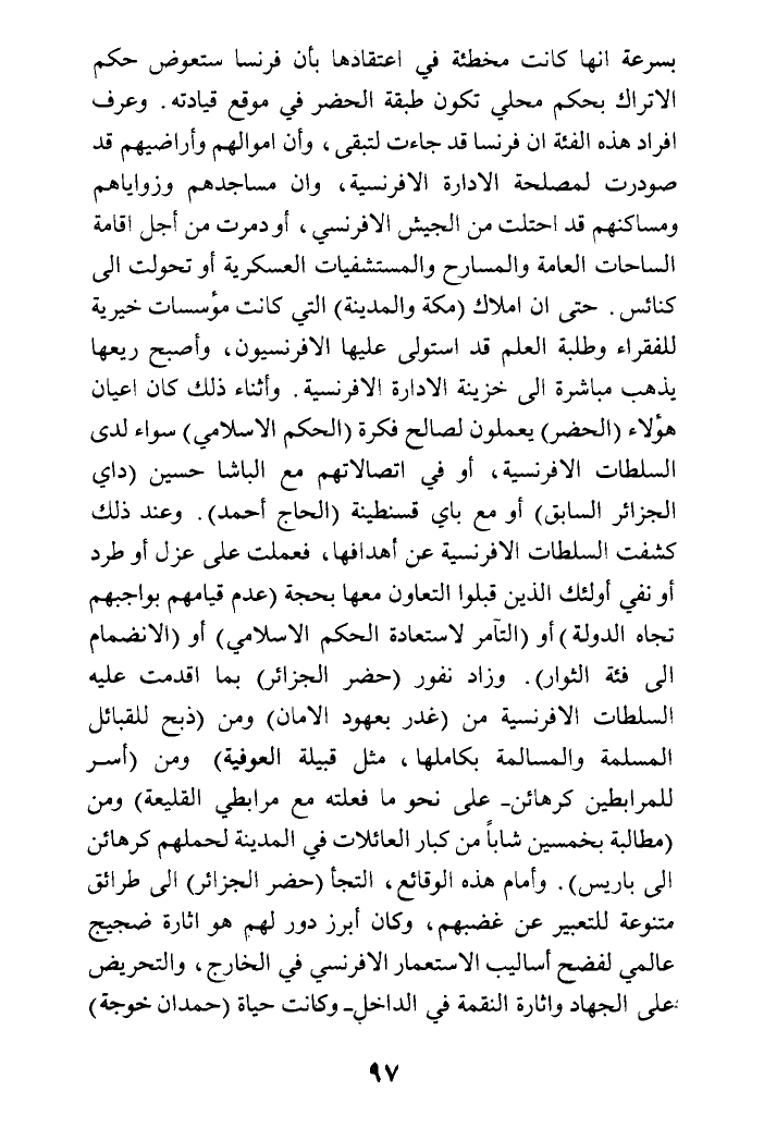 بسرعة أنها كانت مخطئة في اعتقادها بأن فرنسا ستعوض حكم الأتراك بحكم محلي تكون طبقة الحضر في موقع قيادته. وعرف أفراد هذه الفئة أن فرنسا قد جاءت لتبقى، وأن أموالهم وأراضيهم قد صودرت لمصلحة الإدارة الإفرنسية، وأن مساجدهم وزواياهم ومساكنهم قد احتلت من الجيش الإفرنسي، أو دمرت من أجل إقامة الساحات العامة والمسارح والمستشفيات العسكرية أو تحولت إلى كنائس. حتى أن أملاك (مكة والمدينة) التي كانت مؤسسات خيرية للفقراء وطلبة العلم قد استولى عليها الإفرنسيون، وأصبح ريعها يذهب مباشرة إلى خزينة الإدارة الإفرنسية. وأثناء ذلك كان أعيان هؤلاء (الحضر) يعملون لصالح فكرة (الحكم الإسلامي) سواء لدى السلطات الإفرنسية، أو في اتصالاتهم مع الباشا حسين (داي الجزائر السابق) أو مع باي قسنطينة (الحاج أحمد). وعند ذلك كشفت السلطات الإفرنسية عن أهدافها، فعملت على عزل أو طرد أو نفي أولئك الذين قبلوا التعاون معها بحجة (عدم قيامهم بواجبهم تجاه الدولة) أو (التآمر لاستعادة الحكم الإسلامي) أو (الانضمام إلى فئة الثوار). وزاد نفور (حضر الجزائر) بما أقدمت عليه السلطات الإفرنسية من (غدر بعهود الأمان) ومن (ذبح للقبائل المسلمة والمسالمة بكاملها، مثل قبيلة العوفية) ومن (أسر للمرابطين كرهائن - على نحو ما فعلته مع مرابطي القليعة) ومن (مطالبة بخمسين شابا من كبار العائلات في المدينة لحملهم كرهائن إلى باريس). وأمام هذه الوقاقع، التجأ (حضر الجزائر) إلى طرائق متنوعة للتعبير عن غضبهم، وكان أبرز دور لهم هو إثارة ضجيج عالمي لفضح أساليب الاستعمار الإفرنسي في الخارج، والتحريض على الجهاد وإثارة النقمة في الداخل - وكانت حياة (حمدان خوجة)