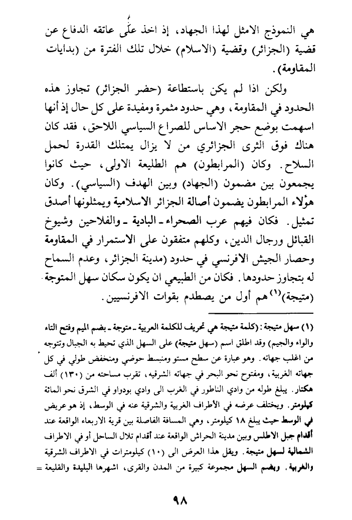 ولكن إذا لم يكن باستطاعة (حضر الجزائر) تجاوز هذه الحدود في المقاومة، وهي حدود مثمرة ومفيدة على كل حال إذ أنها أسهمت بوضع حجر الأساس للصراع السياسي اللاحق، فقد كان هناك فوق الثرى الجزائري من لا يزال يمتلك القدرة لحمل السلاح. وكان (المرابطون) هم الطليعة الأولى، حيث كانوا يجمعون بين مضمون (الجهاد) وبين الهدف (السياسي). وكان هؤلاء المرابطون يضمون أصالة الجزائر الإسلامية ويمثلونها أصدق تمثيل. فكان فيهم عرب الصحراء - البادية - والفلاحين وشيوخ القبائل ورجال الدين، وكلهم متفقون على الاستمرار في المقاومة وحصار الجيش الإفرنسي في حدود (مدينة الجزائر، وعدم السماح له بتجاوز حدودها. فكان من الطبيعي أن يكون سكان سهل المتوجة - (متيجة) (¬1) هم أول من يصطدم بقوات الإفرنسيين.