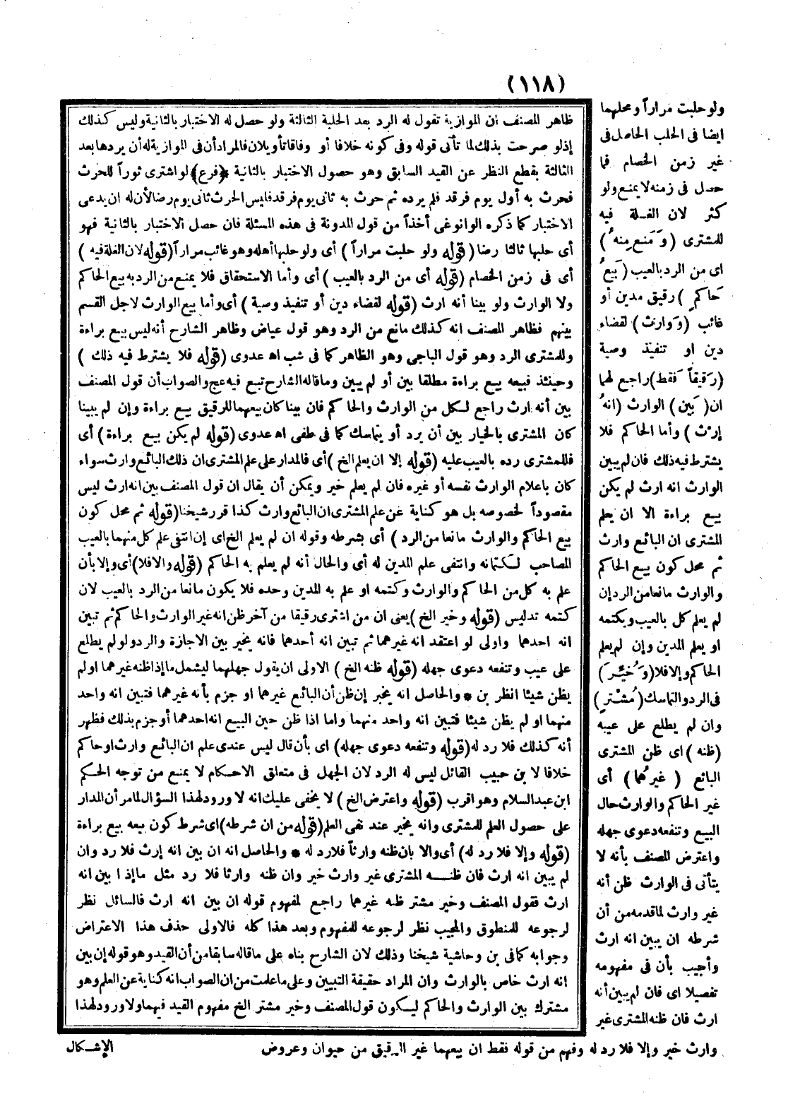 ـــــــــــــــــــــــــــــQظَاهِرُ الْمُصَنِّفِ أَنَّ الْمَوَّازِيَّةَ تَقُولُ لَهُ الرَّدُّ بَعْدَ الْحَلْبَةِ الثَّالِثَةِ، وَلَوْ حَصَلَ لَهُ الِاخْتِبَارُ بِالثَّانِيَةِ وَلَيْسَ كَذَلِكَ إذْ لَوْ صَرَّحْت بِذَلِكَ لَمَا تَأَتَّى قَوْلُهُ وَفِي كَوْنِهِ خِلَافًا، أَوْ وِفَاقًا تَأْوِيلَانِ، فَالْمُرَادُ أَنَّ فِي الْمَوَّازِيَّةِ لَهُ أَنْ يَرُدَّهَا بَعْدَ الثَّالِثَةِ بِقَطْعِ النَّظَرِ عَنْ الْقَيْدِ السَّابِقِ، وَهُوَ حُصُولُ الِاخْتِبَارِ بِالثَّانِيَةِ (فَرْعٌ) لَوْ اشْتَرَى ثَوْرًا لِلْحَرْثِ فَحَرَثَ بِهِ أَوَّلَ يَوْمٍ فَرَقَدَ فَلَمْ يَرُدَّهُ، ثُمَّ حَرَثَ بِهِ ثَانِيَ يَوْمٍ فَرَقَدَ فَلَيْسَ الْحَرْثُ ثَانِيَ يَوْمٍ رِضًا؛ لِأَنَّ لَهُ أَنْ يَدَّعِيَ الِاخْتِبَارَ كَمَا ذَكَرَهُ الْوَانُّوغِيُّ أَخْذًا مِنْ قَوْلِ الْمُدَوَّنَةِ فِي هَذِهِ الْمَسْأَلَةِ، فَإِنْ حَصَلَ الِاخْتِبَارُ بِالثَّانِيَةِ فَهُوَ أَيْ حَلْبُهَا ثَالِثًا رِضًا (قَوْلُهُ، وَلَوْ حُلِبَتْ مِرَارًا) أَيْ، وَلَوْ حَلَبَهَا أَهْلُهُ، وَهُوَ غَائِبٌ مِرَارًا (قَوْلُهُ؛ لِأَنَّ الْغَلَّةَ فِيهِ) أَيْ فِي زَمَنِ الْخِصَامِ (قَوْلُهُ أَيْ مِنْ الرَّدِّ بِالْعَيْبِ) أَيْ، وَأَمَّا الِاسْتِحْقَاقُ فَلَا يَمْنَعُ مِنْ الرَّدِّ بِهِ بَيْعُ الْحَاكِمِ وَلَا الْوَارِثِ، وَلَوْ بَيَّنَّا أَنَّهُ إرْثٌ (قَوْلُهُ لِقَضَاءِ دَيْنٍ، أَوْ تَنْفِيذِ وَصِيَّةٍ) أَيْ، وَأَمَّا بَيْعُ الْوَارِثِ لِأَجْلِ الْقَسْمِ بَيْنَهُمْ فَظَاهِرُ الْمُصَنِّفِ أَنَّهُ كَذَلِكَ مَانِعٌ مِنْ الرَّدِّ، وَهُوَ قَوْلُ عِيَاضٍ وَظَاهِرُ الشَّارِحِ أَنَّهُ لَيْسَ بَيْعُ بَرَاءَةٍ وَلِلْمُشْتَرِي الرَّدُّ، وَهُوَ قَوْلُ الْبَاجِيَّ، وَهُوَ الظَّاهِرُ كَمَا فِي شب اهـ. عَدَوِيٌّ (قَوْلُهُ فَلَا يُشْتَرَطُ فِيهِ ذَلِكَ) وَحِينَئِذٍ فَبَيْعُهُ بَيْعُ بَرَاءَةٍ مُطْلَقًا بَيَّنَ، أَوْ لَمْ يُبَيِّنْ وَمَا قَالَهُ الشَّارِحُ تَبِعَ فِيهِ عج وَالصَّوَابُ أَنَّ قَوْلَ الْمُصَنِّفِ بَيَّنَ أَنَّهُ إرْثٌ رَاجِعٌ لِكُلٍّ مِنْ الْوَارِثِ وَالْحَاكِمِ، فَإِنْ بَيَّنَا كَانَ بَيْعُهُمَا لِلرَّقِيقِ بَيْعَ بَرَاءَةٍ، وَإِنْ لَمْ يُبَيِّنَا كَانَ الْمُشْتَرِي بِالْخِيَارِ بَيْنَ أَنْ يَرُدَّ، أَوْ يَتَمَاسَكَ كَمَا فِي طفى اهـ. عَدَوِيٌّ (قَوْلُهُ لَمْ يَكُنْ بَيْعَ بَرَاءَةٍ) أَيْ فَلِلْمُشْتَرِي رَدُّهُ بِالْعَيْبِ عَلَيْهِ (قَوْلُهُ إلَّا أَنْ يَعْلَمَ إلَخْ) أَيْ فَالْمَدَارُ عَلَى عِلْمِ الْمُشْتَرِي أَنَّ ذَلِكَ الْبَائِعَ وَارِثٌ سَوَاءٌ كَانَ بِإِعْلَامِ الْوَارِثِ نَفْسِهِ، أَوْ غَيْرِهِ، فَإِنْ لَمْ يَعْلَمْ خُيِّرَ وَيُمْكِنُ أَنْ يُقَالَ إنَّ قَوْلَ الْمُصَنِّفِ بَيَّنَ أَنَّهُ إرْثٌ لَيْسَ مَقْصُودًا لِخُصُوصِهِ بَلْ هُوَ كِنَايَةٌ عَنْ عِلْمِ الْمُشْتَرِي أَنَّ الْبَائِعَ وَارِثٌ كَذَا قَرَّرَ شَيْخُنَا (قَوْلُهُ ثُمَّ مَحَلُّ كَوْنِ بَيْعِ الْحَاكِمِ وَالْوَارِثِ مَانِعًا مِنْ الرَّدِّ) أَيْ بِشَرْطِهِ وَقَوْلُهُ إنْ لَمْ يَعْلَمْ إلَخْ أَيْ إنْ انْتَفَى عِلْمُ كُلٍّ مِنْهُمَا بِالْعَيْبِ الْمُصَاحِبِ لِكِتْمَانِهِ وَانْتَفَى عِلْمُ الْمَدِينِ لَهُ أَيْ وَالْحَالُ أَنَّهُ لَمْ يَعْلَمْ بِهِ الْحَاكِمُ (قَوْلُهُ، وَإِلَّا فَلَا) أَيْ، وَإِلَّا بِأَنْ عَلِمَ بِهِ كُلٌّ مِنْ الْحَاكِمِ وَالْوَارِثِ وَكَتَمَهُ، أَوْ عَلِمَ بِهِ الْمَدِينُ وَحْدَهُ فَلَا يَكُونُ مَانِعًا مِنْ الرَّدِّ بِالْعَيْبِ؛ لِأَنَّ كَتْمَهُ تَدْلِيسٌ (قَوْلُهُ وَخُيِّرَ إلَخْ) يَعْنِي أَنَّ مَنْ اشْتَرَى رَقِيقًا مِنْ آخَرَ ظَنَّ أَنَّهُ غَيْرُ الْوَارِثِ وَالْحَاكِمُ، ثُمَّ تَبَيَّنَ أَنَّهُ أَحَدُهُمَا وَأَوْلَى لَوْ اعْتَقَ