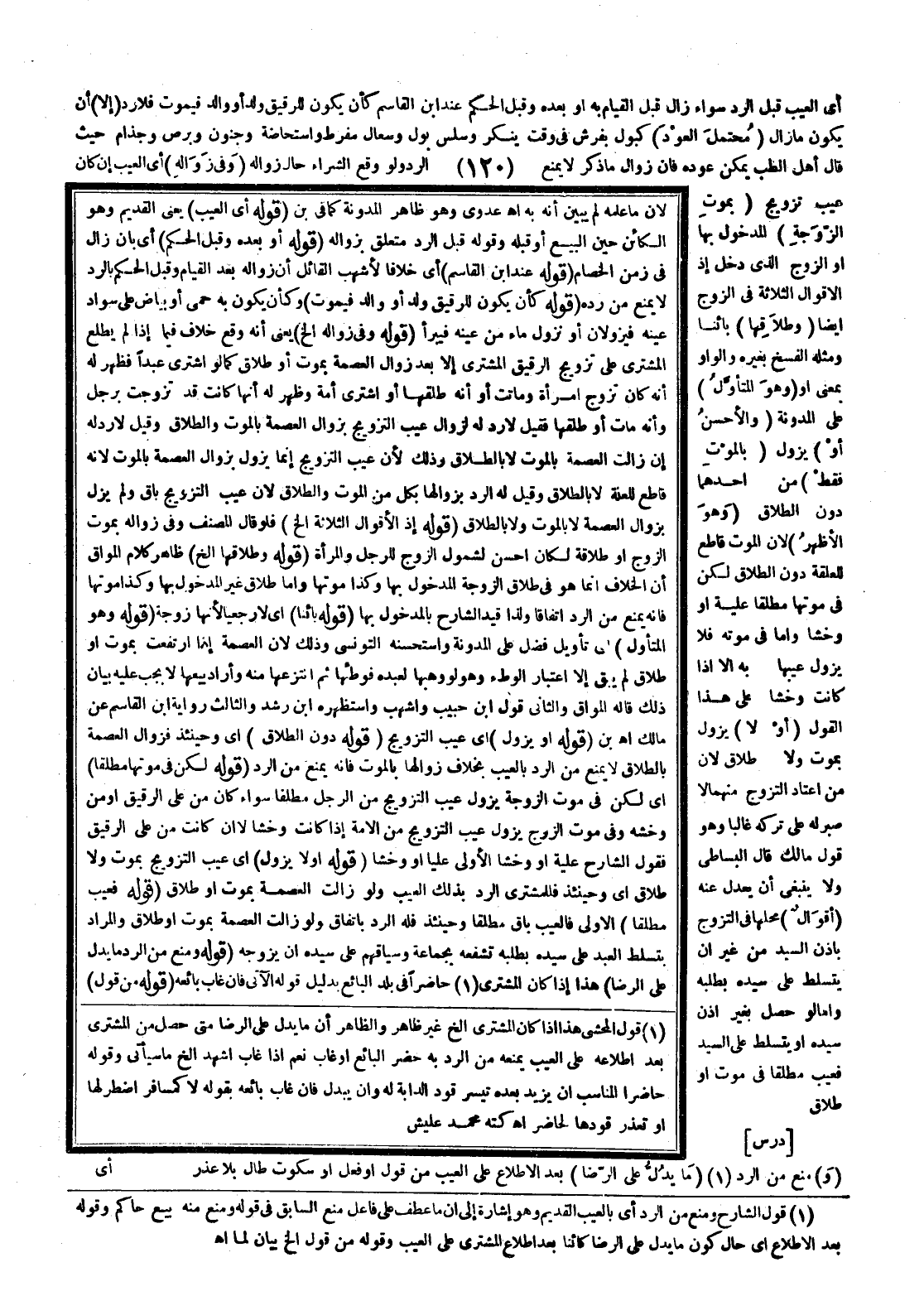 ـــــــــــــــــــــــــــــQلِأَنَّ مَا عَلِمَهُ لَمْ يُبَيِّنْ أَنَّهُ بِهِ اهـ. عَدَوِيٌّ، وَهُوَ ظَاهِرُ الْمُدَوَّنَةِ كَمَا فِي بْن (قَوْلُهُ أَيْ الْعَيْبُ) يَعْنِي الْقَدِيمَ، وَهُوَ الْكَائِنُ حِينَ الْبَيْعِ، أَوْ قَبْلَهُ وَقَوْلُهُ قَبْلَ الرَّدِّ مُتَعَلِّقٌ بِزَوَالِهِ (قَوْلُهُ، أَوْ بَعْدَهُ وَقَبْلَ الْحُكْمِ) أَيْ بِأَنْ زَالَ فِي زَمَنِ الْخِصَامِ (قَوْلُهُ عِنْدَ ابْنِ الْقَاسِمِ) أَيْ خِلَافًا لِأَشْهَبَ الْقَائِلِ: إنَّ زَوَالَهُ بَعْدَ الْقِيَامِ وَقَبْلَ الْحُكْمِ بِالرَّدِّ لَا يَمْنَعُ مِنْ رَدِّهِ (قَوْلُهُ كَأَنْ يَكُونَ لِلرَّقِيقِ وَلَدٌ، أَوْ وَالِدٌ فَيَمُوتُ) وَكَأَنْ يَكُونَ بِهِ حُمَّى، أَوْ بَيَاضٌ عَلَى سَوَادِ عَيْنِهِ فَيَزُولَانِ، أَوْ نَزَلَ مَاءٌ مِنْ عَيْنِهِ فَيَبْرَأُ (قَوْلُهُ وَفِي زَوَالِهِ إلَخْ) يَعْنِي أَنَّهُ وَقَعَ خِلَافٌ فِيمَا إذَا لَمْ يُطْلِعْ الْمُشْتَرِيَ عَلَى تَزْوِيجِ الرَّقِيقِ الْمُشْتَرَى إلَّا بَعْدَ زَوَالِ الْعِصْمَةِ بِمَوْتٍ، أَوْ طَلَاقٍ كَمَا لَوْ اشْتَرَى عَبْدًا فَظَهَرَ لَهُ أَنَّهُ كَانَ تَزَوَّجَ امْرَأَةً وَمَاتَتْ، أَوْ أَنَّهُ طَلَّقَهَا، أَوْ اشْتَرَى أَمَةً وَظَهَرَ لَهُ أَنَّهَا كَانَتْ قَدْ تَزَوَّجَتْ بِرَجُلٍ وَأَنَّهُ مَاتَ، أَوْ طَلَّقَهَا فَقِيلَ لَا رَدَّ لَهُ لِزَوَالِ عَيْبِ التَّزْوِيجِ بِزَوَالِ الْعِصْمَةِ بِالْمَوْتِ وَالطَّلَاقِ وَقِيلَ لَا رَدَّ لَهُ إنْ زَالَتْ الْعِصْمَةُ بِالْمَوْتِ لَا بِالطَّلَاقِ وَذَلِكَ؛ لِأَنَّ عَيْبَ التَّزْوِيجِ إنَّمَا يَزُولُ الْعِصْمَةُ بِالْمَوْتِ؛ لِأَنَّهُ قَاطِعٌ لِلْعِلَّةِ لَا بِالطَّلَاقِ، وَقِيلَ لَهُ الرَّدُّ بِزَوَالِهَا بِكُلٍّ مِنْ الْمَوْتِ وَالطَّلَاقِ؛ لِأَنَّ عَيْبَ التَّزْوِيجِ بَاقٍ وَلَمْ يَزُلْ بِزَوَالِ الْعِصْمَةِ لَا بِالْمَوْتِ وَلَا بِالطَّلَاقِ (قَوْلُهُ إذْ الْأَقْوَالُ الثَّلَاثَةُ إلَخْ) فَلَوْ قَالَ الْمُصَنِّفُ وَفِي زَوَالِهِ بِمَوْتِ الزَّوْجِ، أَوْ طَلَاقِهِ لَكَانَ أَحْسَنَ لِشُمُولِ الزَّوْجِ لِلرَّجُلِ وَالْمَرْأَةِ (قَوْلُهُ وَطَلَاقُهَا إلَخْ) ظَاهِرُ كَلَامِ الْمَوَّاقِ أَنَّ الْخِلَافَ إنَّمَا هُوَ فِي طَلَاقِ الزَّوْجَةِ الْمَدْخُولِ بِهَا، وَكَذَا مَوْتُهَا، وَأَمَّا طَلَاقُ غَيْرِ الْمَدْخُولِ بِهَا وَكَذَا مَوْتُهَا فَإِنَّهُ يَمْنَعُ مِنْ الرَّدِّ اتِّفَاقًا؛ وَلِذَا قَيَّدَ الشَّارِحُ بِالْمَدْخُولِ بِهَا (قَوْلُهُ بَائِنًا) أَيْ لَا رَجْعِيًّا؛ لِأَنَّهَا زَوْجَةٌ (قَوْلُهُ، وَهُوَ الْمُتَأَوَّلُ) أَيْ تَأْوِيلَ فَضْلٍ عَلَى الْمُدَوَّنَةِ وَاسْتَحْسَنَهُ التُّونُسِيُّ وَذَلِكَ؛ لِأَنَّ الْعِصْمَةَ إذَا ارْتَفَعَتْ بِمَوْتٍ، أَوْ طَلَاقٍ لَمْ يَبْقَ إلَّا اعْتِبَارُ الْوَطْءِ، وَهُوَ لَوْ وَهَبَهَا لِعَبْدِهِ فَوَطِئَهَا ثُمَّ انْتَزَعَهَا مِنْهُ وَأَرَادَ بَيْعَهَا لَا يَجِبُ عَلَيْهِ بَيَانُ ذَلِكَ قَالَهُ الْمَوَّاقُ وَالثَّانِي قَوْلُ ابْنِ حَبِيبٍ وَأَشْهَبَ وَاسْتَظْهَرَهُ ابْنُ رُشْدٍ وَالثَّالِثُ رِوَايَةُ ابْنِ الْقَاسِمِ عَنْ مَالِكٍ اهـ. بْن (قَوْلُهُ، أَوْ يَزُولُ) أَيْ عَيْبُ التَّزْوِيجِ (قَوْلُهُ دُونَ الطَّلَاقِ) أَيْ وَحِينَئِذٍ فَزَوَالُ الْعِصْمَةِ بِالطَّلَاقِ لَا يَمْنَعُ مِنْ الرَّدِّ بِالْعَيْبِ بِخِلَافِ زَوَالِهَا بِالْمَوْتِ فَإِنَّهُ يَمْنَعُ مِنْ الرَّدِّ (قَوْلُهُ لَكِنْ فِي مَوْتِهَا مُطْلَقًا) أَيْ لَكِنْ فِي مَوْتِ الزَّوْجَةِ يَزُولُ عَيْبُ التَّزْوِيجِ مِنْ الرَّجُلِ مُطْلَقًا سَوَاءٌ كَانَ مِنْ عَلِيِّ الرَّقِيقِ، أَوْ مِنْ وَخْشِهِ وَفِي مَوْتِ الزَّوْجِ يَزُولُ عَيْبُ التَّزْوِيجِ مِنْ الْأَمَةِ إذَا كَانَتْ وَخْشًا لَا إنْ كَانَ