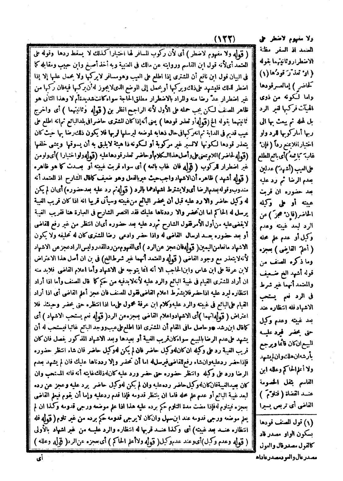 (قَوْلُهُ وَثَانِيَتَهُمَا) أَيْ وَأَخْرَجَ ثَانِيَتَهُمَا بِقَوْلِهِ إلَخْ (قَوْلُهُ، أَوْ تَعَذَّرَ قَوْدُهَا) يَعْنِي أَنَّهُ إذَا كَانَ الْمُشْتَرِي حَاضِرًا فِي بَلَدِ الْبَائِعِ، ثُمَّ إنَّهُ اطَّلَعَ عَلَى عَيْبٍ قَدِيمٍ فِي الدَّابَّةِ، ثُمَّ إنَّهُ رَكِبَهَا فِي حَالَ ذَهَابِهِ لِمَوْضِعِهِ لِيُرْسِلَهَا لِرَبِّهَا فَلَا يَكُونُ ذَلِكَ رِضًا بِهَا حَيْثُ كَانَ يَتَعَذَّرُ قَوْدُهَا لِكَوْنِهَا لَا تَسِيرُ غَيْرَ مَرْكُوبَةٍ، أَوْ لِكَوْنِهِ ذَا هَيْئَةٍ لَا يَلِيقُ بِهِ أَنْ يَسُوقَهَا وَيَمْشِيَ خَلْفَهَا (قَوْلُهُ لِحَاضِرِ) اللَّامُ بِمَعْنَى عَلَى وَأَصْلُ هَذَا الْكَلَامِ، أَوْ حَاضِرٌ تَعَذَّرَ قَوْدُهَا عَلَيْهِ (قَوْلُهُ، وَلَوْ اخْتِيَارًا) أَيْ، وَلَوْ مِنْ غَيْرِ اضْطِرَارٍ لِلرُّكُوبِ (قَوْلُهُ، فَإِنْ غَابَ بَائِعُهُ) أَيْ سَوَاءٌ قَرُبَتْ غَيْبَتُهُ، أَوْ بَعُدَتْ كَمَا هُوَ ظَاهِرُهُ (قَوْلُهُ أَشْهَدَ) ظَاهِرُهُ أَنَّ الْإِشْهَادَ وَاجِبٌ حَيْثُ عَبَّرَ بِالْفِعْلِ، وَهُوَ ضَعِيفٌ كَمَا قَالَ الشَّارِحُ إذْ الْمُعْتَمَدُ أَنَّهُ مَنْدُوبٌ وَقَوْلُهُ بِعَدَمِ الرِّضَا أَيْ وَلَا يُشْتَرَطُ إشْهَادُهُمَا بِالرَّدِّ (قَوْلُهُ، ثُمَّ رَدَّ عَلَيْهِ بَعْدَ حُضُورِهِ) أَيْ إنْ لَمْ يَكُنْ لَهُ وَكِيلٌ حَاضِرٌ، وَإِلَّا رَدَّ عَلَيْهِ قَبْلَ أَنْ يَحْضُرَ الْبَائِعُ مِنْ غَيْبَتِهِ وَسَيَأْتِي قَرِيبًا أَنَّهُ إذَا كَانَ قَرِيبَ الْغَيْبَةِ يُرْسِلُ لَهُ الْحَاكِمُ إمَّا أَنْ تَحْضُرَ، وَإِلَّا رَدَدْنَاهَا عَلَيْك فَقَدْ اقْتَصَرَ الشَّارِحُ فِي الْعِبَارَةِ هُنَا فَقَرِيبُ الْغَيْبَةِ لَا يُقْضَى عَلَيْهِ مِنْ أَوَّل الْأَمْرِ فَقَوْلُ الشَّارِحِ، ثُمَّ رَدَّ عَلَيْهِ بَعْدَ حُضُورِهِ أَيْ إنْ انْتَظَرَ مِنْ غَيْرِ رَفْعٍ لِلْقَاضِي، أَوْ بَعْدَ حُضُورِهِ بَعْدَ إرْسَالِ الْقَاضِي لَهُ وَإِذَا حَضَرَ وَادَّعَى رِضَا الْمُشْتَرِي كَانَ لَهُ تَحْلِيفُهُ وَلَا يَكُونُ الْإِشْهَادُ مَانِعًا مِنْ الْيَمِينِ.