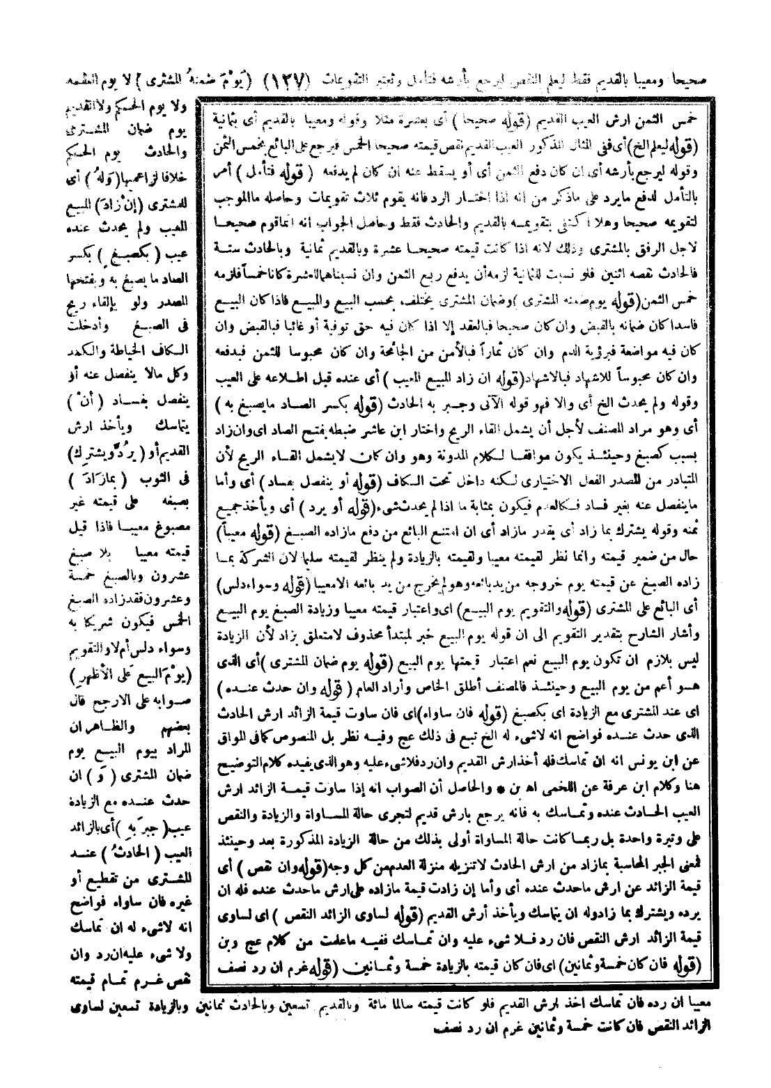 صَحِيحًا وَمَعِيبًا بِالْقَدِيمِ فَقَطْ لِيَعْلَمَ النَّقْصَ لِيَرْجِعَ بِأَرْشِهِ فَتَأَمَّلْ. وَتُعْتَبَرُ التَّقْوِيمَاتُ (يَوْمَ ضَمِنَهُ الْمُشْتَرِي) لَا يَوْمَ الْعَقْدِ وَلَا يَوْمَ الْحُكْمِ وَلَا الْقَدِيمُ يَوْمَ ضَمَانِ الْمُشْتَرِي وَالْحَادِثُ يَوْمَ الْحُكْمِ خِلَافًا لِزَاعِمِيهَا (وَلَهُ) أَيْ لِلْمُشْتَرِي (إنْ زَادَ) الْمَبِيعُ الْمَعِيبُ وَلَمْ يَحْدُثْ عِنْدَهُ عَيْبٌ (بِكَصِبْغٍ) بِكَسْرِ الصَّادِ مَا يُصْبَغُ بِهِ وَبِفَتْحِهَا الْمَصْدَرُ، وَلَوْ بِإِلْقَاءِ رِيحٍ فِي الصِّبْغِ وَأَدْخَلَتْ الْكَافُ الْخِيَاطَةَ وَالْكَمَدَ، وَكُلُّ مَا لَا يَنْفَصِلُ عَنْهُ، أَوْ يَنْفَصِلُ بِفَسَادٍ (أَنْ) يَتَمَاسَكَ وَيَأْخُذَ أَرْشَ الْقَدِيمِ، أَوْ (يَرُدَّ وَيَشْتَرِكَ) فِي الثَّوْبِ (بِمَا زَادَ) بِصَبْغِهِ عَلَى قِيمَتِهِ غَيْرَ مَصْبُوغٍ مَعِيبًا فَإِذَا قِيلَ: قِيمَتُهُ مَعِيبًا بِلَا صِبْغٍ عِشْرُونَ وَبِالصِّبْغِ خَمْسَةً وَعِشْرُونَ فَقَدْ زَادَهُ الصِّبْغُ الْخُمُسَ فَيَكُونُ شَرِيكًا بِهِ وَسَوَاءٌ دَلَّسَ أَمْ لَا وَالتَّقْوِيمُ (يَوْمَ الْبَيْعِ عَلَى الْأَظْهَرِ) صَوَابُهُ عَلَى الْأَرْجَحِ قَالَ بَعْضُهُمْ وَالظَّاهِرُ أَنَّ الْمُرَادَ بِيَوْمِ الْبَيْعِ يَوْمُ ضَمَانِ الْمُشْتَرِي (وَ) إنْ حَدَثَ عِنْدَهُ مَعَ الزِّيَادَةِ عَيْبٌ (جُبِرَ بِهِ) أَيْ بِالزَّائِدِ الْعَيْبُ (الْحَادِثُ) عِنْدَ الْمُشْتَرِي مِنْ تَقْطِيعٍ، أَوْ غَيْرِهِ، فَإِنْ سَاوَاهُ فَوَاضِحٌ أَنَّهُ لَا شَيْءَ لَهُ إنْ تَمَاسَكَ وَلَا شَيْءَ عَلَيْهِ إنْ رَدَّ، وَإِنْ نَقَصَ غَرِمَ تَمَامَ قِيمَتِهِ مَعِيبًا إنْ رَدَّهُ، فَإِنْ تَمَاسَكَ أَخَذَ أَرْشَ الْقَدِيمِ فَلَوْ كَانَتْ قِيمَتُهُ سَالِمًا مِائَةً وَبِالْقَدِيمِ تِسْعِينَ وَبِالْحَادِثِ ثَمَانِينَ وَبِالزِّيَادَةِ تِسْعِينَ لَسَاوَى الزَّائِدُ النَّقْصَ، فَإِنْ كَانَتْ خَمْسَةً وَثَمَانِينَ غَرِمَ إنْ رَدَّ نِصْفَ