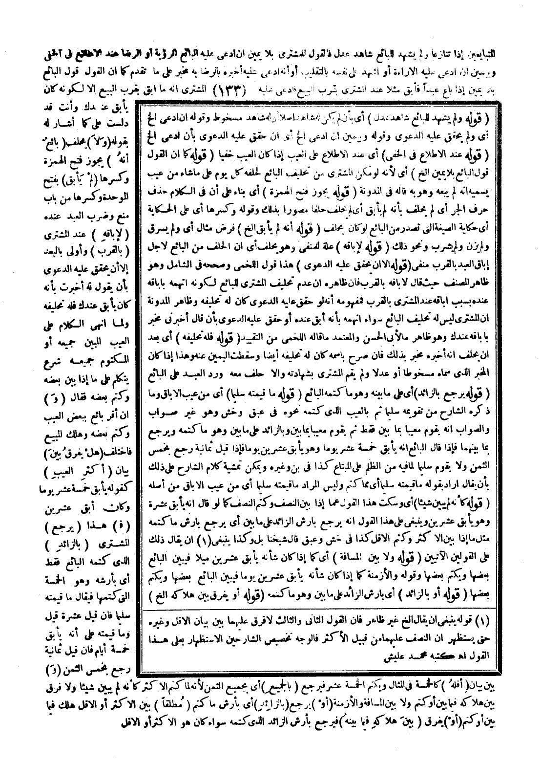 ـــــــــــــــــــــــــــــQقَوْلُهُ وَلَمْ يَشْهَدْ لِلْبَائِعِ شَاهِدٌ عَدْلٌ) أَيْ بِأَنْ لَمْ يَكُنْ لَهُ شَاهِدٌ أَصْلًا، أَوْ لَهُ شَاهِدٌ مَسْخُوطٌ وَقَوْلُهُ إنْ ادَّعَى إلَخْ أَيْ وَلَمْ يُحَقِّقْ عَلَيْهِ الدَّعْوَى وَقَوْلُهُ وَبِيَمِينٍ إنْ ادَّعَى إلَخْ أَيْ إنْ حَقَّقَ عَلَيْهِ الدَّعْوَى بِأَنْ ادَّعَى إلَخْ (قَوْلُهُ عِنْدَ الِاطِّلَاعِ فِي الْخَفِيِّ) أَيْ عِنْدَ الِاطِّلَاعِ عَلَى الْعَيْبِ إذَا كَانَ الْعَيْبُ خَفِيًّا.