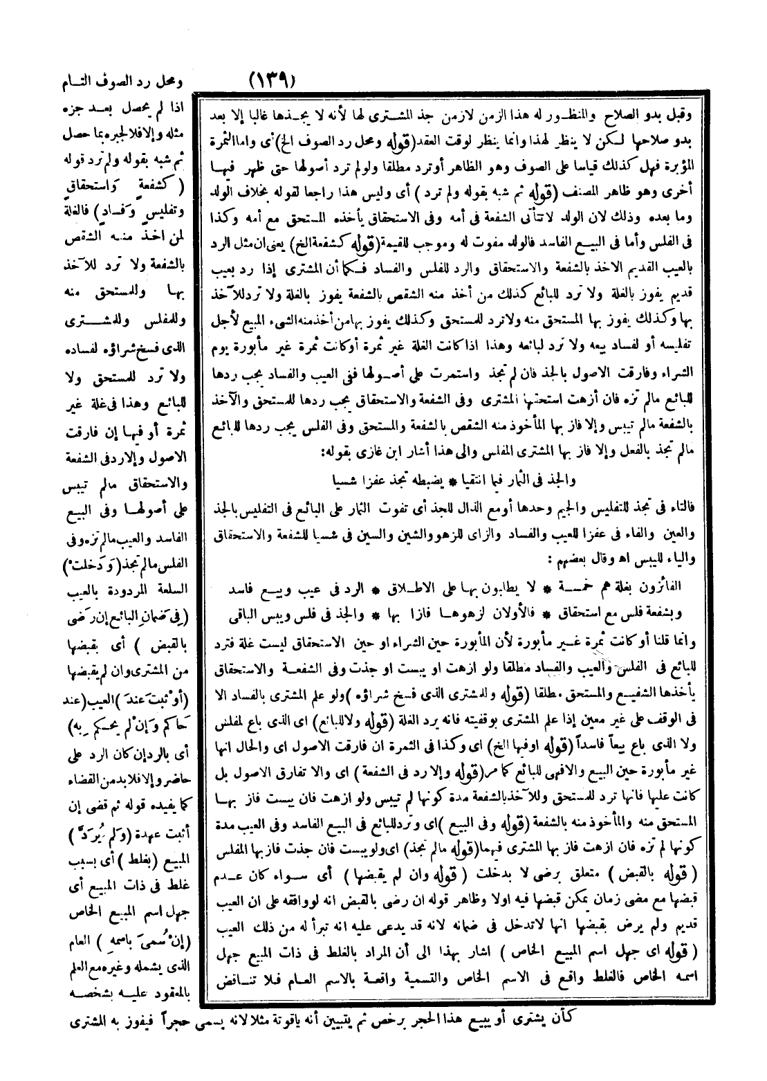 وَمَحَلُّ رَدِّ الصُّوفِ التَّامِّ إذَا لَمْ يَحْصُلْ بَعْدَ جَزِّهِ مِثْلَهُ، وَإِلَّا فَلَا لِجَبْرِهِ بِمَا حَصَلَ، ثُمَّ شَبَّهَ بِقَوْلِهِ وَلَمْ تَرُدَّ قَوْلُهُ (كَشُفْعَةٍ وَاسْتِحْقَاقٍ وَتَفْلِيسٍ وَفَسَادٍ) فَالْغَلَّةُ لِمَنْ أَخَذَ مِنْهُ الشِّقْصَ بِالشُّفْعَةِ، وَلَا تُرَدُّ لِلْآخِذِ بِهَا وَلِلْمُسْتَحِقِّ مِنْهُ وَلِلْمُفْلِسِ وَلِلْمُشْتَرِي الَّذِي فُسِخَ شِرَاؤُهُ لِفَسَادِهِ وَلَا تُرَدُّ لِلْمُسْتَحِقِّ وَلَا لِلْبَائِعِ وَهَذَا فِي غَلَّةٍ غَيْرِ ثَمَرَةٍ، أَوْ فِيهَا إنْ فَارَقَتْ الْأُصُولَ، وَإِلَّا رُدَّ فِي الشُّفْعَةِ وَالِاسْتِحْقَاقِ مَا لَمْ تَيْبَسْ عَلَى أُصُولِهَا وَفِي الْبَيْعِ الْفَاسِدِ وَالْعَيْبِ مَا لَمْ تَزْهُ وَفِي الْفَلَسِ مَا لَمْ تُجَذَّ. .