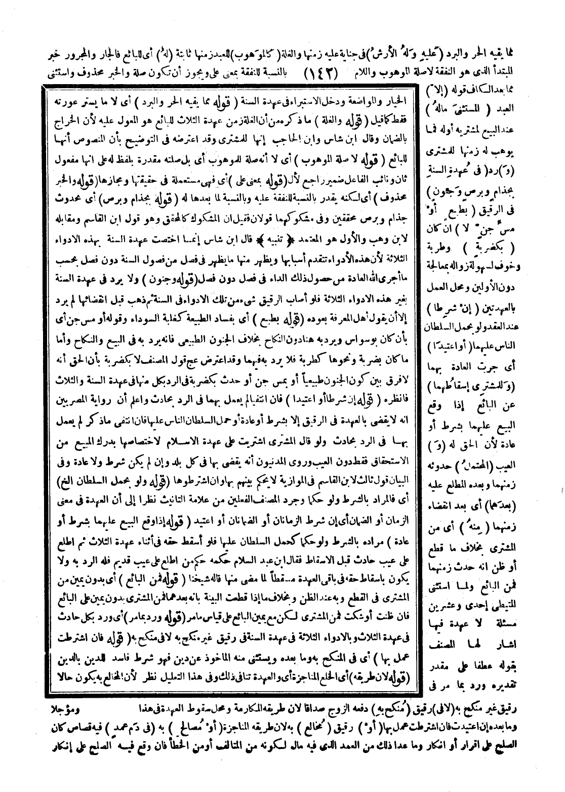 (قَوْلُهُ إنْ شُرِطَا، أَوْ اُعْتِيدَا) ، فَإِنْ انْتَفَيَا لَمْ يُعْمَلْ بِهِمَا فِي الرَّدِّ بِحَادِثٍ، وَاعْلَمْ أَنَّ رِوَايَةَ الْمِصْرِيِّينَ أَنَّهُ لَا يُقْضَى بِالْعُهْدَةِ فِي الرَّقِيقِ إلَّا بِشَرْطٍ، أَوْ عَادَةٍ، أَوْ حَمْلِ السُّلْطَانِ النَّاسَ عَلَيْهَا، فَإِنْ انْتَفَى مَا ذُكِرَ لَمْ يُعْمَلْ بِهَا فِي الرَّدِّ بِحَادِثٍ، وَلَوْ قَالَ الْمُشْتَرِي اشْتَرَيْت عَلَى عُهْدَةِ الْإِسْلَامِ لِاخْتِصَاصِهَا بِدَرْكِ الْمَبِيعِ مِنْ الِاسْتِحْقَاقِ فَقَطْ دُونَ الْعَيْبِ وَرَوَى الْمَدَنِيُّونَ أَنَّهُ يُقْضَى بِهَا فِي كُلِّ بَلَدٍ، وَإِنْ لَمْ يَكُنْ شَرْطٌ وَلَا عَادَةٌ وَفِي الْبَيَانِ قَوْلٌ ثَالِثٌ لِابْنِ الْقَاسِمِ فِي الْمَوَّازِيَّةِ لَا يُحْكَمُ بَيْنَهُمْ بِهَا، وَإِنْ اشْتَرَطُوهَا (قَوْلُهُ، وَلَوْ بِحَمْلِ السُّلْطَانِ إلَخْ) أَيْ فَالْمُرَادُ بِالشَّرْطِ، وَلَوْ حُكْمًا وَجَرَّدَ الْمُصَنِّفُ الْفِعْلَيْنِ مِنْ عَلَامَةِ التَّأْنِيثِ نَظَرًا إلَى أَنَّ الْعُهْدَةَ فِي مَعْنَى الزَّمَانِ، أَوْ الضَّمَانِ أَيْ إنْ شَرَطَ الزَّمَانَانِ، أَوْ الضَّمَانَانِ، أَوْ اُعْتِيدَ (قَوْلُهُ إذَا وَقَعَ الْبَيْعُ عَلَيْهِمَا بِشَرْطٍ، أَوْ عَادَةٍ) مُرَادُهُ بِالشَّرْطِ، وَلَوْ حُكْمًا كَحَمْلِ السُّلْطَانِ عَلَيْهَا فَلَوْ أَسْقَطَ حَقَّهُ فِي أَثْنَاءِ عُهْدَةِ الثَّلَاثِ، ثُمَّ اطَّلَعَ عَلَى عَيْبٍ حَادِثٍ قَبْلَ الْإِسْقَاطِ فَقَالَ ابْنُ عَبْدِ السَّلَامِ حُكْمُهُ حُكْمُ مَنْ اطَّلَعَ عَلَى عَيْبٍ قَدِيمٍ فَلَهُ الرَّدُّ بِهِ وَلَا يَكُونُ بِإِسْقَاطِ حَقِّهِ فِي بَاقِي الْعُهْدَةِ مُسْقِطًا لِمَا مَضَى مِنْهَا قَالَهُ شَيْخُنَا (قَوْلُهُ فَمِنْ الْبَائِعِ) أَيْ بِدُونِ يَمِينٍ مِنْ الْمُشْتَرِي فِي الْقَطْعِ وَبِهِ عِنْدَ الظَّنِّ وَبِخِلَافِ مَا إذَا قَطَعَتْ الْبَيِّنَةُ بِأَنَّهُ بَعْدَهُمَا فَمِنْ الْمُشْتَرِي بِدُونِ يَمِينٍ عَلَى الْبَائِعِ، فَإِنْ ظَنَّتْ، أَوْ شَكَّتْ فَمِنْ الْمُشْتَرِي لَكِنْ مَعَ يَمِينِ الْبَائِعِ عَلَى قِيَاسِ مَا مَرَّ (قَوْلُهُ وَرُدَّ بِمَا مَرَّ) أَيْ وَرُدَّ بِكُلِّ حَادِثٍ فِي عُهْدَةِ الثَّلَاثِ وَبِالْأَدْوَاءِ الثَّلَاثَةِ فِي عُهْدَةِ السَّنَةِ فِي رَقِيقٍ غَيْرِ مُنْكَحٍ بِهِ لَا فِي مُنْكَحٍ بِهِ (قَوْلُهُ، فَإِنْ اُشْتُرِطَتْ عُمِلَ بِهَا) أَيْ فِي الْمُنْكَحِ بِهِ وَمَا بَعْدَهُ وَيُسْتَثْنَى مِنْهُ الْمَأْخُوذُ عَنْ دَيْنٍ فَهُوَ شَرْطٌ فَاسِدٌ لِلدَّيْنِ بِالدَّيْنِ (قَوْلُهُ لِأَنَّ طَرِيقَةَ) أَيْ الْخُلْعِ الْمُنَاجَزَةُ أَيْ، وَالْعُهْدَةُ تُنَافِي ذَلِكَ وَفِي هَذَا التَّعْلِيلِ نَظَرٌ؛ لِأَنَّ الْمُخَالَعَ بِهِ يَكُونُ حَالًّا