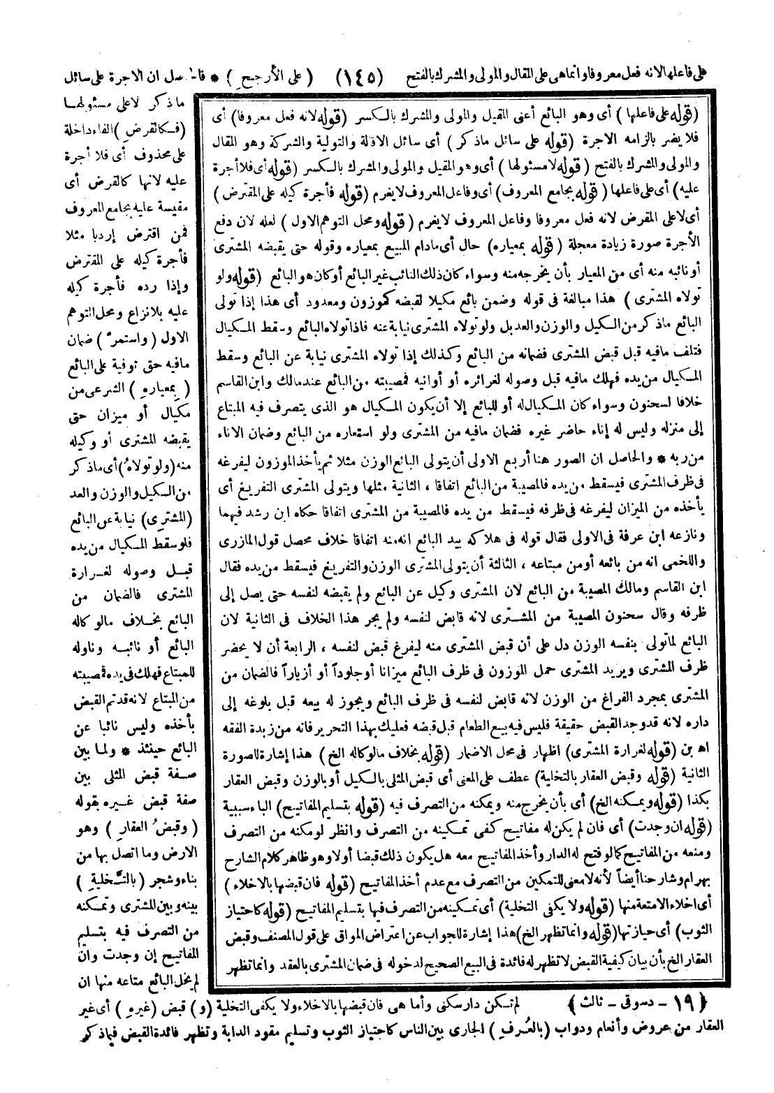 (قَوْلُهُ عَلَى سَائِلِ مَا ذُكِرَ) أَيْ سَائِلِ الْإِقَالَةِ وَالتَّوْلِيَةِ وَالشَّرِكَةِ، وَهُوَ الْمُقَالُ وَالْمُوَلَّى وَالْمُشْرَكُ بِالْفَتْحِ (قَوْلُهُ لَا مَسْئُولُهَا) أَيْ، وَهُوَ الْمُقِيلُ وَالْمُوَلِّي وَالْمُشْرِكُ بِالْكَسْرِ (قَوْلُهُ أَيْ فَلَا أُجْرَةَ عَلَيْهِ) أَيْ عَلَى فَاعِلِهَا (قَوْلُهُ بِجَامِعِ الْمَعْرُوفِ) أَيْ وَفَاعِلُ الْمَعْرُوفِ لَا يَغْرَمُ (قَوْلُهُ فَأُجْرَةُ كَيْلِهِ عَلَى الْمُقْتَرِضِ) أَيْ لَا عَلَى الْمُقْرِضِ؛ لِأَنَّهُ فَعَلَ مَعْرُوفًا وَفَاعِلُ الْمَعْرُوفِ لَا يَغْرَمُ (قَوْلُهُ وَمَحَلُّ التَّوَهُّمِ الْأَوَّلِ) لَعَلَّهُ؛ لِأَنَّ دَفْعَ الْأُجْرَةِ صُورَةُ زِيَادَةٍ مُعَجَّلَةٍ (قَوْلُهُ بِمِعْيَارِهِ) حَالٌ أَيْ مَا دَامَ الْمَبِيعُ بِمِعْيَارِهِ وَقَوْلُهُ حَتَّى يَقْبِضَهُ الْمُشْتَرِي، أَوْ نَائِبُهُ مِنْهُ أَيْ مِنْ الْمِعْيَارِ بِأَنْ يُخْرِجَهُ مِنْهُ وَسَوَاءٌ كَانَ ذَلِكَ النَّائِبُ غَيْرَ الْبَائِعِ، أَوْ كَانَ هُوَ الْبَائِعُ. .