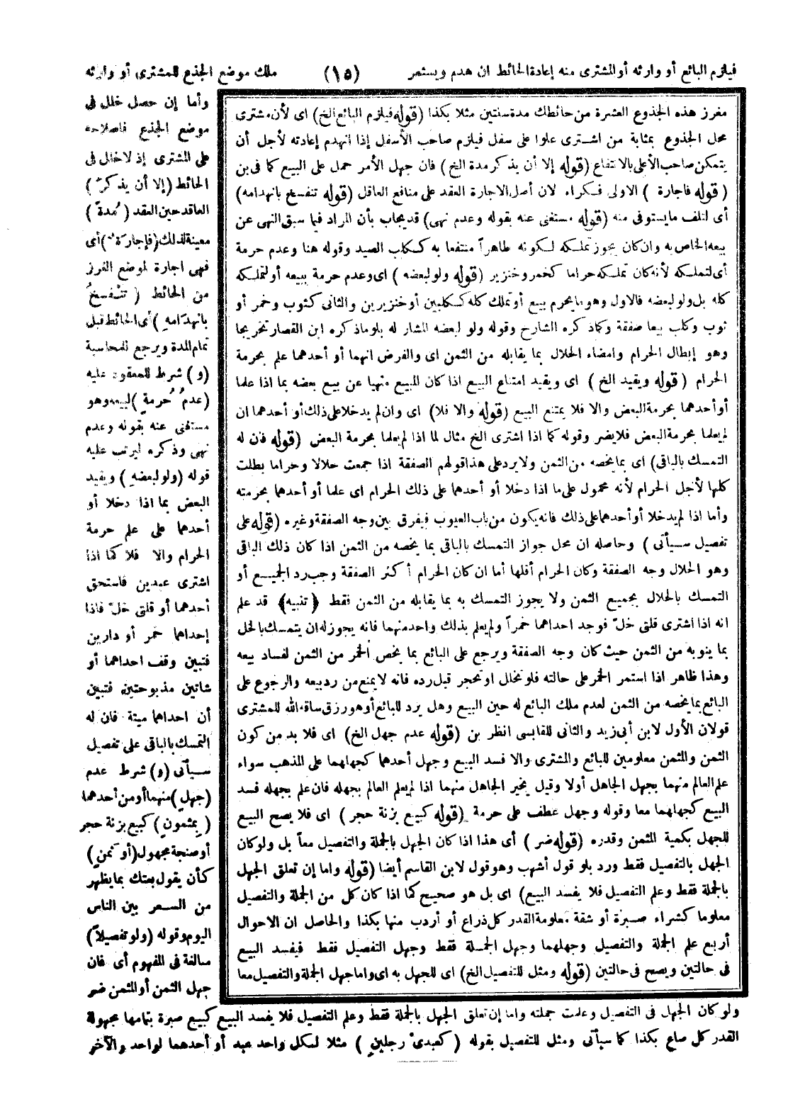(قَوْلُهُ: مُسْتَغْنًى عَنْهُ بِقَوْلِهِ وَعَدَمُ نَهْيٍ) قَدْ يُجَابُ بِأَنَّ الْمُرَادَ فِيمَا سَبَقَ النَّهْيُ عَنْ بَيْعِهِ الْخَاصِّ بِهِ، وَإِنْ كَانَ يَجُوزُ تَمَلُّكُهُ لِكَوْنِهِ طَاهِرًا مُنْتَفَعًا بِهِ كَكَلْبِ الصَّيْدِ وَقَوْلُهُ: هُنَا وَعَدَمُ حُرْمَةٍ أَيْ لِتَمَلُّكِهِ؛ لِأَنَّهُ كَانَ تَمَلُّكُهُ حَرَامًا كَخَمْرٍ وَخِنْزِيرٍ (قَوْلُهُ: وَلَوْ لِبَعْضِهِ) أَيْ وَعَدَمُ حُرْمَةٍ بِبَيْعِهِ أَوْ لِتَمَلُّكِهِ كُلِّهِ بَلْ، وَلَوْ لِبَعْضِهِ فَالْأَوَّلُ وَهُوَ مَا يُحَرَّمُ بَيْعُ أَوْ تَمَلُّكُ كُلِّهِ كَكَلْبَيْنِ أَوْ خِنْزِيرَيْنِ، وَالثَّانِي كَثَوْبٍ وَخَمْرٍ أَوْ ثَوْبٍ وَكَلْبٍ بِيعَا صَفْقَةٍ وَكَمَا ذَكَرَهُ الشَّارِحُ وَقَوْلُهُ: وَلَوْ لِبَعْضِهِ الْمُشَارِ لَهُ بِلَوْ مَا ذَكَرَهُ ابْنُ الْقَصَّارِ تَخْرِيجًا وَهُوَ إبْطَالُ الْحَرَامِ وَإِمْضَاءُ الْحَلَالِ بِمَا يُقَابِلُهُ مِنْ الثَّمَنِ أَيْ وَالْفَرْضُ أَنَّهُمَا أَوْ أَحَدُهُمَا عَلِمَ بِحُرْمَةِ الْحَرَامِ (قَوْلُهُ: وَيُقَيَّدُ إلَخْ) أَيْ وَيُقَيَّدُ امْتِنَاعُ الْبَيْعِ إذَا كَانَ الْمَبِيعُ مَنْهِيًّا عَنْ بَيْعِ بَعْضِهِ بِمَا إذَا عَلِمَا أَوْ أَحَدُهُمَا بِحُرْمَةِ الْبَعْضِ وَإِلَّا فَلَا يَمْتَنِعُ الْبَيْعُ.