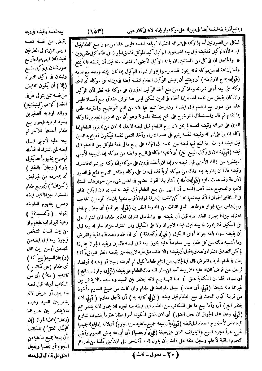 ـــــــــــــــــــــــــــــQلِكُلٍّ مِنْ الصُّورَتَيْنِ أَمَّا إذَا وَكَّلَهُ عَلَى شِرَائِهِ فَاشْتَرَاهُ، ثُمَّ بَاعَهُ لِنَفْسِهِ فَلَيْسَ هَذَا مِنْ صُوَرِ بَيْعِ الطَّعَامِ قَبْلَ قَبْضِهِ لِأَنَّ الْوَكِيلَ قَدْ قَبَضَهُ قَبْلَ بَيْعِهِ لِنَفْسِهِ وَيَدُ الْوَكِيلِ كَيَدِ الْمُوَكِّلِ فَالْحَقُّ الْجَوَازُ فِي هَذِهِ كَمَا فِي طفى وبن، وَالْحَاصِلُ أَنَّ فِي كُلٍّ مِنْ الْمَسْأَلَتَيْنِ إنْ بَاعَهُ الْوَكِيلُ لِأَجْنَبِيٍّ، ثُمَّ اشْتَرَاهُ مِنْهُ قَبْلَ أَنْ يَقْبِضَهُ فَإِنَّهُ يُمْنَعُ، وَأَمَّا إنْ اشْتَرَاهُ مِنْ مُوَكِّلِهِ فَإِنَّهُ يَجُوزُ فَقَدْ صَرَّحُوا بِجَوَازِ شِرَاءِ الْوَكِيلِ إذَا كَانَ بِإِذْنِهِ وَمَنَعَهُ مَعَ عَدَمِهِ (قَوْلُهُ وَيَمْتَنِعُ أَنْ يَقْبِضَهُ) أَيْ وَيَمْتَنِعُ أَنْ يَقْبِضَ الْوَكِيلُ الطَّعَامَ لِنَفْسِهِ أَيْضًا فِي دَيْنٍ لَهُ عَلَى مُوَكِّلِهِ أَيْ الَّذِي وَكَّلَهُ عَلَى بَيْعِهِ، أَوْ عَلَى شِرَائِهِ وَمَا ذَكَرَهُ مِنْ مَنْعِ أَخْذِ الْوَكِيلِ لَهُ فِي دَيْنٍ عَلَى مُوَكِّلِهِ فِيهِ نَظَرٌ؛ لِأَنَّ الْوَكِيلَ، وَإِنْ كَانَ يَقْبِضُ مِنْ نَفْسِهِ لِنَفْسِهِ إذَا أَخَذَهُ فِي الدَّيْنِ لَكِنْ لَيْسَ هُنَا تَوَالِي عُقْدَتَيْ بَيْعٍ أَصْلًا فَلَيْسَ هَذَا مِنْ صُوَرِ بَيْعِ الطَّعَامِ قَبْلَ قَبْضِهِ وَشَارِحُنَا تَبِعَ فِيمَا قَالَهُ مِنْ الْمَنْعِ التَّوْضِيحَ وَاعْتَرَضَهُ طفي بِمَا تَقَدَّمَ، ثُمَّ قَالَ وَاسْتِدْلَالُ التَّوْضِيحِ عَلَى الْمَنْعِ بِمَسْأَلَةِ الْمُدَوَّنَةِ، وَهُوَ أَنَّ مَنْ لَهُ دَيْنُ الطَّعَامِ إذَا وَكَّلَهُ الْمَدِينُ عَلَى شِرَائِهِ وَقَبَضَهُ لِنَفْسِهِ لَمْ يَجُزْ؛ لِأَنَّ بَيْعَ الطَّعَامِ قَبْلَ قَبْضِهِ لَا يَدُلُّ لَهُ؛ لِأَنَّ مَنْ لَهُ دَيْنُ الطَّعَامِ إذَا وَكَّلَهُ الْمَدِينُ عَلَى شِرَائِهِ وَقَبَضَهُ لِنَفْسِهِ يُتَّهَمُ عَلَى عَدَمِ الشِّرَاءِ وَأَخْذِ الثَّمَنِ لِنَفْسِهِ فَيَكُونُ قَدْ بَاعَ بِهِ الدَّيْنَ قَبْلَ قَبْضِهِ فَلَيْسَتْ عِلَّةُ الْمَنْعِ فِيهَا قَبْضُهُ مِنْ نَفْسِهِ بَلْ اتِّهَامُهُ عَلَى بَيْعِ مَا فِي ذِمَّةِ الْمُوَكِّلِ مِنْ الطَّعَامِ قَبْلَ قَبْضِهِ (قَوْلُهُ ثِنْتَانِ فِي وَكِيلِ الْبَيْعِ إلَخْ) أَيْ؛ لِأَنَّهُ إذَا وَكَّلَهُ عَلَى الْبَيْعِ وَقَبَضَهُ مِنْ مُوَكِّلِهِ إمَّا أَنْ يَبِيعَهُ لِأَجْنَبِيٍّ، ثُمَّ يَشْتَرِيهِ مِنْ ذَلِكَ الْأَجْنَبِيِّ قَبْلَ قَبْضِهِ لَهُ، وَإِمَّا أَنْ يَأْخُذَهُ فِي دَيْنٍ عَلَى مُوَكِّلِهِ وَإِذَا وَكَّلَهُ عَلَى شِرَائِهِ فَاشْتَرَاهُ وَقَبَضَهُ فَإِمَّا أَنْ يَشْتَرِيَهُ بَعْدَ ذَلِكَ مِنْ مُوَكِّلِهِ، أَوْ يَأْخُذَهُ فِي دَيْنٍ عَلَى مُوَكِّلِهِ وَظَاهِرُ الشَّرْحِ الْمَنْعُ فِي الصُّوَرِ الْأَرْبَعَةِ، وَقَدْ عَلِمْت مَا فِيهِ.