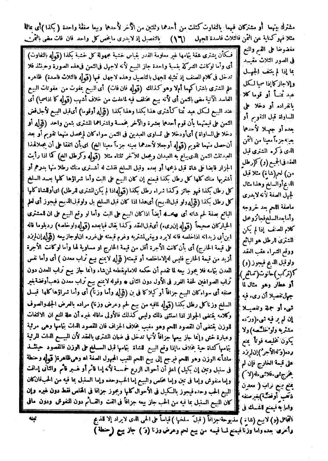 مُشْتَرَكٌ بَيْنَهُمَا أَوْ مُشْتَرَكَانِ فِيهِمَا بِالتَّفَاوُتِ كَثُلُثٍ مِنْ أَحَدِهِمَا وَثُلُثَيْنِ مِنْ الْآخَرِ لِأَحَدِهِمَا وَبِيعَا صَفْقَةً وَاحِدَةً (بِكَذَا) أَيْ بِمِائَةٍ مَثَلًا فَهُوَ كِنَايَةٌ عَنْ الثَّمَنِ فَالثَّلَاثُ فَاسِدَةٌ لِلْجَهْلِ بِالتَّفْصِيلِ إذْ لَا يَدْرِي مَا يَخُصُّ كُلَّ وَاحِدٍ، فَإِنْ فَاتَ مَضَى بِالثَّمَنِ مَفْضُوضًا عَلَى الْقَيِّمِ وَالْمَنْعُ فِي الصُّوَرِ الثَّلَاثِ مُقَيَّدٌ بِمَا إذَا لَمْ يَنْتَفِ الْجَهْلُ وَإِلَّا جَازَ كَمَا إذَا سَمَّيَا لِكُلِّ عَبْدٍ ثَمَنًا أَوْ قَوَّمَا كُلًّا بِانْفِرَادِهِ أَوْ دَخَلَا عَلَى الْمُسَاوَاةِ قَبْلَ التَّقْوِيمِ أَوْ بَعْدَهُ أَوْ جَعَلَا لِأَحَدِهِمَا بِعَيْنِهِ جُزْءًا مُعَيَّنًا مِنْ الثَّمَنِ الَّذِي ذَكَرَهُ الْمُشْتَرِي قَبْلَ الْعَقْدِ فِي الْجَمِيعِ (و) ك (رِطْلٍ مِنْ) لَحْمِ (شَاةٍ) مَثَلًا قَبْلَ الذَّبْحِ أَوْ السَّلْخِ وَهَذَا مِثَالٌ لِجَهْلِ الصِّفَةِ؛ لِأَنَّهُ لَا يَدْرِي مَا صِفَةُ اللَّحْمِ بَعْدَ خُرُوجِهِ، وَأَمَّا بَعْدَ السَّلْخِ فَجَائِزٌ وَمَحَلُّ كَلَامِ الْمُصَنِّفِ إذَا لَمْ يَكُنْ الْمُشْتَرِي لِلرِّطْلِ هُوَ الْبَائِعُ وَوَقَعَ الشِّرَاءُ عَقِبَ الْعَقْدِ، وَلَوْ قَبْلَ الذَّبْحِ فَيَجُوزُ (و) ك (تُرَابِ) حَانُوتِ (صَائِغٍ) أَوْ عَطَّارٍ وَهُوَ مِثَالٌ لِمَا جُهِلَ تَفْصِيلًا إنْ رُئِيَ فِيهِ شَيْءٌ أَوْ جُمْلَةً وَتَفْصِيلًا إنْ لَمْ يُرَ فِيهِ شَيْءٌ (وَرَدَّهُ مُشْتَرِيه، وَلَوْ خَلَّصَهُ) وَلَا يَكُونُ تَخْلِيصُهُ فَوْتًا يَمْنَعُ رَدَّهُ (وَلَهُ الْأَجْرُ) إنْ لَمْ يَزِدْ عَلَى قِيمَةِ الْخَارِجِ، فَإِنْ لَمْ يَخْرُجْ شَيْءٌ فَلَا شَيْءَ لَهُ.