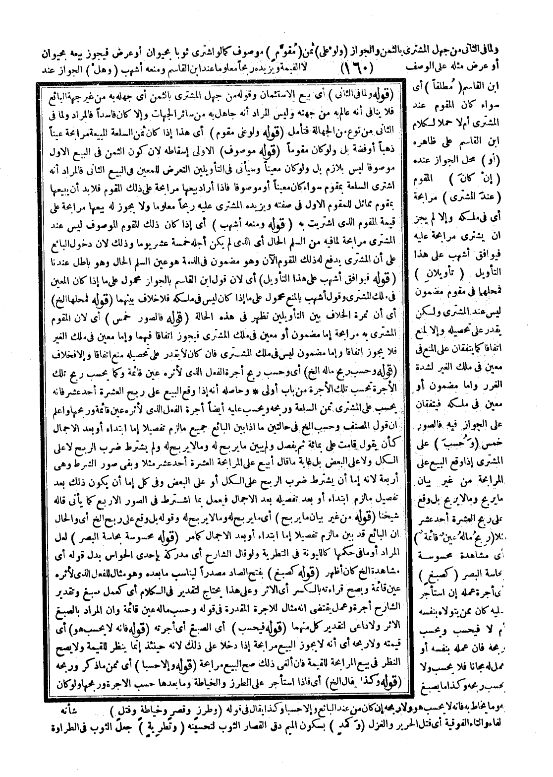 وَلِمَا فِي الثَّانِي مِنْ جَهْلِ الْمُشْتَرِي بِالثَّمَنِ وَالْجَوَازِ (وَلَوْ عَلَى) ثَمَنٍ (مُقَوَّمٍ) مَوْصُوفٍ كَمَا لَوْ اشْتَرَى ثَوْبًا بِحَيَوَانٍ أَوْ عَرْضٍ فَيَجُوزُ بَيْعُهُ بِحَيَوَانٍ أَوْ عَرْضٍ مِثْلِهِ عَلَى الْوَصْفِ لَا الْقِيمَةِ وَيَزِيدُهُ رِبْحًا مَعْلُومًا عِنْدَ ابْنِ الْقَاسِمِ وَمَنَعَهُ أَشْهَبُ (وَهَلْ) الْجَوَازُ عِنْدَ ابْنِ الْقَاسِمِ (مُطْلَقًا) أَيْ سَوَاءٌ كَانَ الْمُقَوَّمُ عِنْدَ الْمُشْتَرِي أَمْ لَا حَمْلًا لِكَلَامِ ابْنِ الْقَاسِمِ عَلَى ظَاهِرِهِ (أَوْ) مَحَلُّ الْجَوَازِ عِنْدَهُ (إنْ كَانَ) الْمُقَوَّمُ (عِنْدَ الْمُشْتَرِي) مُرَابَحَةً أَيْ فِي مِلْكِهِ وَإِلَّا لَمْ يَجُزْ أَنْ يَشْتَرِيَ مُرَابَحَةً عَلَيْهِ فَيُوَافِقَ أَشْهَبَ عَلَى هَذَا التَّأْوِيلِ (تَأْوِيلَانِ) فَمَحَلُّهُمَا فِي مُقَوَّمٍ مَضْمُونٍ لَيْسَ عِنْدَ الْمُشْتَرِي وَلَكِنْ يَقْدِرُ عَلَى تَحْصِيلِهِ وَإِلَّا لَمُنِعَ اتِّفَاقًا كَمَا يَتَّفِقَانِ عَلَى الْمَنْعِ فِي مُعَيَّنٍ فِي مِلْكِ الْغَيْرِ لِشِدَّةِ الْغَرَرِ إمَّا مَضْمُونٌ أَوْ مُعَيَّنٌ فِي مِلْكِهِ فَيَتَّفِقَانِ عَلَى الْجَوَازِ فِيهِ فَالصُّوَرُ خَمْسٌ (وَحُسِبَ) عَلَى الْمُشْتَرِي إذَا وَقَعَ الْبَيْعُ عَلَى الْمُرَابَحَةِ مِنْ غَيْرِ بَيَانٍ مَا يَرْبَحُ وَمَا لَا يَرْبَحُ بَلْ وَقَعَ عَلَى رِبْحِ الْعَشَرَةِ أَحَدَ عَشَرَ مَثَلًا (رِبْحُ مَا لَهُ عَيْنٌ قَائِمَةٌ) أَيْ مُشَاهَدَةٌ مَحْسُوسَةٌ بِحَاسَّةِ الْبَصَرِ (كَصَبْغٍ) أَيْ أُجْرَةِ عَمَلِهِ إنْ اسْتَأْجَرَ عَلَيْهِ كَانَ مِمَّنْ يَتَوَلَّاهُ بِنَفْسِهِ أَمْ لَا فَيُحْسَبُ وَيُحْسَبُ رِبْحُهُ فَإِنْ عَمِلَهُ بِنَفْسِهِ أَوْ عُمِلَ لَهُ مَجَّانًا فَلَا يُحْسَبُ وَلَا يُحْسَبُ رِبْحُهُ وَكَذَا مَا يُصْبَغُ بِهِ وَمَا يُخَاطُ بِهِ فَإِنَّهُ لَا يُحْسَبُ هُوَ وَلَا رِبْحُهُ إنْ كَانَ مِنْ عِنْدِ الْبَائِعِ وَإِلَّا حُسِبَا وَكَذَا يُقَالُ فِي قَوْلِهِ (وَطَرْزٍ وَقَصْرٍ وَخِيَاطَةٍ وَفَتْلٍ) بِالْفَاءِ وَالتَّاءِ الْفَوْقِيَّةِ أَيْ فَتْلِ الْحَرِيرِ وَالْغَزْلِ (وَكَمْدٍ) بِسُكُونِ الْمِيمِ دَقُّ الْقَصَّارِ الثَّوْبَ لِتَحْسِينِهِ (وَتَطْرِيَةٍ) جَعْلُ الثَّوْبِ فِي الطَّرَاوَةِ