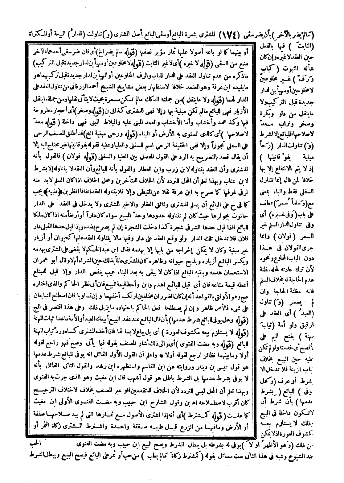 {تَنْبِيهٌ} يَجِبُ كَمَا فِي ح عَلَى الْبَائِعِ أَنْ يُسَلِّمَ لِلْمُشْتَرِي وَثَائِقَ الْعَقَارِ وَالْأَخِيرُ الْمُشْتَرِي وَلَا يَدْخُلُ فِي الْعَقْدِ عَلَى الدَّارِ حَانُوتٌ بِجِوَارِهَا حَيْثُ كَانَ لَمْ تَتَنَاوَلْهُ حُدُودُهَا وَحَدُّ الْمَبِيعِ سَوَاءٌ كَانَ دَارًا أَوْ أَرْضًا مِنْهُ إذَا كَانَ مِلْكًا لِلْبَائِعِ فَإِذَا قِيلَ حَدُّهَا الشَّرْقِيُّ شَجَرَةُ كَذَا دَخَلَتْ الشَّجَرَةُ إنْ لَمْ يُصَرِّحْ بِضِدِّهِ وَإِذَا قِيلَ حَدُّهَا الْقِبْلِيُّ دَارُ فُلَانٍ فَلَا تَدْخُلُ تِلْكَ الدَّارُ وَلَوْ وَقَعَ الْعَقْدُ عَلَى دَارٍ وَفِيهَا مَا لَا يَتَنَاوَلُهُ الْعَقْدُ عَلَيْهَا كَحَيَوَانٍ أَوْ أَزْيَارٍ غَيْرِ مَبْنِيَّةٍ وَكَانَ لَا يُمْكِنُ إخْرَاجُهُ مِنْ بَابِهَا إلَّا بِهَدْمِهِ فَقَالَ ابْنُ عَبْدِ الْحَكَمِ لَا يُقْضَى عَلَى الْمُشْتَرِي بِهَدْمِهِ وَيَكْسِرُ الْبَائِعُ أَزْيَارَهُ وَيَذْبَحُ حَيَوَانَهُ وَظَاهِرُهُ كَانَ الْمُشْتَرِي عَالِمًا بِذَلِكَ حِينَ الشِّرَاءِ أَمْ لَا وَقَالَ أَبُو عِمْرَانَ الِاسْتِحْسَانُ هَدْمُهُ وَيَبْنِيهِ الْبَائِعُ إذَا كَانَ لَا يَبْقَى بِهِ بَعْدَ الْبِنَاءِ عَيْبٌ يُنْقِصُ الدَّارَ وَإِلَّا قِيلَ لِلْمُبْتَاعِ أَعْطِهِ قِيمَةَ مَتَاعِهِ فَإِنْ أَبَى قِيلَ لِلْبَائِعِ اهْدِمْ وَابْنِ وَأَعْطِ قِيمَةَ الْبَيْعِ فَإِنْ أَبَى نَظَرَ الْحَاكِمُ وَاَلَّذِي اخْتَارَهُ عج وَهُوَ الْأَوْفَقُ بِالْقَوَاعِدِ أَنَّهُ إنْ كَانَ الضَّرَرَانِ مُخْتَلِفَيْنِ اُرْتُكِبَ أَخَفُّهُمَا وَإِنْ تَسَاوَيَا فَإِنْ اصْطَلَحَ الْمُتَبَايِعَانِ عَلَى شَيْءٍ فَالْأَمْرُ ظَاهِرٌ وَإِنْ لَمْ يَصْطَلِحَا فَعَلَ الْحَاكِمُ بِاجْتِهَادِهِ مَا يُزِيلُ ذَلِكَ وَعَلَى هَذَا اقْتَصَرَ فِي المج