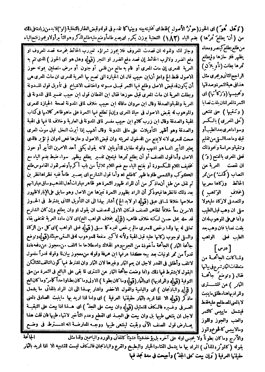 (وَهَلْ هُوَ) أَيْ الْحَوْزُ (حَوْزُ الْأُصُولِ) فَقَطْ أَيْ تَخْلِيَتُهُ بَيْنَهُ وَبَيْنَهَا كَمَا تَقَدَّمَ فِي قَوْلِهِ وَقَبْضُ الْعَقَارِ بِالتَّخْلِيَةِ (أَوْ) لَا بُدَّ مِنْ زِيَادَةٍ عَلَى ذَلِكَ مِنْ (أَنْ يُطْلِعَ ثَمَرُهَا) بِضَمِّ الْيَاءِ التَّحْتِيَّةِ بِوَزْنِ يُكْرِمُ أَيْ يَصِيرُ طَلْعًا وُضِعَ عَلَيْهِ طَلْعُ الذَّكَرِ وَهُوَ التَّأْبِيرُ أَوْ لَا وَيَجُوزُ فَتْحُ الْيَاءِ مِنْ طَلَعَ يَطْلُعُ كَيَنْصُرُ وَمَعْنَاهُ يَظْهَرُ فَلَوْ حَازَهَا وَلَمْ يَطْلُعْ ثَمَرُهَا بَطَلَتْ (تَأْوِيلَانِ) الرَّاجِحُ الثَّانِي وَيَجْرِي مِثْلُ هَذَا فِي هِبَةِ الثَّمَرَةِ وَصَدَقَتِهَا وَتَحْبِيسِهَا (وَزَكَاتُهَا) أَيْ الثَّمَرَةُ الْمُعْرَاةُ إنْ بَلَغَتْ نِصَابًا (وَسَقْيُهَا) حَتَّى تَنْتَهِيَ (عَلَى الْمُعْرِي) بِالْكَسْرِ وَسَوَاءٌ أَعْرَى بَعْدَ الطِّيبِ أَوْ قَبْلَهُ وَمَا عَدَا السَّقْيَ مِنْ تَقْلِيمٍ وَتَنْقِيَةٍ وَحِرَاسَةٍ وَنَحْوِ ذَلِكَ فَعَلَى الْمُعْرَى بِالْفَتْحِ (أَوْ) إنْ نَقَصَتْ الْعَرِيَّةُ عَنْ النِّصَابِ (كَمُلَتْ) مِنْ ثَمَرِ الْحَائِطِ وَزَكَّاهَا مُعْرِيهَا (بِخِلَافِ الْوَاهِبِ) وَالْمُتَصَدِّقُ لَا زَكَاةَ عَلَيْهِ وَلَا سَقْيَ إنْ وَهَبَ قَبْلَ الطِّيبِ وَإِنَّمَا هِيَ عَلَى الْمَوْهُوبِ لَهُ إنْ بَلَغَتْ نِصَابًا فَإِنْ وَهَبَ بَعْدَ الطِّيبِ فَعَلَى الْوَاهِبِ