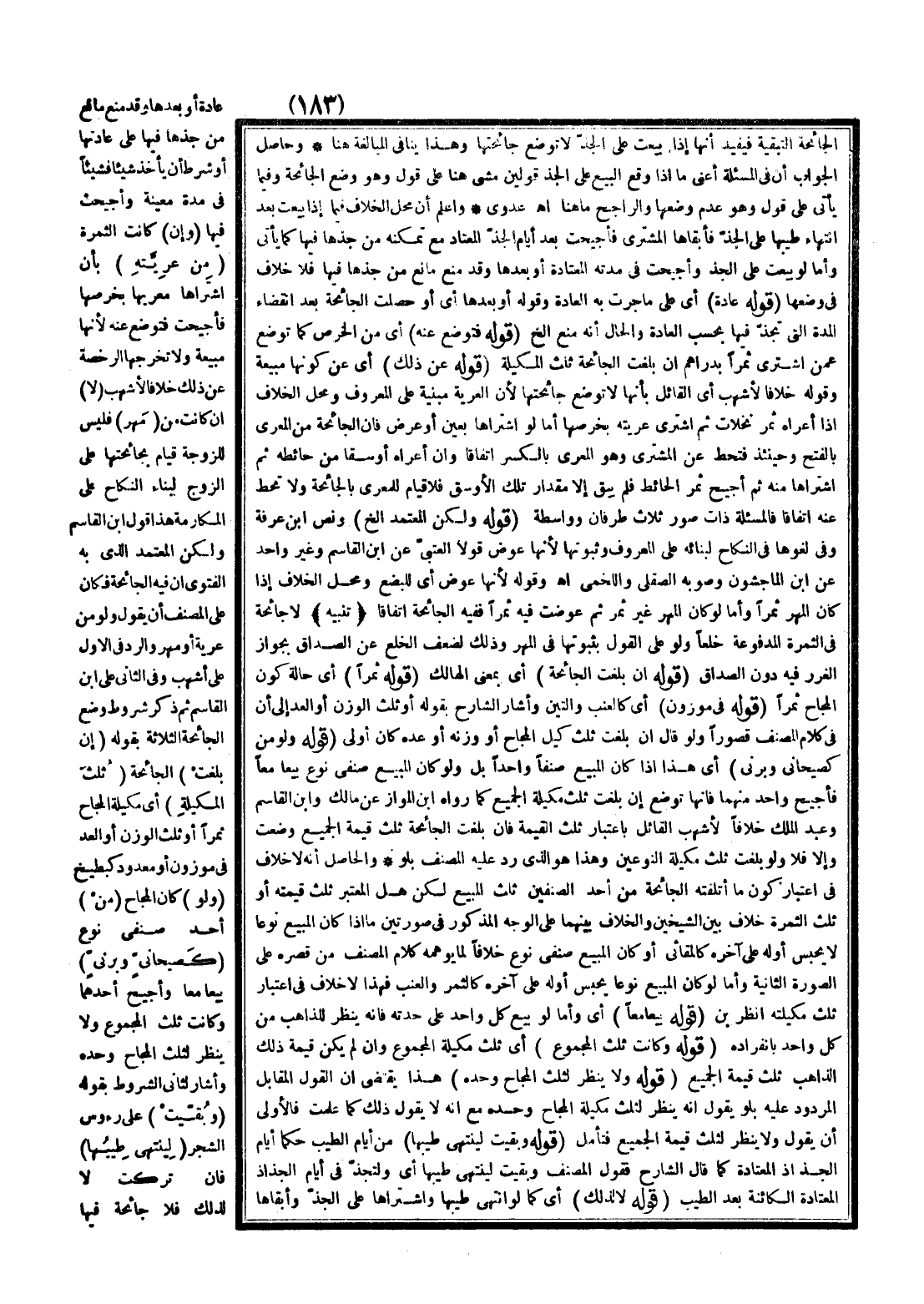 عَادَةً أَوْ بَعْدَهَا وَقَدْ مَنَعَ مَانِعٌ مِنْ جَذِّهَا فِيهَا عَلَى عَادَتِهَا أَوْ شَرَطَ أَنْ يَأْخُذَ شَيْئًا فَشَيْئًا فِي مُدَّةٍ مُعَيَّنَةٍ وَأُجِيحَتْ فِيهَا (وَإِنْ) كَانَتْ الثَّمَرَةُ (مِنْ عَرِيَّتِهِ) بِأَنْ اشْتَرَاهَا مُعْرِيهَا بِخَرْصِهَا فَأُجِيحَتْ فَتُوضَعُ عَنْهُ لِأَنَّهَا مَبِيعَةٌ وَلَا تُخْرِجُهَا الرُّخْصَةُ عَنْ ذَلِكَ خِلَافًا لِأَشْهَبَ (لَا) إنْ كَانَتْ مِنْ (مَهْرٍ) فَلَيْسَ لِلزَّوْجَةِ قِيَامٌ بِجَائِحَتِهَا عَلَى الزَّوْجِ لِبِنَاءِ النِّكَاحِ عَلَى الْمُكَارَمَةِ هَذَا قَوْلُ ابْنِ الْقَاسِمِ وَلَكِنَّ الْمُعْتَمَدَ الَّذِي بِهِ الْفَتْوَى أَنَّ فِيهِ الْجَائِحَةَ فَكَانَ عَلَى الْمُصَنِّفِ أَنْ يَقُولَ وَلَوْ مِنْ عَرِيَّةٍ أَوْ مَهْرٍ وَالرَّدُّ فِي الْأَوَّلِ عَلَى أَشْهَبَ وَفِي الثَّانِي عَلَى ابْنِ الْقَاسِمِ