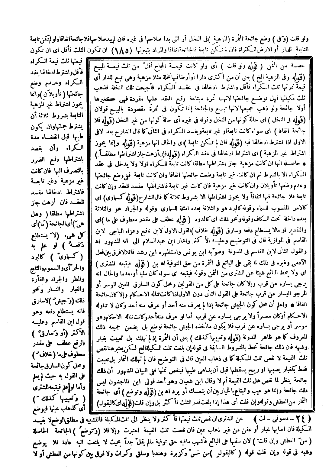 ـــــــــــــــــــــــــــــQحِصَّةٌ مِنْ الثَّمَنِ (قَوْلُهُ وَلَوْ قُلْت) أَيْ وَلَوْ كَانَتْ قِيمَةُ الْمُجَاحِ أَقَلَّ مِنْ ثُلُثِ قِيمَةِ الْمَبِيعِ (قَوْلُهُ وَفِي الْمُزْهِيَةِ إلَخْ) يَعْنِي أَنَّ مَنْ اكْتَرَى دَارًا أَوْ أَرْضًا فِيهَا نَخْلَةٌ مَثَلًا مُزْهِيَةٌ وَهِيَ تَبَعٌ لِلدَّارِ أَيْ قِيمَةُ ثَمَرَتِهَا ثُلُثُ الْكِرَاءِ فَأَقَلُّ وَاشْتَرَطَ إدْخَالَهَا فِي عَقْدِ الْكِرَاءِ فَأُجِيحَتْ تِلْكَ النَّخْلَةُ فَذَهَبَ ثُلُثُ مَكِيلَتِهَا فَهَلْ تُوضَعُ جَائِحَتُهَا لِأَنَّهَا ثَمَرَةٌ مُبْتَاعَةٌ وَقَعَ الْعَقْدُ عَلَيْهَا مُفْرَدَةً فَهِيَ كَغَيْرِهَا أَوْ لَا جَائِحَةَ وَلَوْ ذَهَبَ جَمِيعُهَا لِأَنَّهَا تَبَعٌ وَالْجَائِحَةُ إنَّمَا تَكُونُ فِي ثَمَرَةٍ مَقْصُورَةٍ بِالْبَيْعِ قَوْلَانِ (قَوْلُهُ فِي النَّخْلِ) أَيْ حَالَةَ كَوْنِهَا مِنْ النَّخْلِ وَقَوْلُهُ فِي غَيْرِهِ أَيْ حَالَةَ كَوْنِهَا مِنْ غَيْرِ النَّخْلِ (قَوْلُهُ فَلَا جَائِحَةَ اتِّفَاقًا) أَيْ سَوَاءٌ كَانَتْ تَابِعَةً أَوْ غَيْرَ تَابِعَةٍ وَيَفْسُدُ الْكِرَاءُ فِي الثَّانِي كَمَا قَالَ الشَّارِحُ بَعْدَ لَا فِي الْأَوَّلِ إذَا اشْتَرَطَ إدْخَالَهَا فِيهِ (قَوْلُهُ فَإِنْ لَمْ تَكُنْ تَابِعَةً) أَيْ وَالْحَالُ أَنَّهَا مُزْهِيَةٌ (قَوْلُهُ وَإِنَّمَا يَجُوزُ اشْتِرَاطُ غَيْرِ الْمُزْهِيَةِ) أَيْ اشْتِرَاطُ إدْخَالِهَا فِي عَقْدِ الْكِرَاءِ (قَوْلُهُ فَإِنْ أَزْهَتْ جَازَ اشْتِرَاطُهَا مُطْلَقًا) حَاصِلُهُ أَنَّهَا إنْ كَانَتْ مُزْهِيَةً جَازَ اشْتِرَاطُهَا مُطْلَقًا كَانَتْ تَابِعَةً لِلْكِرَاءِ أَوْ لَا وَلَا يَدْخُلُ فِي عَقْدِ الْكِرَاءِ إلَّا بِالشَّرْطِ ثُمَّ إنْ كَانَتْ غَيْرَ تَابِعَةٍ وُضِعَتْ جَائِحَتُهَا اتِّفَاقًا وَإِنْ كَانَتْ تَابِعَةً فَفِي وَضْعِ جَائِحَتِهَا وَعَدَمِ وَضْعِهَا تَأْوِيلَانِ وَإِنْ كَانَتْ غَيْرَ مُزْهِيَةٍ فَإِنْ كَانَتْ غَيْرَ تَابِعَةٍ فَاشْتِرَاطُهَا مُفْسِدٌ لِلْعَقْدِ وَإِنْ كَانَتْ تَابِعَةً فَلَا جَائِحَةَ فِيهَا اتِّفَاقًا وَلَا يَجُوزُ اشْتِرَاطُهَا إلَّا بِشُرُوطٍ ثَلَاثَةٍ كَمَا قَالَ الشَّارِحُ (قَوْلُهُ كَسَمَاوِيٍّ) أَيْ كَالْأَمْرِ الْمَنْسُوبِ لِلسَّمَاءِ وَقَوْلُهُ كَالْبَرْدِ هُوَ وَالثَّلَاثَةُ بَعْدَهُ أَمْثِلَةٌ لِلسَّمَاوِيِّ وَقَوْلُهُ وَالْجَرَادُ هُوَ وَالثَّلَاثَةُ بَعْدَهُ دَاخِلَةٌ تَحْتَ الْكَافِ وَقَوْلُهُ وَنَحْوُ ذَلِكَ أَيْ كَالدُّودِ (قَوْلُهُ عَطْفٌ عَلَى مُقَدَّرٍ مَعْطُوفٍ عَلَى مَا) أَيْ وَالتَّقْدِيرُ أَوْ مَا لَا يُسْتَطَاعُ دَفْعُهُ وَسَارِقٌ (قَوْلُهُ خِلَافٌ) الْقَوْلُ الْأَوَّلُ لِابْنِ نَافِعٍ وَعَزَاهُ الْبَاجِيَّ لِابْنِ الْقَاسِمِ فِي الْمَوَّازِيَّةِ قَالَ فِي التَّوْضِيحِ وَعَلَيْهِ الْأَكْثَرُ وَأَشَارَ ابْنُ عَبْدِ السَّلَامِ إلَى أَنَّهُ الْمَشْهُورُ اهـ وَالْقَوْلُ الثَّانِي لِابْنِ الْقَاسِمِ فِي الْمُدَوَّنَةِ وَصَوَّبَهُ ابْنُ يُونُسَ وَاسْتَظْهَرَهُ ابْنُ رُشْدٍ قَائِلًا لَا فَرْقَ بَيْنَ فِعْلِ الْآدَمِيِّ وَغَيْرِهِ فِي ذَلِكَ لِمَا بَقِيَ عَلَى الْبَائِعِ فِي الثَّمَرَةِ مِنْ حَقِّ التَّوْفِيَةِ اهـ بْن (قَوْلُهُ فَيَتْبَعُهُ الْمُشْتَرِي) أَيْ وَلَا يَحُطُّ الْبَائِعُ شَيْئًا عَنْ الْمُشْتَرِي مِنْ الثَّمَنِ وَقَوْلُهُ فَيَتْبَعُهُ أَيْ سَوَاءٌ كَانَ مَلِيًّا أَوْ مُعْدِمًا وَالْحَالُ أَنَّهُ يُرْجَى يَسَارُهُ عَنْ قُرْبٍ وَإِلَّا كَانَ جَائِحَةً عَلَى كُلٍّ مِنْ الْقَوْلَيْنِ وَمَحَلُّ كَوْنِ السَّارِقِ الْمُعَيَّنِ الْمُوسِرِ أَوْ الْمَرْجُوِّ الْيَسَارِ عَنْ قُرْبٍ جَائِحَةً عَلَى الْقَوْلِ الثَّانِي دُونَ الْأَوَّلِ إذَا كَانَتْ تَنَالُهُ الْأَحْكَامُ وَ