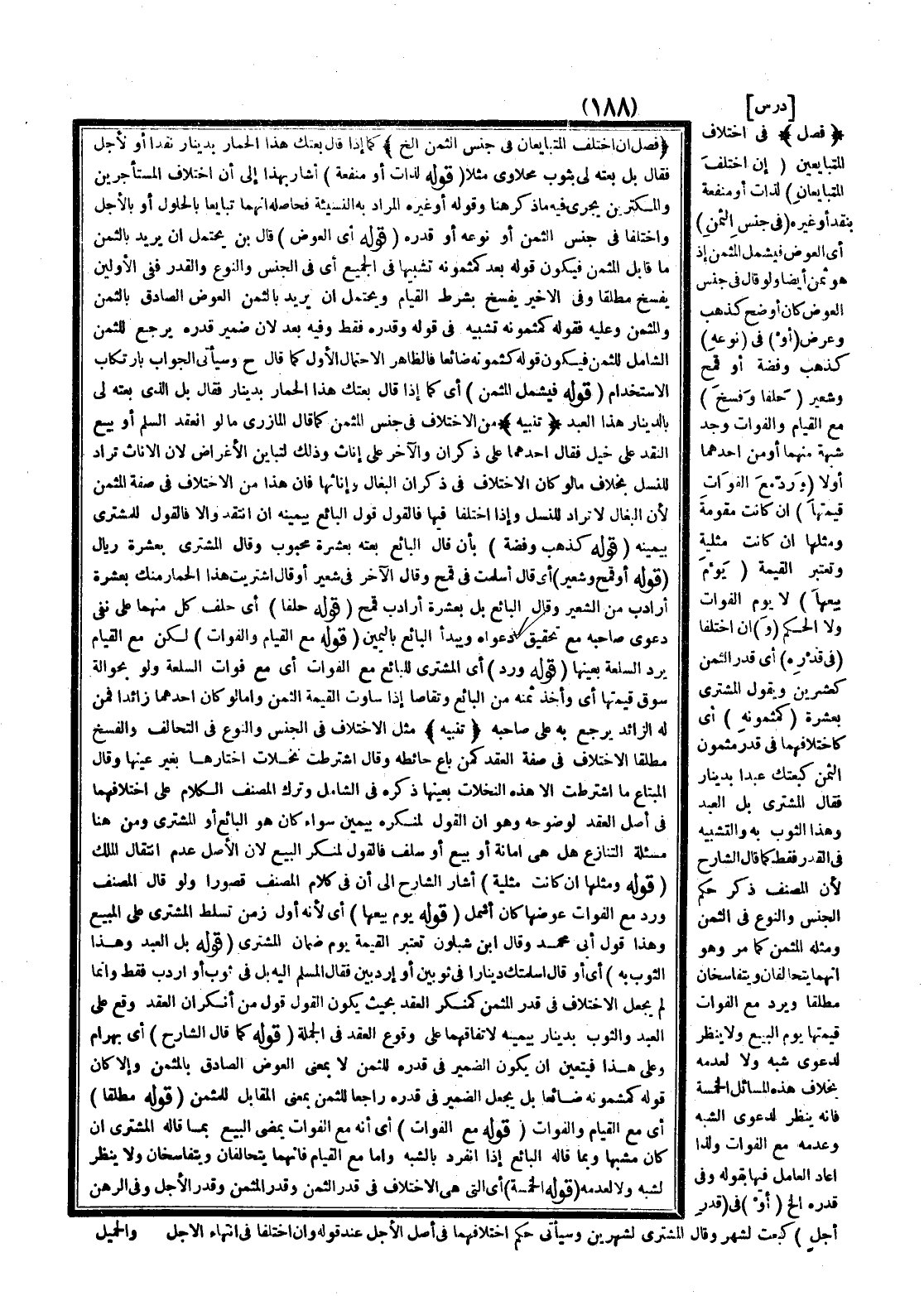 دَرْسٌ) {فَصْلٌ} فِي اخْتِلَافِ الْمُتَبَايِعَيْنِ (إنْ اخْتَلَفَ الْمُتَبَايِعَانِ) لِذَاتٍ أَوْ مَنْفَعَةٍ بِنَقْدٍ أَوْ غَيْرِهِ (فِي جِنْسِ الثَّمَنِ) أَيْ الْعِوَضِ فَيَشْمَلُ الْمُثَمَّنَ إذْ هُوَ ثَمَنٌ أَيْضًا وَلَوْ قَالَ فِي جِنْسِ الْعِوَضِ كَانَ أَوْضَحَ كَذَهَبٍ وَعَرْضٍ (أَوْ) فِي (نَوْعِهِ) كَذَهَبٍ وَفِضَّةٍ أَوْ قَمْحٍ وَشَعِيرٍ (حَلَفَا وَفُسِخَ) مَعَ الْقِيَامِ وَالْفَوَاتِ وَجَدَ شُبْهَةً مِنْهُمَا أَوْ مِنْ أَحَدِهِمَا أَوْ لَا (وَرَدَّ مَعَ الْفَوَاتِ قِيمَتَهَا) إنْ كَانَتْ مُقَوَّمَةً وَمِثْلَهَا إنْ كَانَتْ مِثْلِيَّةً وَتُعْتَبَرُ الْقِيمَةُ (يَوْمَ بَيْعِهَا) لَا يَوْمَ الْفَوَاتِ وَلَا الْحُكْمِ (وَ) إنْ اخْتَلَفَا (فِي قَدْرِهِ) أَيْ قَدْرِ الثَّمَنِ كَعِشْرِينَ وَيَقُولُ الْمُشْتَرِي بِعَشَرَةٍ (كَمَثْمُونِهِ) أَيْ كَاخْتِلَافِهِمَا فِي قَدْرِ مَثْمُونِ الثَّمَنِ كَبِعْتُكَ عَبْدًا بِدِينَارٍ فَقَالَ الْمُشْتَرِي بَلْ الْعَبْدَ وَهَذَا الثَّوْبَ بِهِ، وَالتَّشْبِيهُ فِي الْقَدْرِ فَقَطْ كَمَا قَالَ الشَّارِحُ لِأَنَّ الْمُصَنِّفَ ذَكَرَ حُكْمَ الْجِنْسِ وَالنَّوْعِ فِي الثَّمَنِ وَمِثْلُهُ الْمُثَمَّنُ كَمَا مَرَّ وَهُوَ أَنَّهُمَا يَتَحَالَفَانِ وَيَتَفَاسَخَانِ مُطْلَقًا وَيَرُدُّ مَعَ الْفَوَاتِ قِيمَتَهَا يَوْمَ الْبَيْعِ وَلَا يُنْظَرُ لِدَعْوَى شَبَهٍ وَلَا لِعَدَمِهِ بِخِلَافِ هَذِهِ الْمَسَائِلِ الْخَمْسَةِ فَإِنَّهُ يُنْظَرُ لِدَعْوَى الشَّبَهِ وَعَدَمِهِ مَعَ الْفَوَاتِ وَلِذَا أَعَادَ الْعَامِلَ فِيهَا بِقَوْلِهِ وَفِي قَدْرِهِ إلَخْ (أَوْ) فِي (قَدْرٍ أُجِّلَ) كَبِعْتُ لِشَهْرٍ وَقَالَ الْمُشْتَرِي لِشَهْرَيْنِ وَسَيَأْتِي حُكْمُ اخْتِلَافِهِمَا فِي أَصْلِ الْأَجَلِ عِنْدَ قَوْلِهِ وَإِنْ اخْتَلَفَا فِي انْتِهَاءِ الْأَجَلِ