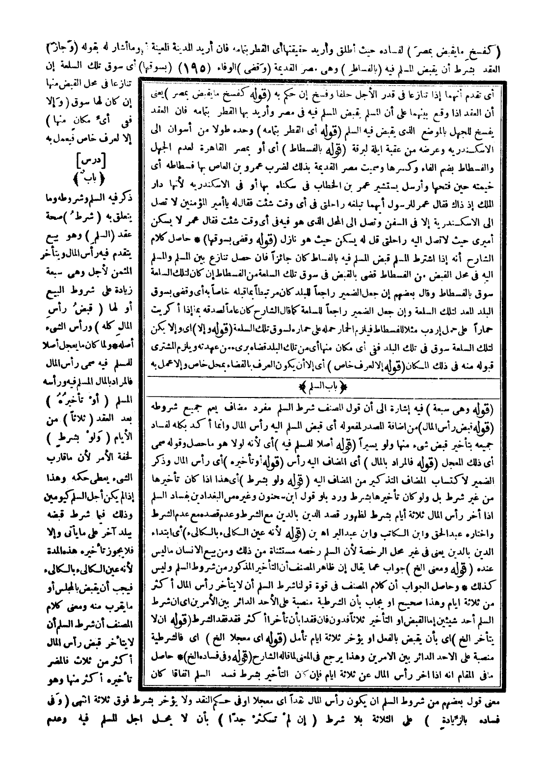 (دَرْسٌ) {بَابٌ} ذُكِرَ فِيهِ السَّلَمُ وَشُرُوطُهُ وَمَا يَتَعَلَّقُ بِهِ (شَرْطُ) صِحَّةِ عَقْدِ (السَّلَمِ) وَهُوَ بَيْعٌ يَتَقَدَّمُ فِيهِ رَأْسُ الْمَالِ وَيَتَأَخَّرُ الْمُثَمَّنُ لِأَجَلٍ وَهِيَ سَبْعَةٌ زِيَادَةً عَلَى شُرُوطِ الْبَيْعِ أَوَّلُهَا (قَبْضُ رَأْسِ الْمَالِ كُلِّهِ) وَرَأْسُ الشَّيْءِ أَصْلُهُ وَلَمَّا كَانَ مَا يُعَجَّلُ أَصْلًا لِلْمُسْلَمِ فِيهِ سُمِّيَ رَأْسَ الْمَالِ فَالْمُرَادُ بِالْمَالِ الْمُسْلَمُ فِيهِ وَرَأْسُهُ الْمُسْلَمُ (أَوْ تَأْخِيرُهُ) بَعْدَ الْعَقْدِ (ثَلَاثًا) مِنْ الْأَيَّامِ (وَلَوْ بِشَرْطٍ) لِخِفَّةِ الْأَمْرِ لِأَنَّ مَا قَارَبَ الشَّيْءَ يُعْطَى حُكْمُهُ وَهَذَا إذَا لَمْ يَكُنْ أَجَلُ السَّلَمِ كَيَوْمَيْنِ وَذَلِكَ فِيمَا شُرِطَ قَبْضُهُ بِبَلَدٍ آخَرَ عَلَى مَا يَأْتِي وَإِلَّا فَلَا يَجُوزُ تَأْخِيرُهُ هَذِهِ الْمُدَّةَ لِأَنَّهُ عَيْنُ الْكَالِئِ بِالْكَالِئِ فَيَجِبُ أَنْ يُقْبَضَ بِالْمَجْلِسِ أَوْ مَا يَقْرَبُ مِنْهُ وَمَعْنَى كَلَامِ الْمُصَنِّفِ أَنَّ شَرْطَ السَّلَمِ أَنْ لَا يَتَأَخَّرَ قَبْضُ رَأْسِ الْمَالِ أَكْثَرَ مِنْ ثَلَاثٍ فَالْمُضِرُّ تَأْخِيرُهُ أَكْثَرَ مِنْهَا وَهُوَ مَعْنَى قَوْلِ بَعْضِهِمْ مِنْ شُرُوطِ السَّلَمِ أَنْ يَكُونَ رَأْسُ الْمَالِ نَقْدًا أَيْ مُعَجَّلًا أَوْ فِي حُكْمِ النَّقْدِ وَلَا يُؤَخَّرُ بِشَرْطٍ فَوْقَ ثَلَاثَةٍ انْتَهَى (وَفِي فَسَادِهِ بِالزِّيَادَةِ) عَلَى الثَّلَاثَةِ بِلَا شَرْطٍ (إنْ لَمْ تَكْثُرْ جِدًّا) بِأَنْ لَا يَحِلَّ أَجَلُ الْمُسْلَمِ فِيهِ وَعَدَمِ
