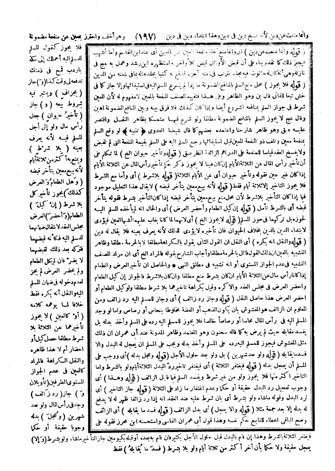 (قَوْلُهُ وَتَأْخِيرُ حَيَوَانٍ إلَخْ) لَمَّا تَكَلَّمَ عَلَى أَنَّ تَأْخِيرَ رَأْسِ الْمَالِ عَنْ الثَّلَاثَةِ الْأَيَّامِ إنْ كَانَ عَيْنًا لَا يَجُوزُ ذِكْرُ حُكْمِ تَأْخِيرِ رَأْسِ الْمَالِ عَنْ الثَّلَاثَةِ الْأَيَّامِ إذَا كَانَ غَيْرَ عَيْنٍ فَقَوْلُهُ وَتَأْخِيرُ حَيَوَانٍ أَيْ عَنْ الْأَيَّامِ الثَّلَاثَةِ (قَوْلُهُ بِلَا شَرْطٍ) أَيْ وَأَمَّا مَعَ الشَّرْطِ فَلَا يَجُوزُ التَّأْخِيرُ إلَّا ثَلَاثَةَ أَيَّامٍ فَقَطْ (قَوْلُهُ لِأَنَّهُ بَيْعُ مُعَيَّنٍ يَتَأَخَّرُ قَبْضُهُ) لَا يُقَالُ هَذَا التَّعْلِيلُ مَوْجُودٌ فِيمَا إذَا كَانَ التَّأْخِيرُ بِلَا شَرْطٍ لِأَنَّ مَحَلَّ مَنْعِ بَيْعِ مُعَيَّنٍ يَتَأَخَّرُ قَبْضُهُ إذَا كَانَ التَّأْخِيرُ بِشَرْطٍ فَقَوْله يَتَأَخَّرُ قَبْضُهُ أَيْ بِالشَّرْطِ تَأَمَّلْ (قَوْلُهُ إنْ كِيلَ الطَّعَامُ وَأُحْضِرَ الْعَرْضُ) أَيْ وَالْحَالُ أَنَّهُ لَمْ يَأْخُذْهُ الْمُسْلَمُ إلَيْهِ لِحَوْزِهِ بَلْ تَرَكَهُمَا فِي حَوْزِ الْمُسْلِمِ (قَوْلُهُ لَا يَجُوزُ إلَخْ) أَيْ لِأَنَّهُمَا لَمَّا كَانَا يَغْلِبُ عَلَيْهِمَا أَشْبَهَا الْعَيْنَ فَيُؤَدِّي لِابْتِدَاءِ الدَّيْنِ بِالدَّيْنِ بِخِلَافِ الْحَيَوَانِ فَإِنَّ تَأْخِيرَهُ لَا يُؤَدِّي لِذَلِكَ لِأَنَّهُ يُعْرَفُ بِعَيْنِهِ فَلَا يُقَالُ لَهُ دَيْنٌ (قَوْلُهُ وَالنَّقْلُ أَنَّهُ يُكْرَهُ) أَيْ النَّقْلُ أَنَّ الْقَوْلَ الثَّانِي يَقُولُ بِالْكَرَاهَةِ مُطْلَقًا لَا بِالْحُرْمَةِ مُطْلَقًا وَظَاهِرُ التَّشْبِيهِ بِالْعَيْنِ أَنَّ ذَلِكَ الْقَوْلَ قَائِلٌ بِالْحُرْمَةِ مُطْلَقًا وَأَجَابَ الشَّارِحُ بِقَوْلِهِ فَالْمُرَادُ إلَخْ أَيْ أَنَّ مُرَادَ الْمُصَنِّفِ التَّشْبِيهُ فِي عَدَمِ الْجَوَازِ الْمُسْتَوِي أَوْ أَنَّهُ تَشْبِيهٌ فِي مُطْلَقِ النَّهْيِ وَالْحَاصِلُ أَنَّ تَأْخِيرَ الْعَرْضِ وَالطَّعَامِ إذَا كَانَا رَأْسَ مَالٍ عَنْ الثَّلَاثَةِ الْأَيَّامِ إنْ كَانَ بِشَرْطٍ مُنِعَ مُطْلَقًا وَإِنْ كَانَ بِلَا شَرْطٍ فَالْجَوَازُ إنْ كِيلَ الطَّعَامُ وَأُحْضِرَ الْعَرْضُ فِي مَجْلِسِ الْعَقْدِ وَإِلَّا كُرِهَ وَقِيلَ بِكَرَاهَةِ تَأْخِيرِهِمَا بِلَا شَرْطٍ مُطْلَقًا وَلَوْ كِيلَ الطَّعَامُ أَوْ أُحْضِرَ الْعَرْضُ هَذَا حَاصِلُ النَّقْلِ