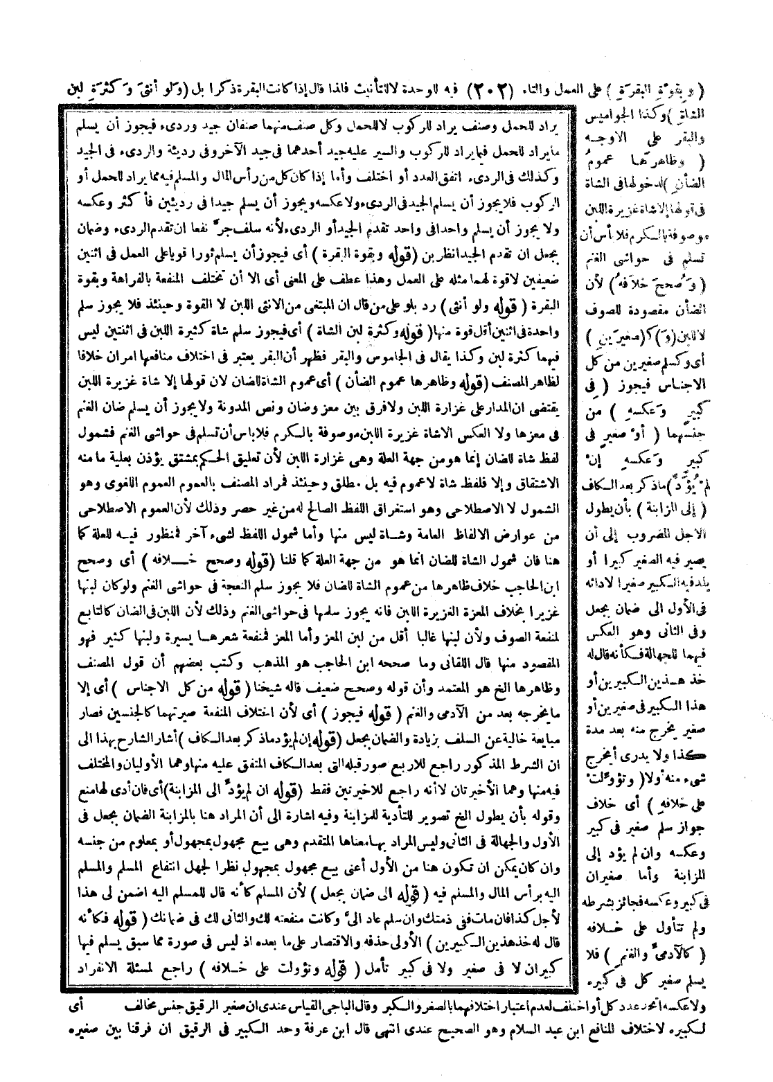 (قَوْلُهُ وَبِقُوَّةِ الْبَقَرَةِ) أَيْ فَيَجُوزُ أَنْ يُسَلِّمَ ثَوْرًا قَوِيًّا عَلَى الْعَمَلِ فِي اثْنَيْنِ ضَعِيفَيْنِ لَا قُوَّةَ لَهُمَا مِثْلُهُ عَلَى الْعَمَلِ وَهَذَا عَطْفٌ عَلَى الْمَعْنَى أَيْ إلَّا أَنْ تَخْتَلِفَ الْمَنْفَعَةُ بِالْفَرَاهَةِ وَبِقُوَّةِ الْبَقَرَةِ (قَوْلُهُ وَلَوْ أُنْثَى) رُدَّ بِلَوْ عَلَى مَنْ قَالَ أَنَّ الْمُبْتَغَى مِنْ الْأُنْثَى اللَّبَنُ لَا الْقُوَّةُ وَحِينَئِذٍ فَلَا يَجُوزُ سَلَمُ وَاحِدَةٍ فِي اثْنَيْنِ أَقَلَّ قُوَّةً مِنْهَا (قَوْلُهُ وَكَثْرَةِ لَبَنِ الشَّاةِ) أَيْ فَيَجُوزُ سَلَمُ شَاةٍ كَثِيرَةَ اللَّبَنِ فِي اثْنَتَيْنِ لَيْسَ فِيهِمَا كَثْرَةُ لَبَنٍ وَكَذَا يُقَالُ فِي الْجَامُوسِ وَالْبَقَرِ فَظَهَرَ أَنَّ الْبَقَرَ يُعْتَبَرُ فِي اخْتِلَافِ مَنَافِعِهَا أَمْرَانِ خِلَافًا لِظَاهِرِ الْمُصَنِّفِ (قَوْلُهُ وَظَاهِرُهَا عُمُومُ الضَّأْنِ) أَيْ عُمُومُ الشَّاةِ لِلضَّأْنِ لِأَنَّ قَوْلَهَا إلَّا شَاةٌ غَزِيرَةُ اللَّبَنِ يَقْتَضِي أَنَّ الْمَدَارَ عَلَى غَزَارَةِ اللَّبَنِ وَلَا فَرْقَ بَيْنَ مَعْزٍ وَضَأْنٍ وَنَصُّ الْمُدَوَّنَةِ وَلَا يَجُوزُ أَنْ يُسْلِمَ ضَأْنَ الْغَنَمِ فِي مَعْزِهَا وَلَا الْعَكْسُ إلَّا شَاةٌ غَزِيرَةُ اللَّبَنِ مَوْصُوفَةٌ بِالْكَرَمِ فَلَا بَأْسَ أَنْ تُسْلَمَ فِي حَوَاشِي الْغَنَمِ فَشُمُولُ لَفْظِ شَاةٍ لِلضَّأْنِ إنَّمَا هُوَ مِنْ جِهَةِ الْعِلَّةِ وَهِيَ غَزَارَةُ اللَّبَنِ لِأَنَّ تَعْلِيقَ الْحُكْمِ بِمُشْتَقٍّ يُؤْذِنُ بِعِلِّيَّةِ مَا مِنْهُ الِاشْتِقَاقُ وَإِلَّا فَلَفْظُ شَاةٍ لَا عُمُومَ فِيهِ بَلْ مُطْلَقٌ وَحِينَئِذٍ فَمُرَادُ الْمُصَنِّفِ بِالْعُمُومِ الْعُمُومُ اللُّغَوِيُّ وَهُوَ الشُّمُولُ لَا الِاصْطِلَاحِيُّ وَهُوَ اسْتِغْرَاقُ اللَّفْظِ الصَّالِحَ لَهُ مِنْ غَيْرِ حَصْرٍ وَذَلِكَ لِأَنَّ الْعُمُومَ الِاصْطِلَاحِيَّ مِنْ عَوَارِضِ الْأَلْفَاظِ الْعَامَّةِ وَشَاةٌ لَيْسَ مِنْهَا وَأَمَّا شُمُولُ اللَّفْظِ لِشَيْءٍ آخَرَ فَمَنْظُورٌ فِيهِ لِلْعِلَّةِ كَمَا هُنَا فَإِنَّ شُمُولَ الشَّاةِ لِلضَّأْنِ إنَّمَا هُوَ مِنْ جِهَةِ الْعِلَّةِ كَمَا قُلْنَا (قَوْلُهُ وَصُحِّحَ خِلَافُهُ) أَيْ وَصَحَّحَ ابْنُ الْحَاجِبِ خِلَافَ ظَاهِرِهَا مِنْ عُمُومِ الشَّاةِ لِلضَّأْنِ فَلَا يَجُوزُ سَلَمُ النَّعْجَةِ فِي حَوَاشِي الْغَنَمِ وَلَوْ كَانَ لَبَنُهَا غَزِيرًا بِخِلَافِ الْمَعْزَةِ الْغَزِيرَةِ اللَّبَنِ فَإِنَّهُ يَجُوزُ سَلَمُهَا فِي حَوَاشِي الْغَنَمِ وَذَلِكَ لِأَنَّ اللَّبَنَ فِي الضَّأْنِ كَالتَّابِعِ لِمَنْفَعَةِ الصُّوفِ وَلِأَنَّ لَبَنَهَا غَالِبًا أَقَلُّ مِنْ لَبَنِ الْمَعْزِ وَأَمَّا الْمَعْزُ فَمَنْفَعَةُ شَعْرِهَا يَسِيرَةٌ وَلَبَنُهَا كَثِيرٌ فَهُوَ الْمَقْصُودُ مِنْهَا قَالَ اللَّقَانِيُّ وَمَا صَحَّحَهُ ابْنُ الْحَاجِبِ هُوَ الْمَذْهَبُ وَكَتَبَ بَعْضُهُمْ أَنَّ قَوْلَ الْمُصَنِّفِ وَظَاهِرُهَا إلَخْ هُوَ الْمُعْتَمَدُ وَأَنَّ قَوْلَهُ وَصُحِّحَ ضَعِيفٌ قَالَهُ شَيْخُنَا (قَوْلُهُ مِنْ كُلِّ الْأَجْنَاسِ) أَيْ إلَّا مَا يُخْرِجُهُ بَعْدُ مِنْ الْآدَمِيِّ وَالْغَنَمِ (قَوْلُهُ فَيَجُوزُ) أَيْ لِأَنَّ اخْتِلَافَ الْمَنْفَعَةِ صَيَّرَتْهُمَا كَالْجِنْسَيْنِ فَصَارَ مُبَايَعَةً خَالِيَةً عَنْ السَّلَفِ بِزِيَادَةٍ وَالضَّمَانُ بِجُعْلٍ (قَوْلُهُ إنْ لَمْ يُؤَدِّ مَا ذُكِرَ بَعْدَ الْكَافِ) أَشَارَ الشَّارِحُ بِهَذَا إلَى أَنَّ الشَّرْطَ الْمَذْكُورَ رَاجِعٌ لِلْأَرْبَعِ صُوَرٍ قَبْلَهُ الَّتِي بَعْدَ الْكَافِ الْمُتَّفَقِ عَلَيْهِ مِنْهَا وَهُمَا الْأَوَّلِيَّانِ وَالْمُخْتَلَفِ فِيهِ مِنْهَا وَهُمَا الْأَخِيرَتَانِ لَا أَنَّهُ رَاجِعٌ لِ