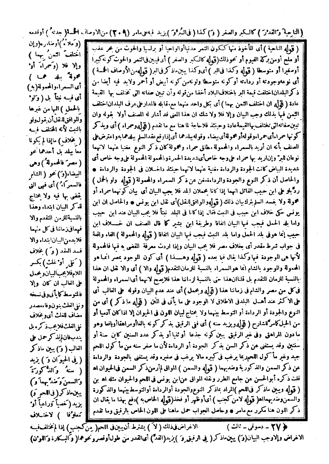 ـــــــــــــــــــــــــــــQقَوْلُهُ النَّاحِيَةَ) أَيْ الْمَأْخُوذُ مِنْهَا كَكَوْنِ التَّمْرِ مَدَنِيًّا أَوْ أَلْوَاحِيًّا أَوْ بُرُلُّسِيًّا وَالْحُوتِ مِنْ بَحْرٍ عَذْبٍ أَوْ مِلْحٍ أَوْ مِنْ بِرْكَةِ الْفَيُّومِ أَوْ نَحْوِ ذَلِكَ (قَوْلُهُ كَالْكِبَرِ وَالصِّغَرِ) أَيْ فَيُبَيِّنُ فِي التَّمْرِ وَالْحُوتِ كَوْنَهُ كَبِيرًا أَوْ صَغِيرًا أَوْ مُتَوَسِّطًا (قَوْلُهُ وَكَذَا فِي الْبُرِّ) أَيْ وَكَذَا يُبَيِّنُ مَا ذُكِرَ فِي الْبُرِّ (قَوْلُهُ مِنْ الْأَوْصَافِ الْخَمْسَةِ) أَيْ نَوْعَهُ وَجَوْدَتَهُ أَوْ رَدَاءَتَهُ أَوْ كَوْنَهُ مُتَوَسِّطًا وَلَوْنَهُ مِنْ كَوْنِهِ أَبْيَضَ أَوْ أَحْمَرَ وَلَا بُدَّ فِيهِ أَيْضًا مِنْ ذِكْرِ الْبَلَدِ إنْ اخْتَلَفَتْ قِيمَةُ الْبُرِّ بِاخْتِلَافِ الْبِلَادِ أَخْذًا مِنْ قَوْلِهِ وَأَنْ تُبَيَّنَ صِفَاتُهُ الَّتِي تَخْتَلِفُ بِهَا الْقِيمَةُ عَادَةً (قَوْلُهُ إنْ اخْتَلَفَ الثَّمَنُ بِهِمَا) أَيْ بِكُلِّ وَاحِدٍ مِنْهُمَا مَعَ مُقَابِلِهِ فَالْمَدَارُ عَلَى عُرْفِ الْبَلَدِ إنْ اخْتَلَفَ الثَّمَنُ فِيهَا بِذَلِكَ وَجَبَ الْبَيَانُ وَإِلَّا فَلَا وَلَا شَكَّ أَنَّ هَذَا الْمَعْنَى قَدْ أَشَارَ لَهُ الْمُصَنِّفُ أَوَّلًا بِقَوْلِهِ وَأَنْ تُبَيَّنَ صِفَاتُهُ الَّتِي تَخْتَلِفُ بِهَا الْقِيمَةُ عَادَةً وَحِينَئِذٍ فَلَا حَاجَةَ لِمَا هُنَا مَعَ مَا تَقَدَّمَ (قَوْلُهُ وَسَمْرَاءَ) أَيْ وَيَذْكُرُ كَوْنَهَا سَمْرَاءَ أَيْ حَمْرَاءَ وَقَوْلُهُ أَوْ مَحْمُولَةً أَيْ بَيْضَاءَ وَقَوْلُهُ بِبَلَدٍ هُمَا أَيْ إذَا وَقَعَ عَقْدُ السَّلَمِ بِبَلَدٍ هُمَا بِهِ وَاعْتُرِضَ عَلَى الْمُصَنِّفِ بِأَنَّهُ إنْ أُرِيدَ بِالسَّمْرَاءِ وَالْمَحْمُولَةِ مُطْلَقُ سَمْرَاءَ وَمَحْمُولَةٍ كَانَ ذِكْرُ النَّوْعِ مُغْنِيًا عَنْهُمَا لِأَنَّهُمَا نَوْعَانِ لِلْبُرِّ وَإِنْ أُرِيدَ بِهَا سَمْرَاءُ عَلَى وَجْهٍ خَاصٍّ أَيْ شَدِيدَةِ الْحُمْرَةِ وَبِالْمَحْمُولَةِ الْمَحْمُولَةُ عَلَى وَجْهٍ خَاصٍّ أَيْ شَدِيدَةِ الْبَيَاضِ كَانَتْ الْجَوْدَةُ وَالرَّدَاءَةُ مُغْنِيَةً عَنْهُمَا لِأَنَّهُمَا حِينَئِذٍ دَاخِلَانِ فِي الْجَوْدَةِ وَالرَّدَاءَةِ وَالْحَاصِلُ أَنَّ ذِكْرَ النَّوْعِ وَالْجَوْدَةِ وَالرَّدَاءَةِ مُغْنٍ عَنْ ذِكْرِ السَّمْرَاءِ وَالْمَحْمُولَةِ (قَوْلُهُ وَلَوْ بِالْحِمْلِ) رُدَّ بِلَوْ عَلَى ابْنِ حَبِيبٍ الْقَائِلِ أَنَّهُمَا إذَا كَانَا يُحْمَلَانِ لِبَلَدٍ فَلَا يَجِبُ الْبَيَانُ أَيْ بَيَانُ كَوْنِهِمَا سَمْرَاءَ أَوْ مَحْمُولَةً وَلَا يَفْسُدُ السَّلَمُ بِتَرْكِ بَيَانِ ذَلِكَ (قَوْلُهُ وَالْمُوَافِقُ لِلنَّقْلِ) أَيْ نَقْلِ ابْنِ يُونُسَ وَالْحَاصِلُ أَنَّ ابْنَ يُونُسَ حَكَى خِلَافَ ابْنِ حَبِيبٍ فِي النَّبْتِ فَقَالَ إذَا كَانَا فِي الْبَلَدِ نَبْتًا فَلَا يَجِبُ الْبَيَانُ عِنْدَ ابْنِ حَبِيبٍ وَأَمَّا بَلَدُ الْحَمْلِ فَيَجِبُ فِيهَا الْبَيَانُ اتِّفَاقًا وَطَرِيقَةُ ابْنِ بَشِيرٍ كَمَا قَالَ الْمُصَنِّفُ أَنَّ خِلَافَ ابْنِ حَبِيبٍ إنَّمَا هُوَ فِي بَلَدِ الْحِمْلِ وَأَمَّا بَلَدُ النَّبْتِ فَيَجِبُ فِيهَا الْبَيَانُ اتِّفَاقًا (قَوْلُهُ فَالْمَحْمُولَةُ) الْفَاءُ وَاقِعَةٌ فِي جَوَابِ شَرْطٍ مُقَدَّرٍ أَيْ بِخِلَافِ مِصْرَ فَلَا يَجِبُ الْبَيَانُ وَإِذَا أَرَدْت مَعْرِفَةَ الْمَقْضِيِّ بِهِ فِيهَا فَالْمَحْمُولَةُ لِأَنَّهَا هِيَ الْمَوْجُودَةُ فِيهَا وَكَذَا يُقَالُ فِيمَا بَعْدَهُ.