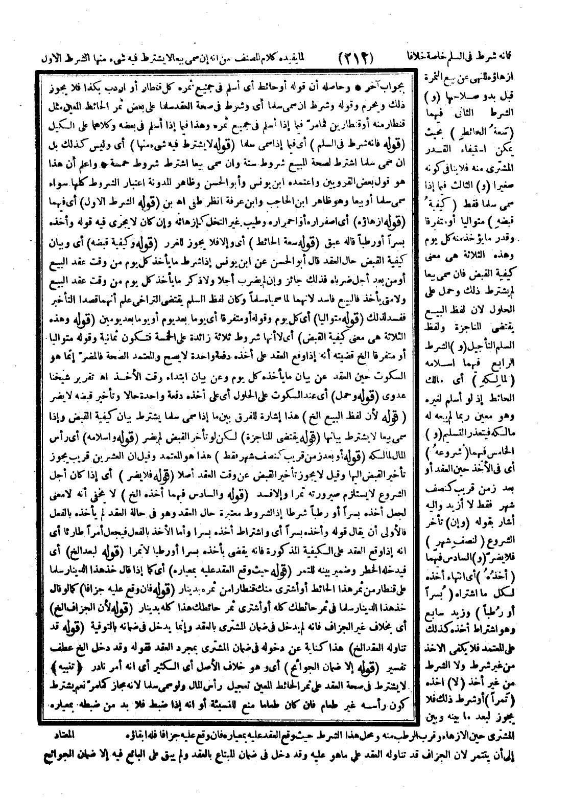 (قَوْلُهُ فَإِنَّهُ شَرْطٌ فِي السَّلَمِ) أَيْ فِيمَا إذَا سُمِّيَ سَلَمًا (قَوْلُهُ لَا يُشْتَرَطُ فِيهِ شَيْءٌ مِنْهَا) أَيْ وَلَيْسَ كَذَلِكَ بَلْ إنْ سَمَّى سَلَمًا اُشْتُرِطَ لِصِحَّةِ الْمَبِيعِ شُرُوطٌ سِتَّةٌ وَإِنْ سُمِّيَ بَيْعًا اُشْتُرِطَ شُرُوطٌ خَمْسَةٌ وَاعْلَمْ أَنَّ هَذَا هُوَ قَوْلُ بَعْضِ الْقَرَوِيِّينَ وَاعْتَمَدَهُ ابْنُ يُونُسَ وَأَبُو الْحَسَنِ وَظَاهِرُ الْمُدَوَّنَةِ اعْتِبَارُ الشُّرُوطِ كُلِّهَا سَوَاءٌ سُمِّيَ سَلَمًا أَوْ بَيْعًا وَهُوَ ظَاهِرُ ابْنِ الْحَاجِبِ وَابْنِ عَرَفَةَ اُنْظُرْ طفي اهـ بْن (قَوْلُهُ الشَّرْطُ الْأَوَّلُ) أَيْ فِيهِمَا (قَوْلُهُ إزْهَاؤُهُ) أَيْ اصْفِرَارُهُ أَوْ احْمِرَارُهُ وَطِيبُ غَيْرِ النَّخْلِ كَإِزْهَائِهِ وَإِنْ كَانَ لَا يَجْرِي فِيهِ قَوْلُهُ وَأَخَذَهُ بُسْرًا أَوْ رُطَبًا قَالَهُ عبق (قَوْلُهُ سَعَةُ الْحَائِطِ) أَيْ وَإِلَّا فَلَا يَجُوزُ لِلْغَرَرِ (قَوْلُهُ وَكَيْفِيَّةُ قَبْضِهِ) أَيْ وَبَيَانُ كَيْفِيَّةِ الْقَبْضِ حَالَ الْعَقْدِ قَالَ أَبُو الْحَسَنِ عَنْ ابْنِ يُونُسَ إذَا شُرِطَ مَا يَأْخُذُ كُلَّ يَوْمٍ مِنْ وَقْتِ عَقْدِ الْبَيْعِ أَوْ مِنْ بَعْدِ أَجَلٍ ضَرَبَاهُ فَذَلِكَ جَائِزٌ وَإِنْ لَمْ يَضْرِبْ أَجَلًا وَلَا ذَكَرَ مَا يَأْخُذُ كُلَّ يَوْمٍ مِنْ وَقْتِ عَقْدِ الْبَيْعِ وَلَا مَتَى يَأْخُذُ فَالْبَيْعُ فَاسِدٌ لِأَنَّهُمَا لَمَّا سَمَّيَاهُ سَلَمًا وَكَانَ لَفْظُ السَّلَمِ يَقْتَضِي التَّرَاخِي عُلِمَ أَنَّهُمَا قَصَدَا التَّأْخِيرَ فَفَسَدَ لِذَلِكَ.