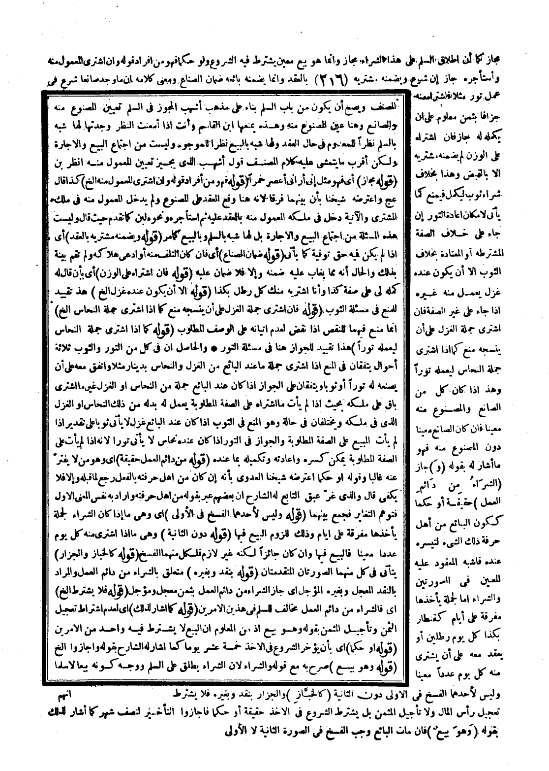 (قَوْلُهُ كَمَا إذْ اشْتَرَى جُمْلَةَ النُّحَاسِ لِيَعْمَلَهُ تَوْرًا) هَذَا تَقْيِيدٌ لِلْجَوَازِ هُنَا فِي مَسْأَلَةِ التَّوْرِ وَالْحَاصِلُ أَنَّ فِي كُلٍّ مِنْ التَّوْرِ وَالثَّوْبِ ثَلَاثَةَ أَحْوَالٍ يَتَّفِقَانِ فِي الْمَنْعِ إذَا اشْتَرَى جُمْلَةَ مَا عِنْدَ الْبَائِعِ مِنْ الْغَزْلِ وَالنُّحَاسِ بِدِينَارٍ مَثَلًا وَاتَّفَقَ مَعَهُ عَلَى أَنْ يَصْنَعَهُ لَهُ تَوْرًا أَوْ ثَوْبًا وَيَتَّفِقَانِ عَلَى الْجَوَازِ إذَا كَانَ عِنْدَ الْبَائِعِ جُمْلَةٌ مِنْ النُّحَاسِ أَوْ الْغَزْلِ غَيْرُ مَا اشْتَرَى بَاقٍ عَلَى مِلْكِهِ بِحَيْثُ إذَا لَمْ يَأْتِ مَا اشْتَرَاهُ عَلَى الصِّفَةِ الْمَطْلُوبَةِ يَعْمَلُ لَهُ بَدَلُهُ مِنْ ذَلِكَ النُّحَاسِ أَوْ الْغَزْلِ الَّذِي فِي مِلْكِهِ وَيَخْتَلِفَانِ فِي حَالَةٍ وَهُوَ الْمَنْعُ فِي الثَّوْبِ إذَا كَانَ عِنْدَ الْبَائِعِ غَزْلٌ لَا يَأْتِي ثَوْبًا عَلَى تَقْدِيرِ إذَا لَمْ يَأْتِ الْمَبِيعُ عَلَى الصِّفَةِ الْمَطْلُوبَةِ وَالْجَوَازُ فِي التَّوْرِ إذَا كَانَ عِنْدَهُ نُحَاسٌ لَا يَأْتِي تَوْرًا لِأَنَّهُ إذَا لَمْ يَأْتِ عَلَى الصِّفَةِ الْمَطْلُوبَةِ يُمْكِنُ كَسْرُهُ وَإِعَادَتُهُ وَتَكْمِيلُهُ بِمَا عِنْدَهُ.