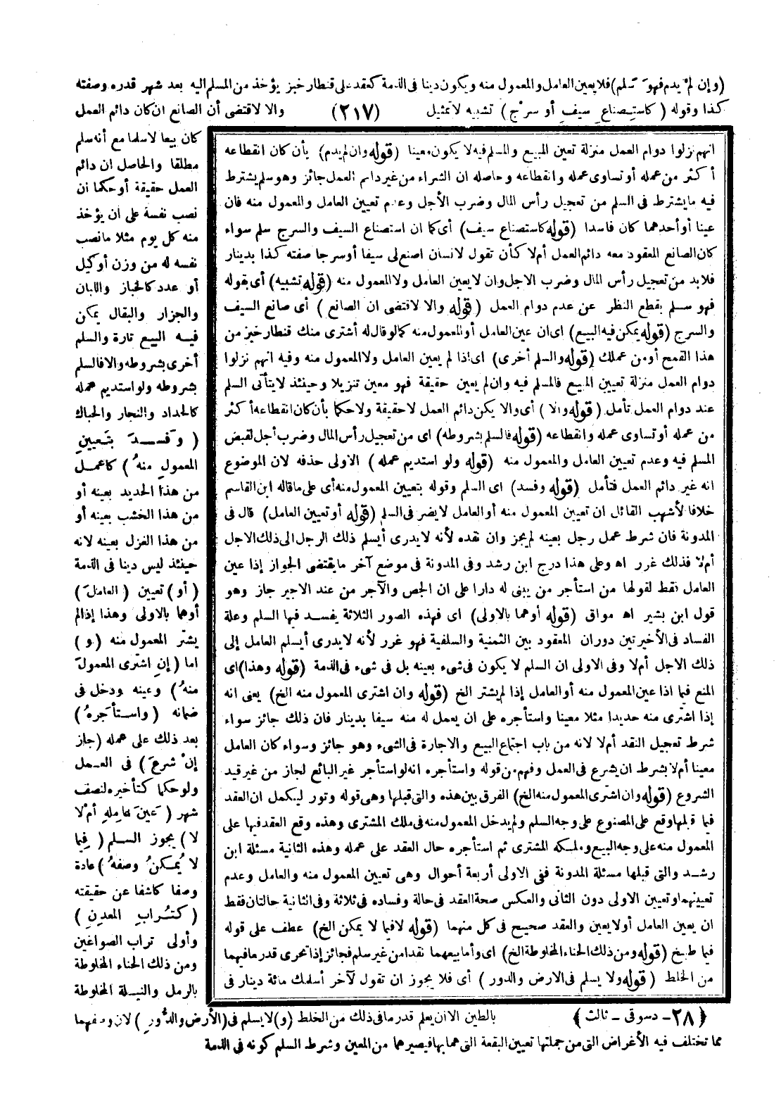 ـــــــــــــــــــــــــــــQأَنَّهُمْ نَزَّلُوا دَوَامَ الْعَمَلِ مَنْزِلَةَ تَعَيُّنِ الْمَبِيعِ وَالْمُسْلَمُ فِيهِ لَا يَكُونُ مُعَيَّنًا (قَوْلُهُ وَإِنْ لَمْ يَدُمْ) بِأَنْ كَانَ انْقِطَاعُهُ أَكْثَرَ مِنْ عَمَلِهِ أَوْ تَسَاوَى عَمَلُهُ وَانْقِطَاعُهُ وَحَاصِلُهُ أَنَّ الشِّرَاءَ مِنْ غَيْرِ دَائِمِ الْعَمَلِ جَائِزٌ وَهُوَ سَلَمٌ يُشْتَرَطُ فِيهِ مَا يُشْتَرَطُ فِي السَّلَمِ مِنْ تَعْجِيلِ رَأْسِ الْمَالِ وَضَرْبِ الْأَجَلِ وَعَدَمِ تَعْيِينِ الْعَامِلِ وَالْمَعْمُولِ مِنْهُ فَإِنْ عُيِّنَا أَوْ أَحَدُهُمَا كَانَ فَاسِدًا (قَوْلُهُ كَاسْتِصْنَاعِ سَيْفٍ) أَيْ كَمَا أَنَّ اسْتِصْنَاعَ السَّيْفِ وَالسَّرْجِ سَلَمٌ سَوَاءٌ كَانَ الصَّانِعُ الْمَعْقُودُ مَعَهُ دَائِمَ الْعَمَلِ أَمْ لَا كَأَنْ تَقُولَ لِإِنْسَانٍ اصْنَعْ لِي سَيْفًا أَوْ سَرْجًا صِفَتُهُ كَذَا بِدِينَارٍ فَلَا بُدَّ مِنْ تَعْجِيلِ رَأْسِ الْمَالِ وَضَرْبِ الْأَجَلِ وَأَنْ لَا يُعَيِّنَ الْعَامِلَ وَلَا الْمَعْمُولَ مِنْهُ (قَوْلُهُ تَشْبِيهٌ) أَيْ بِقَوْلِهِ فَهُوَ سَلَمٌ بِقَطْعِ النَّظَرِ عَنْ عَدَمِ دَوَامِ الْعَمَلِ (قَوْلُهُ وَإِلَّا لَاقْتَضَى أَنَّ الصَّانِعَ) أَيْ صَانِعَ السَّيْفِ وَالسَّرْجِ (قَوْلُهُ يُمْكِنُ فِيهِ الْبَيْعُ) أَيْ أَنَّ عَيْنَ الْعَامِلِ أَوْ الْمَعْمُولِ مِنْهُ كَمَا لَوْ قَالَ لَهُ أَشْتَرِي مِنْك قِنْطَارَ خُبْزٍ مِنْ هَذَا الْقَمْحِ أَوْ مِنْ عَمَلِك (قَوْلُهُ وَالسَّلَمُ أُخْرَى) أَيْ إذَا لَمْ يُعَيِّنْ الْعَامِلَ وَلَا الْمَعْمُولَ مِنْهُ وَفِيهِ أَنَّهُمْ نَزَّلُوا دَوَامَ الْعَمَلِ مَنْزِلَةَ تَعْيِينِ الْمَبِيعِ فَالْمُسْلَمُ فِيهِ وَإِنْ لَمْ يُعَيَّنْ حَقِيقَةً فَهُوَ مُعَيَّنٌ تَنْزِيلًا وَحِينَئِذٍ لَا يَتَأَتَّى السَّلَمُ عِنْدَ دَوَامِ الْعَمَلِ تَأَمَّلْ (قَوْلُهُ وَإِلَّا) أَيْ وَإِلَّا يَكُنْ دَائِمَ الْعَمَلِ لَا حَقِيقَةً وَلَا حُكْمًا بِأَنْ كَانَ انْقِطَاعُهُ أَكْثَرَ مِنْ عَمَلِهِ أَوْ تَسَاوَى عَمَلُهُ وَانْقِطَاعُهُ (قَوْلُهُ فَالسَّلَمُ بِشُرُوطِهِ) أَيْ مِنْ تَعْجِيلِ رَأْسِ الْمَالِ وَضَرْبِ أَجَلٍ لِقَبْضِ الْمُسْلَمِ فِيهِ وَعَدَمِ تَعْيِينِ الْعَامِلِ وَالْمَعْمُولِ مِنْهُ (قَوْلُهُ وَلَوْ اُسْتُدِيمَ عَمَلُهُ) الْأَوْلَى حَذْفُهُ لِأَنَّ الْمَوْضُوعَ أَنَّهُ غَيْرُ دَائِمِ الْعَمَلِ فَتَأَمَّلْ (قَوْلُهُ وَفَسَدَ) أَيْ السَّلَمُ وَقَوْلُهُ بِتَعْيِينِ الْمَعْمُولِ مِنْهُ أَيْ عَلَى مَا قَالَهُ ابْنُ الْقَاسِمِ خِلَافًا لِأَشْهَبَ الْقَائِلِ إنَّ تَعْيِينَ الْمَعْمُولِ مِنْهُ أَوْ الْعَامِلِ لَا يَضُرُّ فِي السَّلَمِ.
