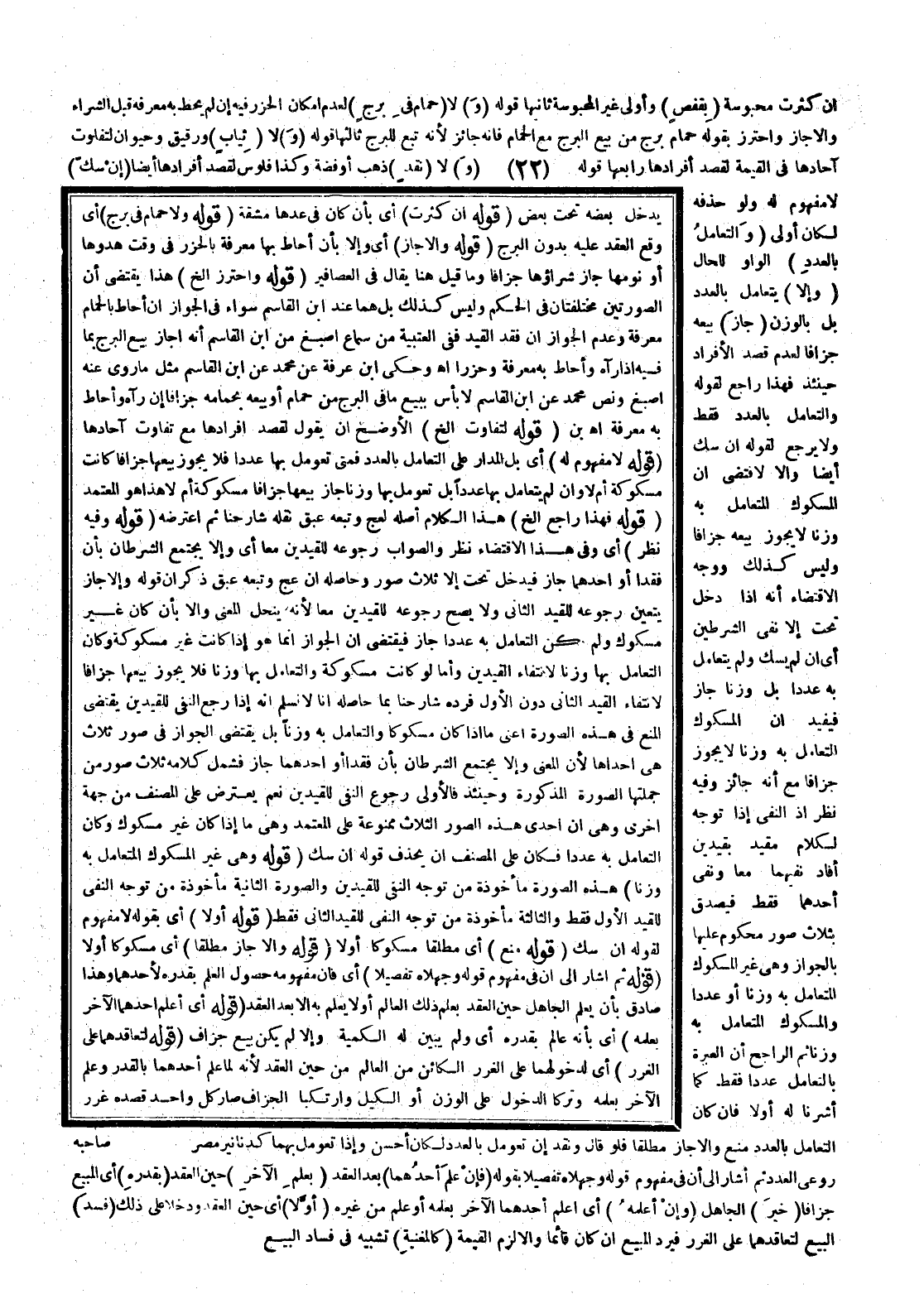 رَابِعُهَا قَوْلُهُ (و) لَا (نَقْدٍ) ذَهَبٍ أَوْ فِضَّةٍ، وَكَذَا فُلُوسٌ لِقَصْدِ أَفْرَادِهَا أَيْضًا (إنْ سُكَّ) لَا مَفْهُومَ لَهُ، وَلَوْ حَذَفَهُ لَكَانَ أَوْلَى (وَالتَّعَامُلُ بِالْعَدَدِ) الْوَاوُ لِلْحَالِ (وَإِلَّا) يَتَعَامَلُ بِالْعَدَدِ بَلْ بِالْوَزْنِ (جَازَ) بَيْعُهُ جُزَافًا لِعَدَمِ قَصْدِ الْأَفْرَادِ حِينَئِذٍ فَهَذَا رَاجِعٌ لِقَوْلِهِ وَالتَّعَامُلُ بِالْعَدَدِ فَقَطْ وَلَا يَرْجِعُ لِقَوْلِهِ إنْ سُكَّ أَيْضًا وَإِلَّا لَاقْتَضَى أَنَّ الْمَسْكُوكَ الْمُتَعَامَلَ بِهِ وَزْنًا لَا يَجُوزُ بَيْعُهُ جُزَافًا وَلَيْسَ كَذَلِكَ وَوَجْهُ الِاقْتِضَاءِ أَنَّهُ إذَا دَخَلَ تَحْتَ إلَّا نَفَى الشَّرْطَيْنِ أَيْ إنْ لَمْ يَسُكَّ وَلَمْ يُتَعَامَلْ بِهِ عَدَدًا بَلْ وَزْنًا جَازَ فَيُفِيدُ أَنَّ الْمَسْكُوكَ الْمُتَعَامَلَ بِهِ وَزْنًا لَا يَجُوزُ جُزَافًا مَعَ أَنَّهُ جَائِزٌ وَفِيهِ نَظَرٌ إذْ النَّفْيُ إذَا تَوَجَّهَ لِكَلَامٍ مُقَيَّدٍ بِقَيْدَيْنِ أَفَادَ نَفْيَهُمَا مَعًا وَنَفْيَ أَحَدِهِمَا فَقَطْ فَيَصْدُقُ بِثَلَاثِ صُوَرٍ مَحْكُومٍ عَلَيْهَا بِالْجَوَازِ وَهِيَ غَيْرُ الْمَسْكُوكِ الْمُتَعَامَلِ بِهِ وَزْنًا أَوْ عَدَدًا وَالْمَسْكُوكُ الْمُتَعَامَلُ بِهِ وَزْنًا ثُمَّ الرَّاجِحُ أَنَّ الْعِبْرَةَ بِالتَّعَامُلِ عَدَدًا فَقَطْ كَمَا أَشَرْنَا لَهُ أَوَّلًا، فَإِنْ كَانَ التَّعَامُلُ بِالْعَدَدِ مُنِعَ وَإِلَّا جَازَ مُطْلَقًا فَلَوْ قَالَ وَنَقْدٌ إنْ تُعُومِلَ بِالْعَدَدِ لَكَانَ أَحْسَنَ وَإِذَا تُعُومِلَ بِهِمَا كَدَنَانِيرِ مِصْرَ رُوعِيَ الْعَدَدُ.