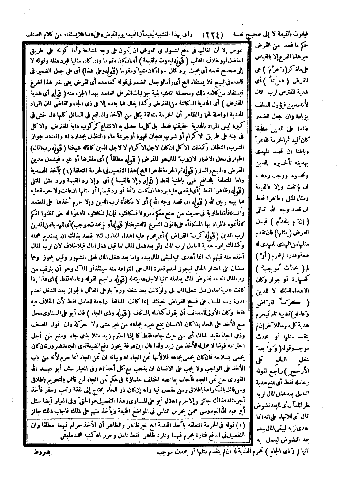 (قَوْلُهُ أَيْ هَدِيَّةُ الْمُقْتَرِضِ) أَيْ الْهَدِيَّةُ الْكَائِنَةُ مِنْ الْمُقْتَرِضِ وَكَذَا يُقَالُ فِيمَا بَعْدَهُ إلَّا فِي ذِي الْجَاهِ وَالْقَاضِي فَإِنَّ الْمُرَادَ الْهَدِيَّةُ الْوَاصِلَةُ لَهُمَا وَالظَّاهِرُ أَنَّ الْحُرْمَةَ مُتَعَلِّقَةٌ بِكُلٍّ مِنْ الْآخِذِ وَالدَّافِعِ فِي الْمَسَائِلِ كُلِّهَا قَالَ خش فِي كَبِيرِهِ لَيْسَ الْمُرَادُ بِالْهَدِيَّةِ حَقِيقَتَهَا فَقَطْ بَلْ كُلُّ مَا حَصَلَ بِهِ الِانْتِفَاعُ كَرُكُوبِ دَابَّةِ الْمُقْتَرِضِ وَالْأَكْلِ فِي بَيْتِهِ عَلَى طَرِيقِ الْإِكْرَامِ أَوْ شُرْبِ فِنْجَانِ قَهْوَةٍ أَوْ جَرْعَةِ مَاءٍ وَالتَّظَلُّلِ بِجِدَارِهِ اهـ وَالْمُعْتَمَدُ جَوَازُ الشُّرْبِ وَالتَّظَلُّلِ وَكَذَلِكَ الْأَكْلُ إنْ كَانَ لِأَجْلِ الْإِكْرَامِ لَا لِأَجْلِ الدَّيْنِ كَمَا قَالَهُ شَيْخُنَا (قَوْلُهُ لِرَبِّ الْمَالِ) إظْهَارٌ فِي مَحَلِّ الْإِضْمَارِ؛ لِأَنَّ رَبَّ الْمَالِ هُوَ الْمُقْرِضُ (قَوْلُهُ مُطْلَقًا) أَيْ مُقْتَرِضًا أَوْ غَيْرَهُ فَيَشْمَلُ مَدِينَ الْقَرْضِ وَالْبَيْعِ وَالسَّلَمِ (قَوْلُهُ ثُمَّ الْحُرْمَةُ ظَاهِرًا إلَخْ) هَذَا التَّفْصِيلُ فِي الْحُرْمَةِ الْمُتَعَلِّقَةِ بِآخِذِ الْهَدِيَّةِ، وَأَمَّا الْمُتَعَلِّقَةُ بِالدَّافِعِ فَهِيَ بَاطِنِيَّةٌ فَقَطْ (قَوْلُهُ وَإِلَّا فَالْقِيمَةُ) أَيْ وَإِلَّا رَدَّ الْقِيمَةَ وَرَدَّ مِثْلَ الْمِثْلِيِّ (قَوْلُهُ وَظَاهِرًا فَقَطْ) أَيْ فَيُقْضَى عَلَيْهِ بِرَدِّهَا إنْ كَانَتْ قَائِمَةً أَوْ رَدِّ قِيمَتِهَا أَوْ مِثْلِهَا إنْ فَاتَتْ وَلَا حُرْمَةَ عَلَيْهِ فِيمَا بَيْنَهُ وَبَيْنَ اللَّهِ (قَوْلُهُ إنْ قَصَدَ وَجْهَ اللَّهِ) أَيْ لَا مُكَافَأَةً لِرَبِّ الدَّيْنِ وَإِلَّا حَرُمَ أَخْذُهَا عَلَى الْمُعْتَمَدِ وَالْمُكَافَأَةُ الْمَطْلُوبَةُ فِي حَدِيثِ «مَنْ صَنَعَ مَعَكُمْ مَعْرُوفًا فَكَافِئُوهُ، فَإِنْ لَمْ تُكَافِئُوهُ فَادْعُوَا لَهُ حَتَّى تَظُنُّوا أَنَّكُمْ كَافَأْتُمُوهُ» فَالْمُرَادُ بِهَا الْمُكَافَأَةُ عَلَى قَانُونِ الشَّرْعِ قَالَهُ شَيْخُنَا (قَوْلُهُ أَوْ لَمْ يَحْدُثْ مُوجِبٌ) أَيْ لِلْهَدِيَّةِ مِنْ الْمَدِينِ لِرَبِّ الدَّيْنِ (قَوْلُهُ كَرَبِّ الْقِرَاضِ) أَيْ يَحْرُمُ عَلَيْهِ إهْدَاءُ الْعَامِلِ لِئَلَّا يَقْصِدَ بِذَلِكَ أَنْ يَسْتَدِيمَ عَمَلَهُ وَكَذَلِكَ يَحْرُمُ هَدِيَّةُ الْعَامِلِ لِرَبِّ الْمَالِ وَلَوْ بَعْدَ شَغْلِ الْمَالِ أَمَّا قَبْلَ شَغْلِ الْمَالِ فَبِلَا خِلَافٍ؛ لِأَنَّ لِرَبِّ الْمَالِ أَخْذَهُ مِنْهُ فَيُتَّهَمُ أَنَّهُ إنَّمَا أَهْدَى إلَيْهِ لِيَبْقَى الْمَالُ بِيَدِهِ، وَأَمَّا بَعْدَ شَغْلِ الْمَالِ فَعَلَى الْمَشْهُورِ، وَقِيلَ يَجُوزُ وَهُمَا مَبْنِيَّانِ عَلَى اعْتِبَارِ الْحَالِ فَيَجُوزُ لِعَدَمِ قُدْرَةِ الْمَالِ عَلَى انْتِزَاعِهِ مِنْهُ حِينَئِذٍ أَوْ الْمَآلِ وَهُوَ أَنْ يَتَرَقَّبَ مِنْ رَبِّ الْمَالِ أَنَّهُ بَعْدَ نَضُوضِ الْمَالِ يُعَامِلُهُ ثَانِيًا لِأَجْلِ هَدِيَّتِهِ لَهُ (قَوْلُهُ رَاجِعٌ لِقَوْلِهِ وَعَامِلِهِ فَقَطْ) أَيْ هَذَا إذَا كَانَتْ هَدِيَّةُ الْعَامِلِ قَبْلَ شَغْلِ الْمَالِ بَلْ وَلَوْ كَانَتْ بَعْد شَغْلِهِ، وَرَدَّ بِلَوْ عَلَى الْقَائِلِ بِالْجَوَازِ بَعْدَ الشَّغْلِ لِعَدَمِ قُدْرَةِ رَبِّ الْمَالِ عَلَى فَسْخِ الْقِرَاضِ. حِينَئِذٍ إنَّمَا كَانَتْ الْمُبَالَغَةُ رَاجِعَةً لِلْعَامِلِ فَقَطْ؛ لِأَنَّ الْخِلَافَ فِيهِ فَقَطْ وَكَانَ الْأَوْلَى لِلْمُصَنِّفِ أَنْ يَقُولَ كَعَامِلِهِ بِالْكَافِ.