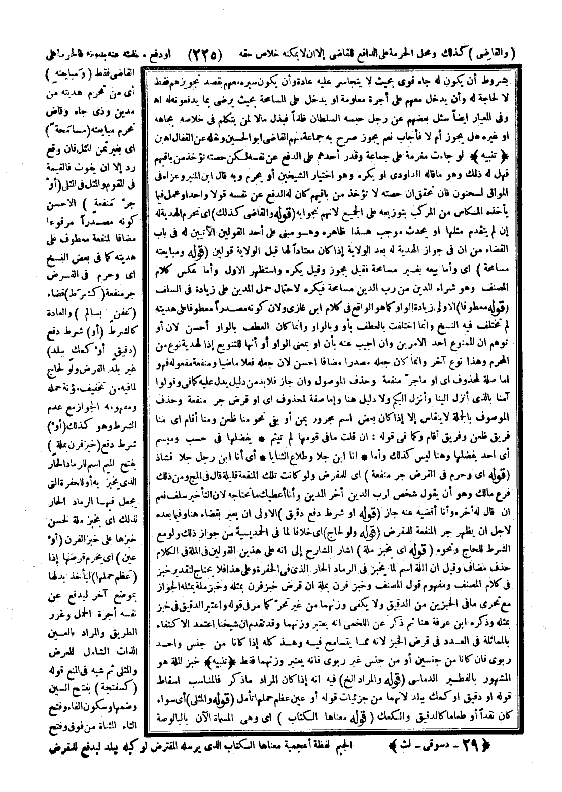 (وَالْقَاضِي) كَذَلِكَ وَمَحَلُّ الْحُرْمَةِ عَلَى الدَّافِعِ لِلْقَاضِي إلَّا أَنْ لَا يُمْكِنَهُ خَلَاصُ حَقِّهِ أَوْ دَفْعُ مَظْلِمَتِهِ عَنْهُ بِدُونِهِ فَالْحُرْمَةُ عَلَى الْقَاضِي فَقَطْ (وَمُبَايَعَتُهُ) أَيْ مَنْ تَحْرُمُ هَدِيَّتُهُ مِنْ مَدِينٍ وَذِي جَاهٍ وَقَاضٍ تَحْرُمُ مُبَايَعَتُهُ (مُسَامَحَةً) أَيْ بِغَيْرِ ثَمَنِ الْمِثْلِ فَإِنْ وَقَعَ رَدٌّ إلَّا أَنْ يَفُوتَ فَالْقِيمَةُ فِي الْمُقَوَّمِ وَالْمِثْلُ فِي الْمِثْلِيِّ (أَوْ جَرُّ مَنْفَعَةٍ) الْأَحْسَنُ كَوْنُهُ مَصْدَرًا مَرْفُوعًا مُضَافًا لِمَنْفَعَةٍ مَعْطُوفًا عَلَى هَدِيَّتِهِ كَمَا فِي بَعْضِ النُّسَخِ أَيْ وَحَرُمَ فِي الْقَرْضِ جَرُّ مَنْفَعَةٍ (كَشَرْطِ) قَضَاءِ (عَفِنٍ بِسَالِمٍ) وَالْعَادَةُ كَالشَّرْطِ (أَوْ) شَرْطِ دَفْعِ (دَقِيقٍ أَوْ كَعْكٍ بِبَلَدٍ) غَيْرِ بَلَدِ الْقَرْضِ وَلَوْ لِحَاجٍّ لِمَا فِيهِ مِنْ تَخْفِيفِ مُؤْنَةِ حَمْلِهِ، وَمَفْهُومُهُ الْجَوَازُ مَعَ عَدَمِ الشَّرْطِ وَهُوَ كَذَلِكَ (أَوْ) شَرْطِ دَفْعِ (خُبْزِ فُرْنٍ بِمَلَّةٍ) بِفَتْحِ الْمِيمِ اسْمٌ لِلرَّمَادِ الْحَارِّ الَّذِي يُخْبَزُ بِهِ أَوْ لِلْحُفْرَةِ الَّتِي يُجْعَلُ فِيهَا الرَّمَادُ الْحَارُّ لِذَلِكَ أَيْ بِخُبْزِ مَلَّةٍ لِحُسْنِ خُبْزِهَا عَلَى خُبْزِ الْفُرْنِ (أَوْ عَيْنٍ) أَيْ يَحْرُمُ قَرْضُهَا إذَا (عَظُمَ حَمْلُهَا) لِيَأْخُذَ بَدَلَهَا بِمَوْضِعٍ آخَرَ لِيَدْفَعَ عَنْ نَفْسِهِ أُجْرَةَ الْحَمْلِ وَغَرَرَ الطَّرِيقِ وَالْمُرَادُ بِالْعَيْنِ الذَّاتُ الشَّامِلُ لِلْعَرْضِ وَالْمِثْلِيِّ.