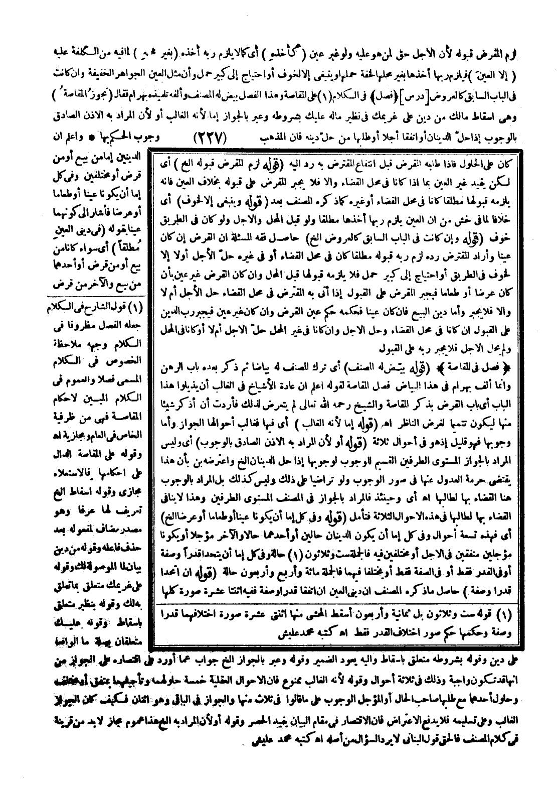 فِي الْكَلَامِ عَلَى الْمُقَاصَّةِ وَهَذَا الْفَصْلُ بَيَّضَ لَهُ الْمُصَنِّفُ وَأَلَّفَهُ تِلْمِيذُهُ بَهْرَامُ فَقَالَ (تَجُوزُ الْمُقَاصَّةُ) وَهِيَ إسْقَاطُ مَا لَكَ مِنْ دَيْنٍ عَلَى غَرِيمِك فِي نَظِيرِ مَا لَهُ عَلَيْك بِشُرُوطِهِ وَعَبَّرَ بِالْجَوَازِ إمَّا لِأَنَّهُ الْغَالِبُ أَوْ لِأَنَّ الْمُرَادَ بِهِ الْإِذْنُ الصَّادِقُ بِالْوُجُوبِ إذَا حَلَّ الدَّيْنَانِ أَوْ اتَّفَقَا أَجَلًا أَوْ طَلَبَهَا مَنْ حَلَّ دَيْنُهُ فَإِنَّ الْمَذْهَبَ وُجُوبُ الْحُكْمِ بِهَا.