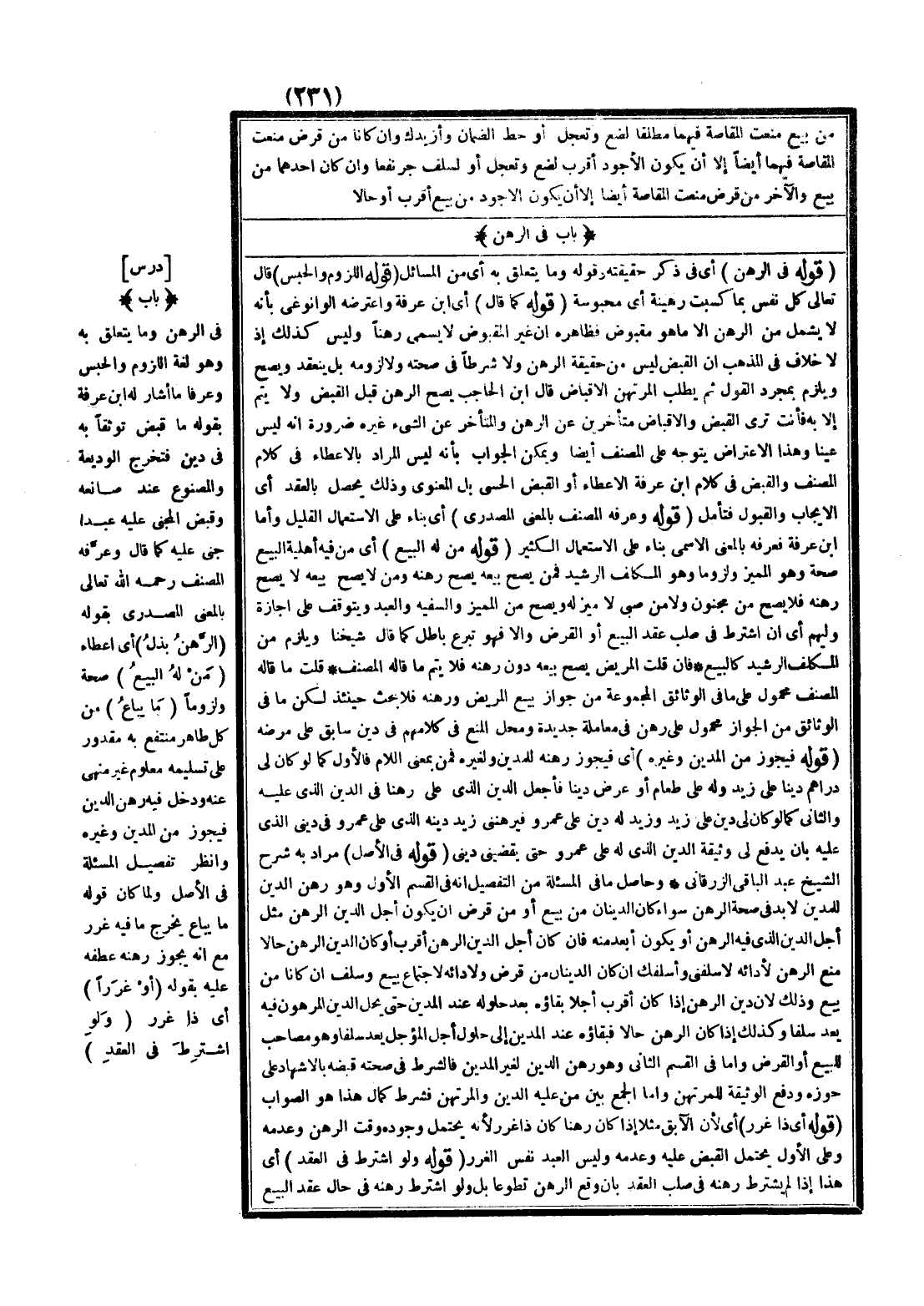 بَابٌ فِي الرَّهْنِ وَمَا يَتَعَلَّقُ بِهِ وَهُوَ لُغَةً اللُّزُومُ وَالْحَبْسُ وَعُرْفًا مَا أَشَارَ لَهُ ابْنُ عَرَفَةَ بِقَوْلِهِ مَا قُبِضَ تَوَثُّقًا بِهِ فِي دَيْنٍ فَتَخْرُجُ الْوَدِيعَةُ وَالْمَصْنُوعُ عِنْدَ صَانِعِهِ وَقَبْضُ الْمَجْنِيِّ عَلَيْهِ عَبْدًا جَنَى عَلَيْهِ كَمَا قَالَ وَعَرَّفَهُ الْمُصَنِّفُ - رَحِمَهُ اللَّهُ تَعَالَى - بِالْمَعْنَى الْمَصْدَرِيِّ بِقَوْلِهِ (الرَّهْنُ بَذْلُ) أَيْ إعْطَاءُ (مَنْ لَهُ الْبَيْعُ) صِحَّةً وَلُزُومًا (مَا يُبَاعُ) مِنْ كُلِّ طَاهِرٍ مُنْتَفَعٍ بِهِ مَقْدُورٍ عَلَى تَسْلِيمِهِ مَعْلُومٍ غَيْرِ مَنْهِيٍّ عَنْهُ، وَدَخَلَ فِيهِ رَهْنُ الدَّيْنِ فَيَجُوزُ مِنْ الْمَدِينِ وَغَيْرِهِ وَانْظُرْ تَفْصِيلَ الْمَسْأَلَةِ فِي الْأَصْلِ، وَلَمَّا كَانَ قَوْلُهُ مَا يُبَاعُ يُخْرِجُ مَا فِيهِ غَرَرٌ مَعَ أَنَّهُ يَجُوزُ رَهْنُهُ عَطَفَهُ عَلَيْهِ بِقَوْلِهِ (أَوْ غَرَرًا) أَيْ ذَا غَرَرٍ (وَلَوْ اُشْتُرِطَ فِي الْعَقْدِ)