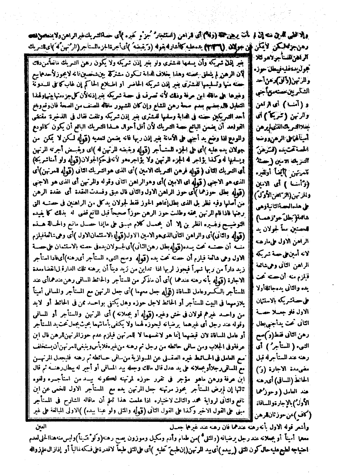 ـــــــــــــــــــــــــــــQبِغَيْرِ إذْنِ شَرِيكِهِ وَأَنْ يُسَلِّمَهَا لِلْمُشْتَرِي وَلَوْ بِغَيْرِ إذْنِ شَرِيكِهِ وَلَا يَكُونُ رَهْنُ الشَّرِيكِ مَانِعًا مِنْ ذَلِكَ؛ لِأَنَّ الرَّهْنَ لَمْ يَتَعَلَّقْ بِحِصَّتِهِ وَهَذَا بِخِلَافِ الدَّابَّةِ تَكُونُ مُشْتَرَكَةً بَيْنَ شَخْصَيْنِ فَإِنَّهُ لَا يَجُوزُ لِأَحَدِهِمَا بَيْعُ حِصَّتِهِ مِنْهَا وَتَسْلِيمُهَا لِلْمُشْتَرِي بِغَيْرِ إذْنِ شَرِيكِهِ الْحَاضِرِ أَوْ اطِّلَاعِ الْحَاكِمِ إنْ غَابَ كَمَا فِي الْمُدَوَّنَةِ وَغَيْرِهَا عَلَى مَا قَالَهُ ابْنُ عَرَفَةَ وَذَلِكَ لِأَنَّهُ تَصَرَّفَ فِي حِصَّةِ شَرِيكِهِ بِغَيْرِ إذْنِهِ؛ لِأَنَّ كُلَّ جُزْءٍ مِنْهَا بَيْنَهُمَا، وَلِهَذَا التَّعْلِيلِ قَالَ بَعْضُهُمْ بِعَدَمِ صِحَّةِ رَهْنِ الْمُشَاعِ وَإِنْ كَانَ الْمَشْهُورُ مَا قَالَهُ الْمُصَنِّفُ مِنْ الصِّحَّةِ، فَإِنْ وَقَعَ وَبَاعَ أَحَدُ الشَّرِيكَيْنِ حِصَّتَهُ فِي الدَّابَّةِ وَسَلَّمَهَا لِلْمُشْتَرِي بِغَيْرِ إذْنِ شَرِيكِهِ وَتَلِفَتْ فَقَالَ فِي الذَّخِيرَةِ مُقْتَضَى الْقَوَاعِدِ أَنْ يَضْمَنَ الْبَائِعُ حِصَّةَ الشَّرِيكِ؛ لِأَنَّ أَقَلَّ أَحْوَالِ هَذَا الشَّرِيكِ الْبَائِعِ أَنْ يَكُونَ كَالْمُودِعِ وَالْمُودِعُ إذَا وَضَعَ يَدَ أَجْنَبِيٍّ عَلَى الْأَمَانَةِ بِغَيْرِ إذْنِ رَبِّهَا فَإِنَّهُ يَضْمَنُ لِتَعَدِّيهِ (قَوْلُهُ لَكِنْ لَا يُمَكَّنُ مِنْ جَوَلَانِ يَدِهِ عَلَيْهِ) أَيْ عَلَى الْجُزْءِ الْمُسْتَأْجَرِ (قَوْلُهُ وَيَقْبِضُهُ الْمُرْتَهِنُ لَهُ) أَيْ وَيَقْبِضُ أُجْرَتَهُ الْمُرْتَهِنُ وَيُسَلِّمُهَا لَهُ وَكَذَا يُؤَاجِرُ لَهُ الْجُزْءَ الْمُرْتَهَنَ وَلَا يُؤَاجِرُهُ هُوَ؛ لِأَنَّهُ فِي حُكْمِ الْجَوَلَانِ (قَوْلُهُ وَلَوْ أَمَّنَا شَرِيكًا) أَيْ الشَّرِيكَ الثَّانِيَ (قَوْلُهُ فَرَهَنَ الشَّرِيكُ الْأَمِينَ) أَيْ الَّذِي هُوَ الشَّرِيكُ الثَّانِي (قَوْلُهُ لِلْمُرْتَهِنِ) أَيْ الَّذِي هُوَ الْأَجْنَبِيُّ (قَوْلُهُ أَيْ الْأَمِينُ) أَيْ وَهُوَ الرَّاهِنُ الثَّانِي، وَقَوْلُهُ وَالْمُرْتَهِنُ أَيْ الَّذِي هُوَ الْأَجْنَبِيُّ (قَوْلُهُ بَطَل حَوْزُهُمَا) أَيْ حَوْزُ الرَّاهِنِ الْأَوَّلِ وَالثَّانِي قَالَ عبق وَفَسَدَتْ الْعُقْدَةُ أَيْ عُقْدَةُ الرَّهْنِ مِنْ أَصْلِهَا وَفِيهِ نَظَرٌ بَلْ الَّذِي بَطَلَ إنَّمَا هُوَ الْحَوْزُ فَقَطْ لِجَوَلَانِ يَدِ كُلٍّ مِنْ الرَّاهِنَيْنِ فِي حِصَّتِهِ الَّتِي رَهَنَهَا فَإِذَا قَامَ الْمُرْتَهِنُ بِحَقِّهِ وَطَلَبَ حَوْزَ الرَّهْنِ حَوْزًا صَحِيحًا قَبْلَ الْمَانِعِ قُضِيَ لَهُ بِذَلِكَ كَمَا يُفِيدُهُ التَّوْضِيحُ وَغَيْرُهُ اُنْظُرْ بْن إلَّا أَنْ يُحْمَلَ كَلَامُ عبق عَلَى مَا إذَا حَصَلَ مَانِعٌ وَالْحَالَةُ هَذِهِ.