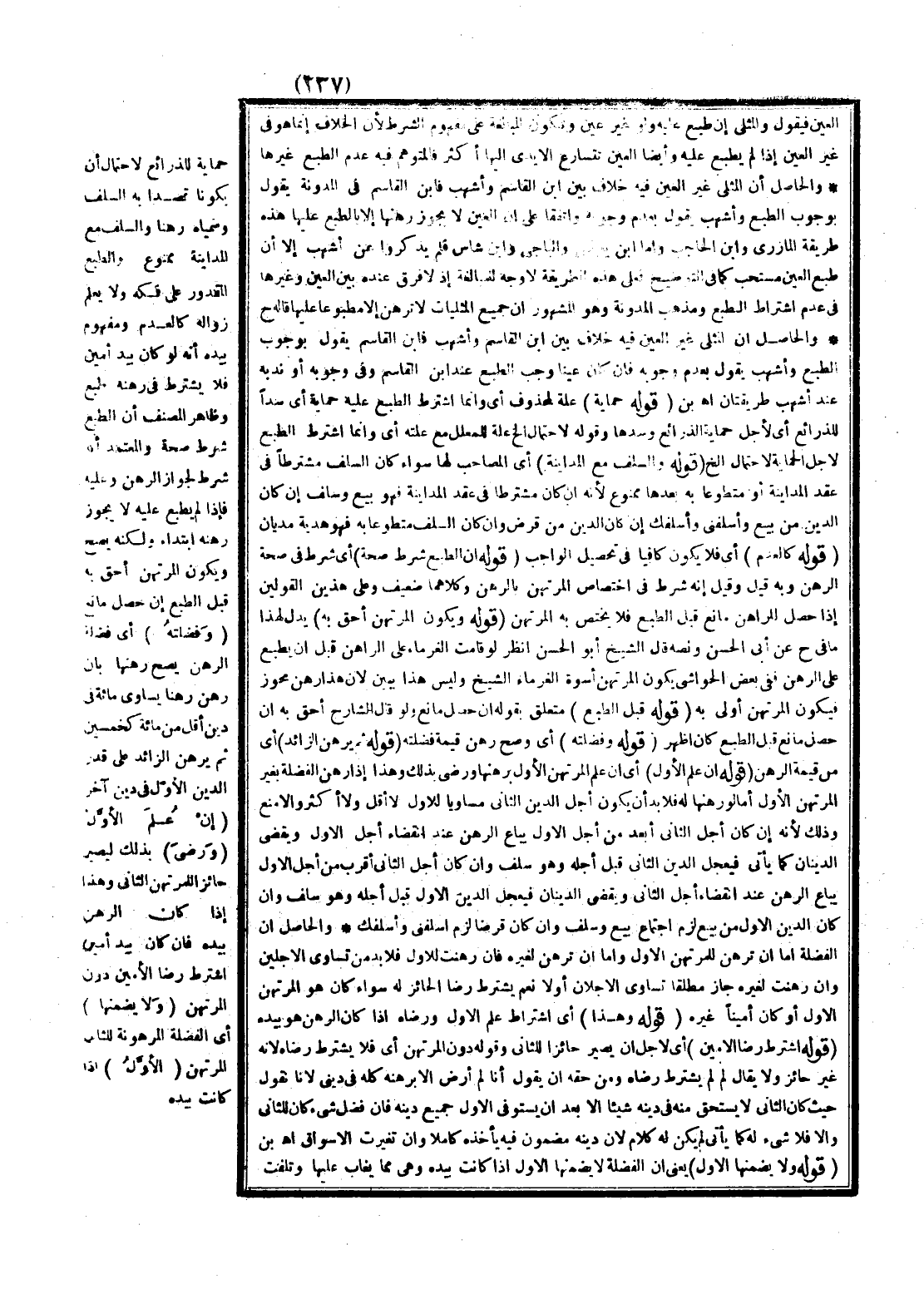 وَالْحَاصِلُ أَنَّ الْمِثْلِيَّ غَيْرُ الْعَيْنِ فِيهِ خِلَافٌ بَيْنَ ابْنِ الْقَاسِمِ وَأَشْهَبَ فَابْنُ الْقَاسِمِ يَقُولُ بِوُجُوبِ الطَّبْعِ وَأَشْهَبُ يَقُولُ بِعَدَمِ وُجُوبِهِ، فَإِنْ كَانَ عَيْنًا وَجَبَ الطَّبْعُ عِنْدَ ابْنِ الْقَاسِمِ وَفِي وُجُوبِهِ أَوْ نَدْبِهِ عِنْدَ أَشْهَبَ طَرِيقَتَانِ اهـ بْن (قَوْلُهُ حِمَايَةً) عِلَّةٌ لِمَحْذُوفٍ أَيْ وَإِنَّمَا اُشْتُرِطَ الطَّبْعُ عَلَيْهِ حِمَايَةً أَيْ سَدًّا لِلذَّرَائِعِ أَيْ لِأَجْلِ حِمَايَةِ الذَّرَائِعِ وَسَدِّهَا، وَقَوْلُهُ لِاحْتِمَالِ إلَخْ عِلَّةٌ لِلْمُعَلَّلِ مَعَ عِلَّتِهِ أَيْ، وَإِنَّمَا اُشْتُرِطَ الطَّبْعُ لِأَجْلِ الْحِمَايَةِ لِاحْتِمَالِ إلَخْ (قَوْلُهُ وَالسَّلَفُ مَعَ الْمُدَايَنَةِ) أَيْ الْمُصَاحِبِ لَهَا سَوَاءٌ كَانَ السَّلَفُ مُشْتَرَطًا فِي عَقْدِ الْمُدَايَنَةِ أَوْ مُتَطَوَّعًا بِهِ بَعْدَهَا مَمْنُوعٌ؛ لِأَنَّهُ إنْ كَانَ مُشْتَرَطًا فِي عَقْدِ الْمُدَايَنَةِ فَهُوَ بَيْعٌ وَسَلَفٌ إنْ كَانَ الدَّيْنُ مِنْ بَيْعٍ، وَأَسْلِفْنِي وَأُسْلِفُك إنْ كَانَ الدَّيْنُ مِنْ قَرْضٍ وَإِنْ كَانَ السَّلَفُ مُتَطَوَّعًا بِهِ فَهُوَ هَدِيَّةُ مِدْيَانٍ (قَوْلُهُ كَالْعَدَمِ) أَيْ فَلَا يَكُونُ كَافِيًا فِي تَحْصِيلِ الْوَاجِبِ (قَوْلُهُ إنَّ الطَّبْعَ شَرْطُ صِحَّةٍ) أَيْ شَرْطٌ فِي صِحَّةِ الرَّهْنِ وَبِهِ قِيلَ، وَقِيلَ إنَّهُ شَرْطٌ فِي اخْتِصَاصِ الْمُرْتَهِنِ بِالرَّهْنِ وَكِلَاهُمَا ضَعِيفٌ وَعَلَى هَذَيْنِ الْقَوْلَيْنِ إذَا حَصَلَ لِلرَّاهِنِ مَانِعٌ قَبْلَ الطَّبْعِ فَلَا يَخْتَصُّ بِهِ الْمُرْتَهِنُ (قَوْلُهُ وَيَكُونُ الْمُرْتَهِنُ أَحَقَّ بِهِ) يَدُلُّ لِهَذَا مَا فِي ح عَنْ أَبِي الْحَسَنِ وَنَصُّهُ قَالَ الشَّيْخُ أَبُو الْحَسَنِ اُنْظُرْ لَوْ قَامَتْ الْغُرَمَاءُ عَلَى الرَّاهِنِ قَبْلَ أَنْ يُطْبَعَ عَلَى الرَّهْنِ فَفِي بَعْضِ الْحَوَاشِي يَكُونُ الْمُرْتَهِنُ أُسْوَةَ الْغُرَمَاءِ الشَّيْخِ وَلَيْسَ هَذَا بِبَيِّنٍ؛ لِأَنَّ هَذَا رَهْنٌ مَحُوزٌ فَيَكُونُ الْمُرْتَهِنُ أَوْلَى بِهِ.