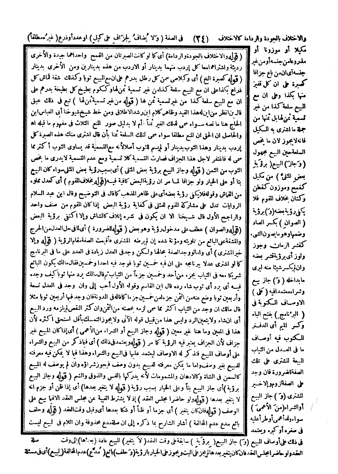 (قَوْلُهُ: وَجَازَ الْبَيْعُ بِرُؤْيَةِ بَعْضِ الْمِثْلِيِّ) أَيْ بِسَبَبِ رُؤْيَةِ بَعْضِ الْمِثْلِيِّ سَوَاءٌ كَانَ الْبَيْعُ بَتًّا أَوْ عَلَى الْخِيَارِ وَلَوْ جُزَافًا لِمَا مَرَّ أَنَّ رُؤْيَةَ الْبَعْضِ كَافِيَةٌ فِيهِ (قَوْلُهُ: بِخِلَافِ الْمُقَوَّمِ) أَيْ كَعَدْلٍ مَمْلُوءٍ مِنْ الْقُمَاشِ وَقَوْلُهُ: فَلَا يَكْفِي رُؤْيَةُ بَعْضِهِ أَيْ عَلَى ظَاهِرِ الْمَذْهَبِ كَمَا قَالَ فِي التَّوْضِيحِ وَقَالَ ابْنُ عَبْدِ السَّلَامِ: الرِّوَايَاتُ تَدُلُّ عَلَى مُشَارَكَةِ الْمُقَوَّمِ لَلْمِثْلِيِّ فِي كِفَايَةِ رُؤْيَةِ الْبَعْضِ إذَا كَانَ الْمُقَوِّمُ مِنْ صِنْفٍ وَاحِدٍ وَالرَّاجِحُ الْأَوَّلُ قَالَ شَيْخُنَا: إلَّا أَنْ يَكُونَ فِي نَشْرِهِ إتْلَافٌ كَالشَّاشِ وَإِلَّا اكْتَفَى بِرُؤْيَةِ الْبَعْضِ.